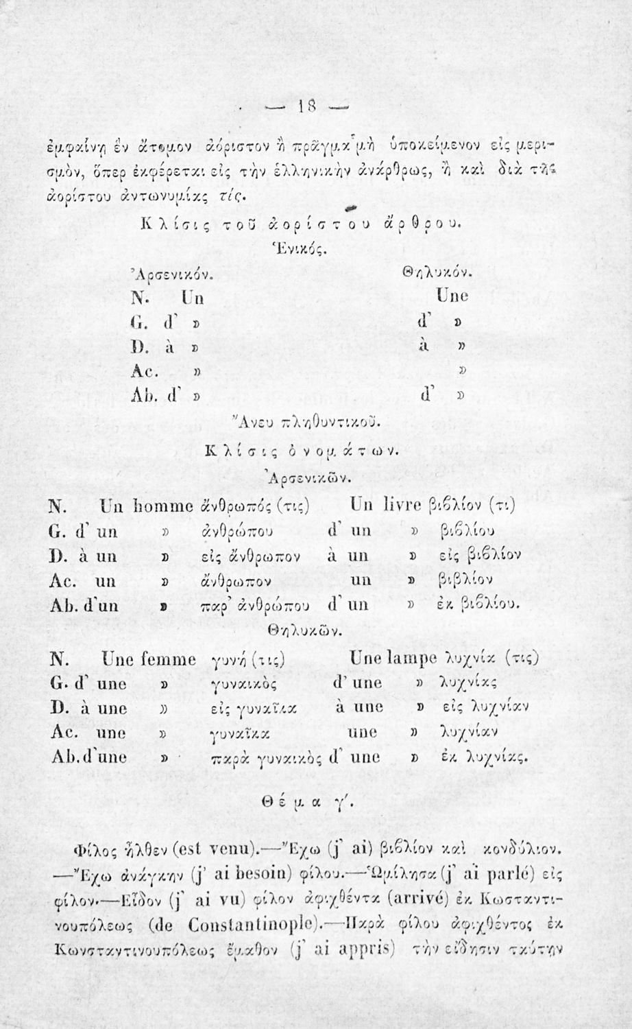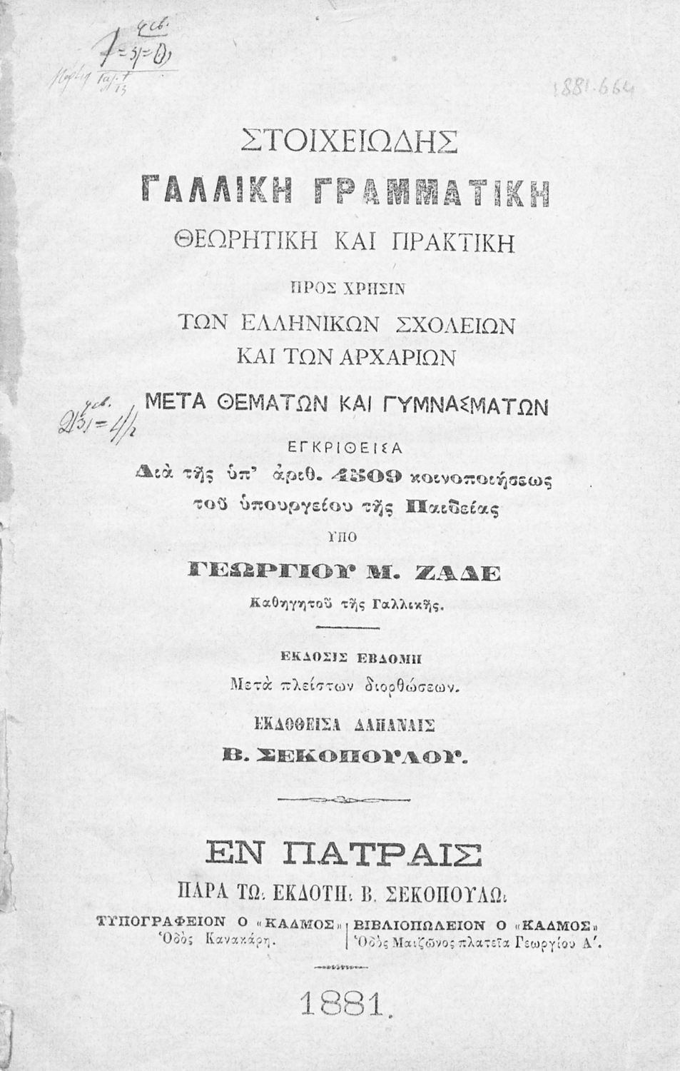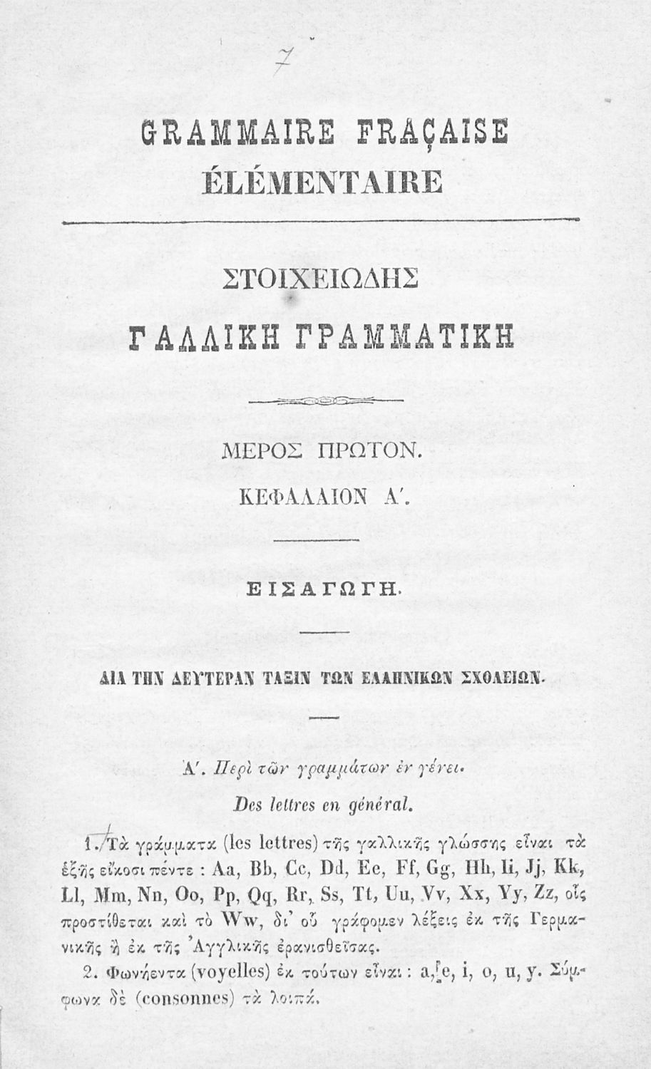 Στοιχειώδης γαλλική γραμματική θεωρητική και πρακτική, προς χρήσιν των Ελληνικών Σχολείων και των αρχαρίων, μετά θεμάτων και εκγυμνασμάτων