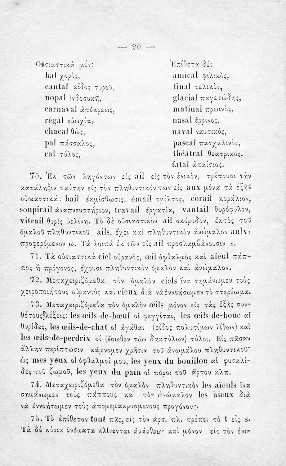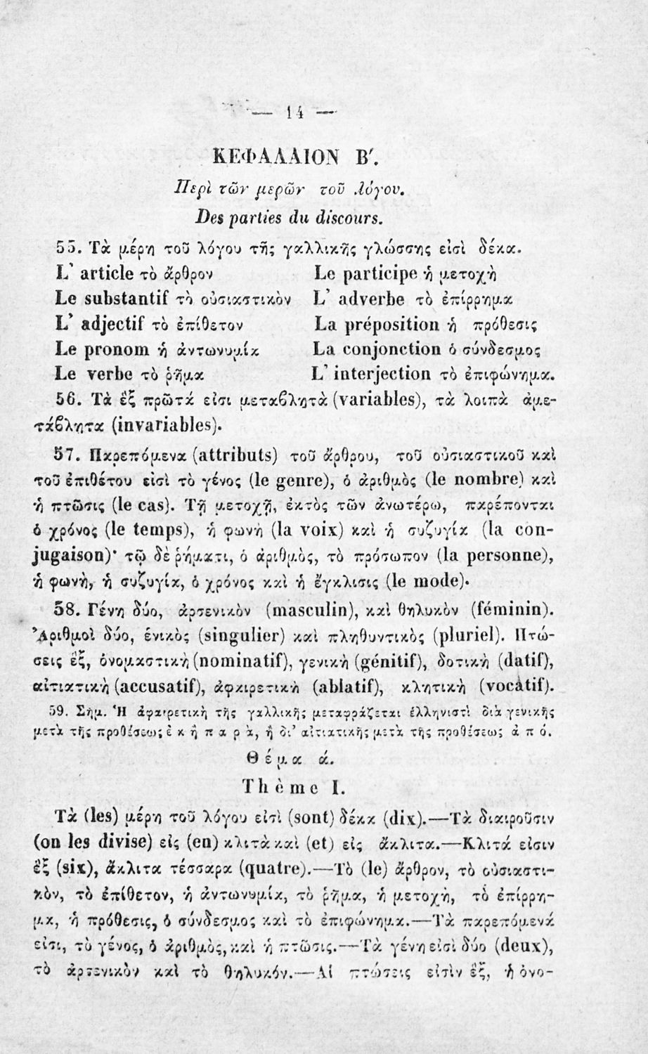Γραμματική της Γαλλικής γλώσσας για τα Ελληνικά Σχολεία και Παρθεναγωγεία που αναλύει τα μέρη του λόγου και περιέχει παραδείγματα και ασκήσεις.