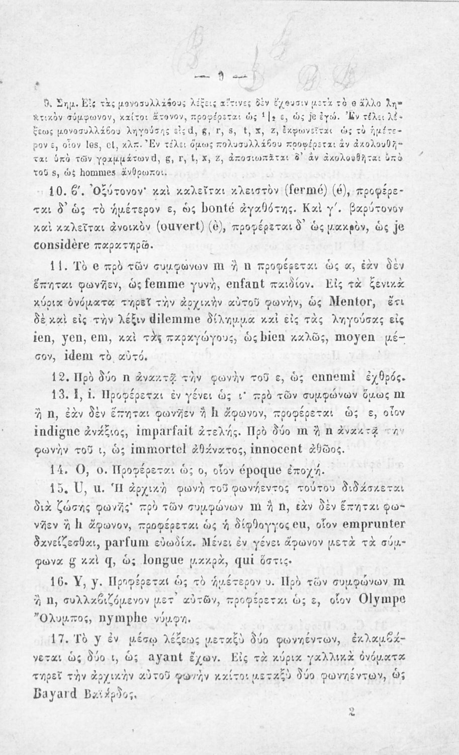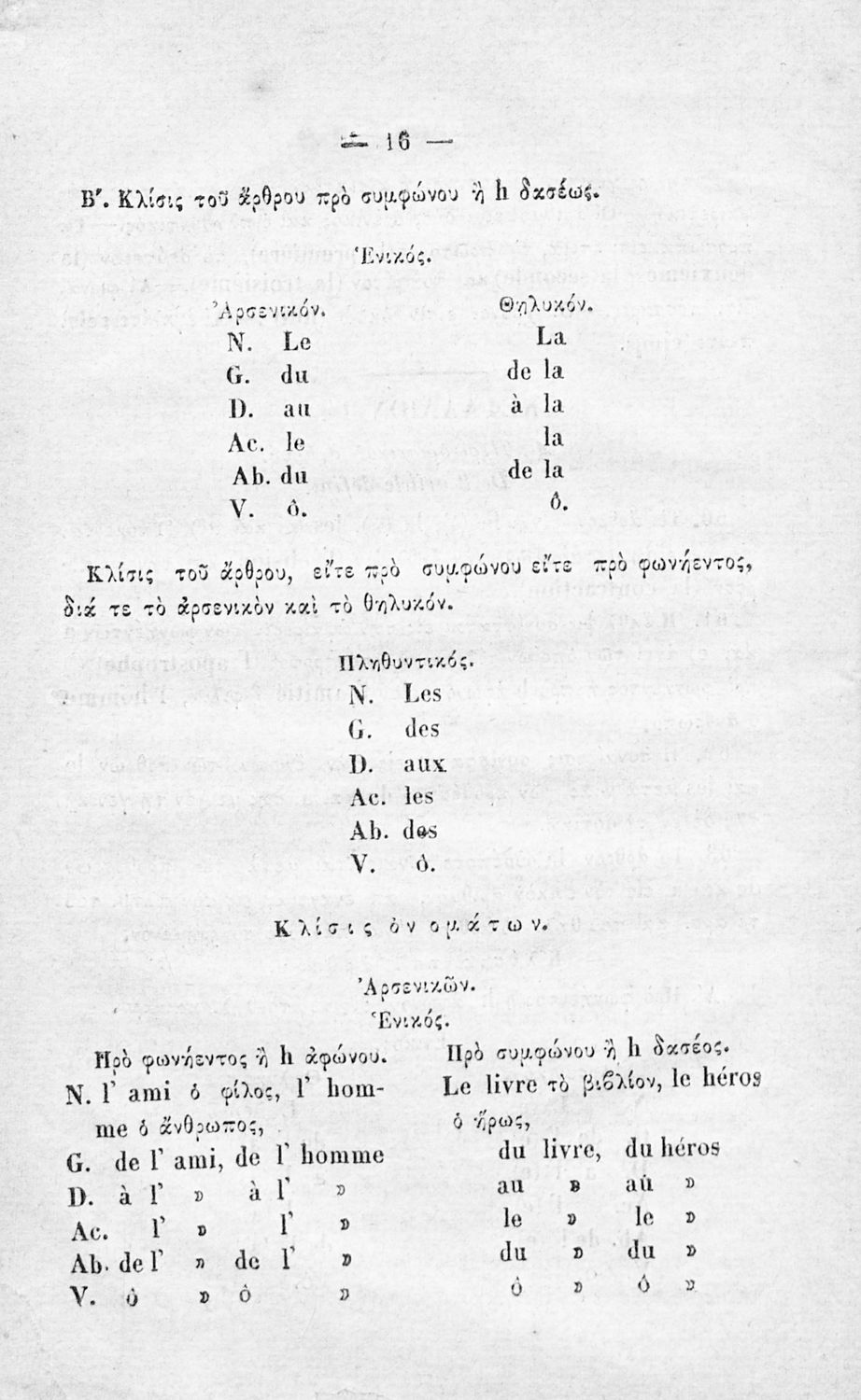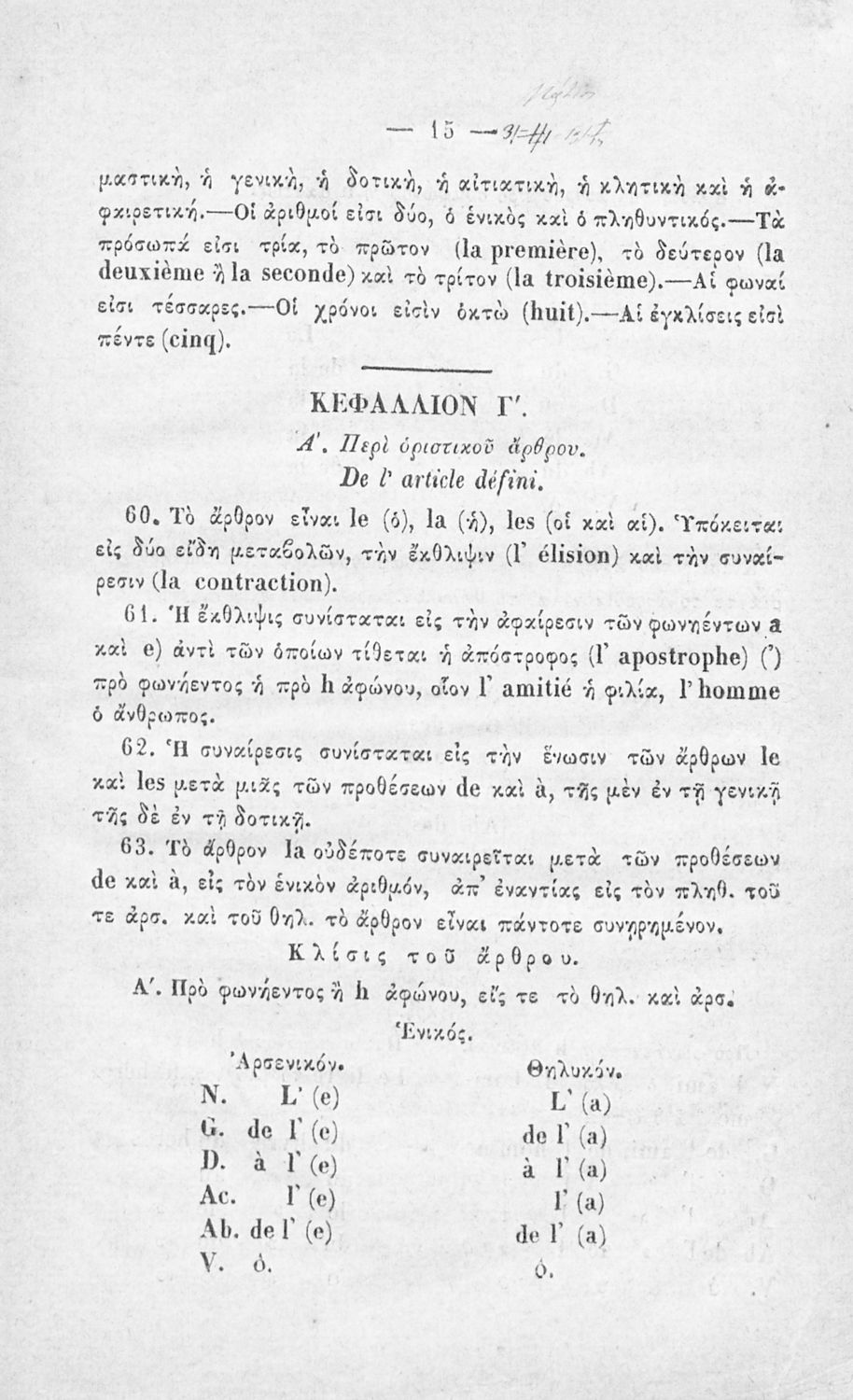 Σχολικό εγχειρίδιο για τα Ελληνικά Σχολεία και Παρθεναγωγεία περιλαμβάνει τους βασικούς κανόνες γραμματικής της γαλλικής γλώσσας.