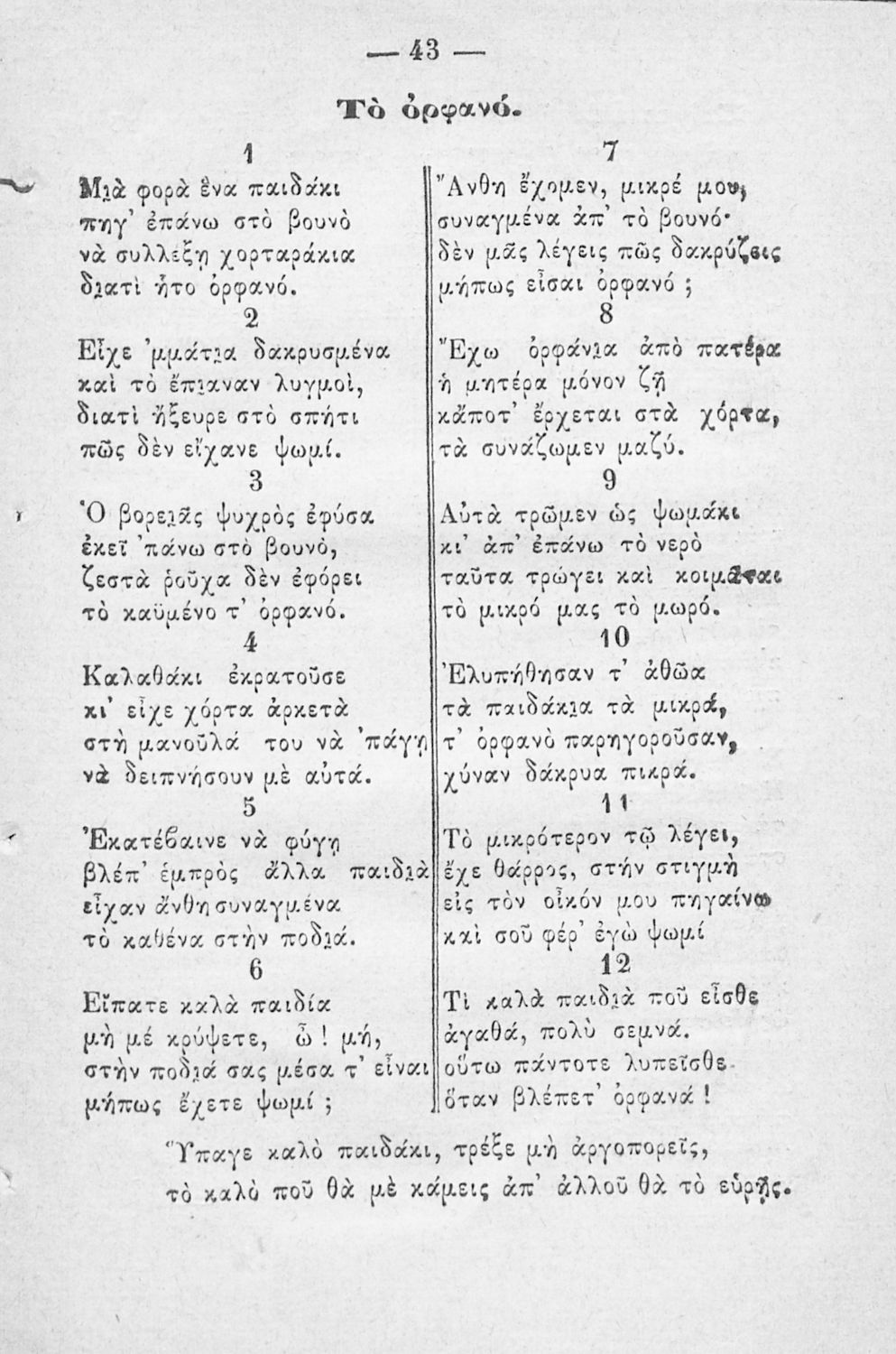 Βαθμίδα εκπαίδευσης: Πρωτοβάθμια Γλώσσα: Καθαρεύουσα Παρουσίαση περιεχομένου: Αναγνωστικό για τους μαθητές του Δημοτικού και Νηπιαγωγείου το οποίο περιλαμβάνει σειρά παιδικών ποιημάτων εμπνευσμένα από τον οικογενειακό και κοινωνικό βίο. |
