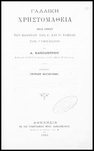 Κωδικός αναγνώρισης: 02-02681 Τίτλος: Γαλλική χρηστομάθεια, προς χρήσιν των μαθητών της Α΄ και Β΄ τάξεως των Γυμνασίων Συγγραφέας: Ανδρέας Καποδίστριας Μέγεθος και υπόστρωμα: Σχολικό εγχειρίδιο, μαλακό εξώφυλλο, 88 σελίδες. |