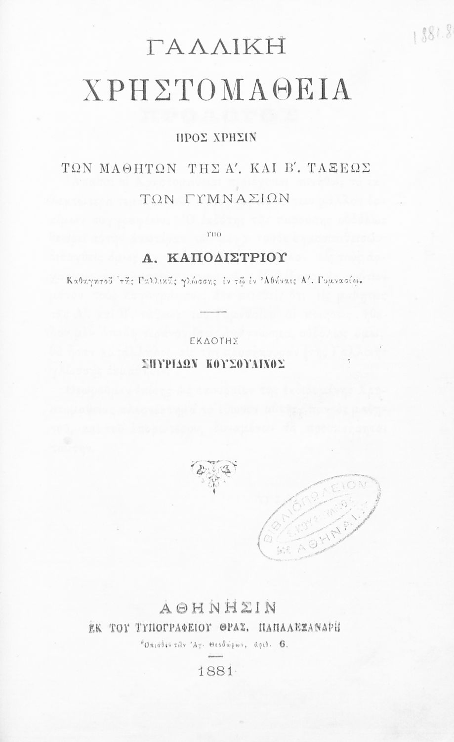 Εκδότης: Σπυρίδων Κουσουλίνος Έτος έκδοσης: 1881 Τόπος έκδοσης: Αθήνα |