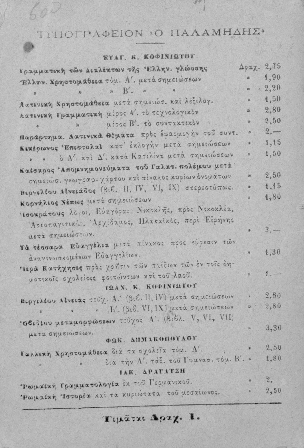 Σχολικό εγχειρίδιο Αρχαίων Ελληνικών για τα Ιερατικά Σχολεία. Ο τόμος περιέχει: «Γραμματικάς γυμνάσεις, Μύθους του Αισώπου και Φιλοσόφων ανέκδοτα, εκ των λόγων του θείου Χρυσόστομου τους περί προσευχής και τον