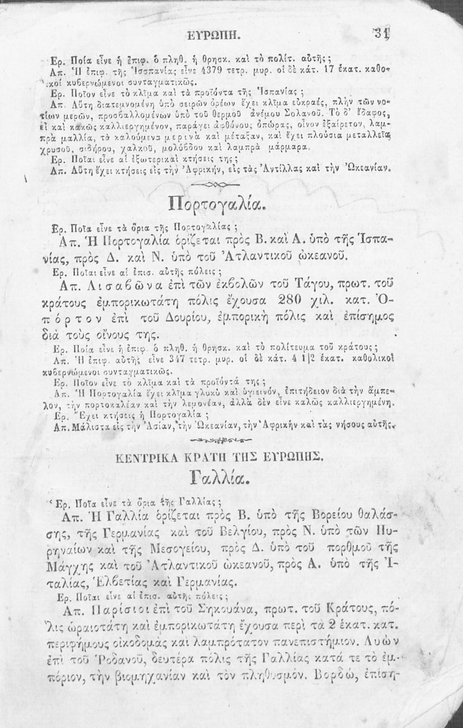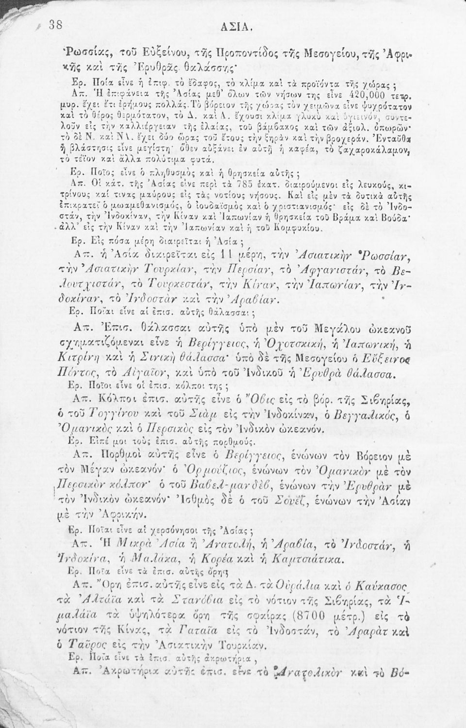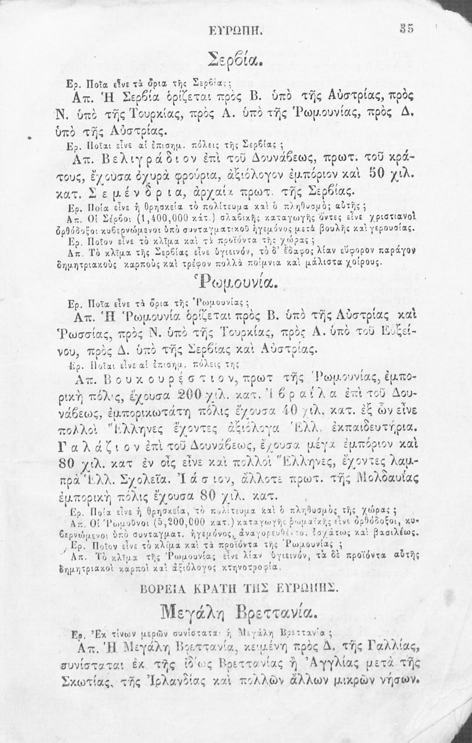 Σχολικό εγχειρίδιο Γεωγραφίας για τα Ελληνικά Σχολεία που περιλαμβάνει εισαγωγή στις βασικές έννοιες και ορισμούς της επιστήμης, και στοιχεία μαθηματικής, φυσικής και πολιτικής γεωγραφίας των πέντε ηπείρων.