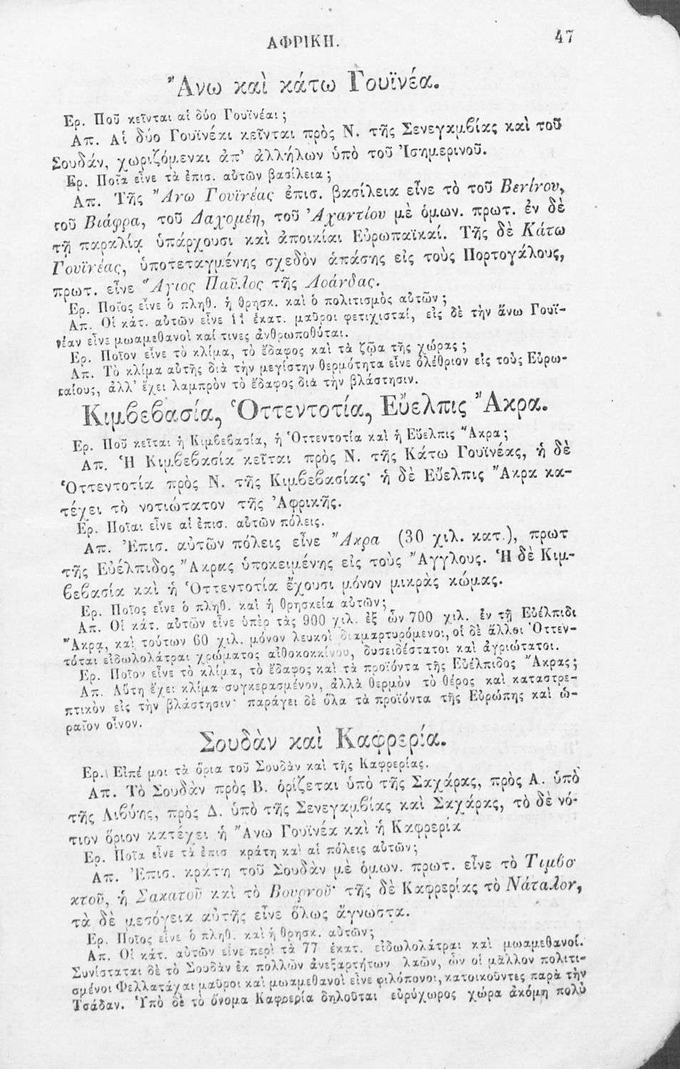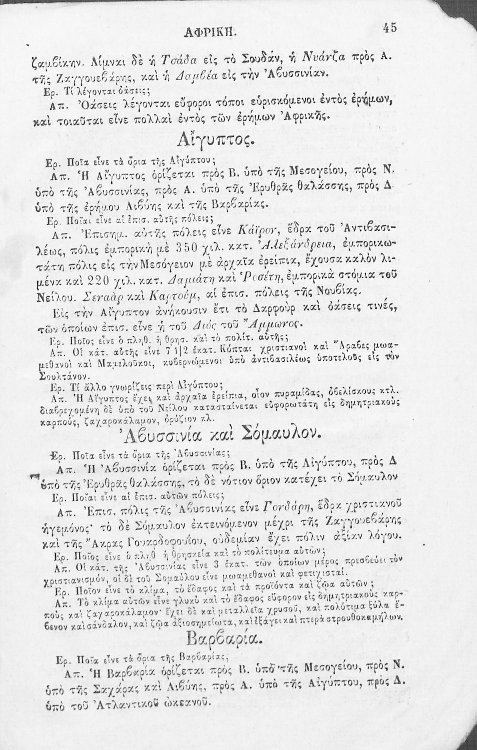 Σχολικό εγχειρίδιο Γεωγραφίας για τα Ελληνικά Σχολεία που περιλαμβάνει εισαγωγή στις βασικές έννοιες και ορισμούς της επιστήμης, και στοιχεία μαθηματικής, φυσικής και πολιτικής γεωγραφίας των πέντε ηπείρων.