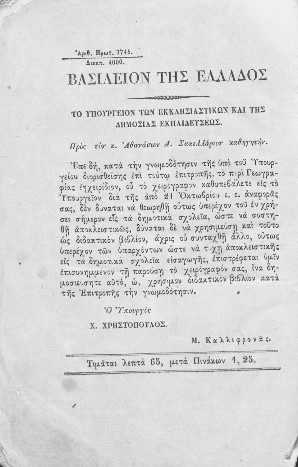 Εκδότης: Π. Δ. Σακελλαρίου Έτος έκδοσης: 1881 Τόπος έκδοσης: Αθήνα Έκδοση: 15η Υπουργική απόφαση / Σύμβαση: 7744/ |