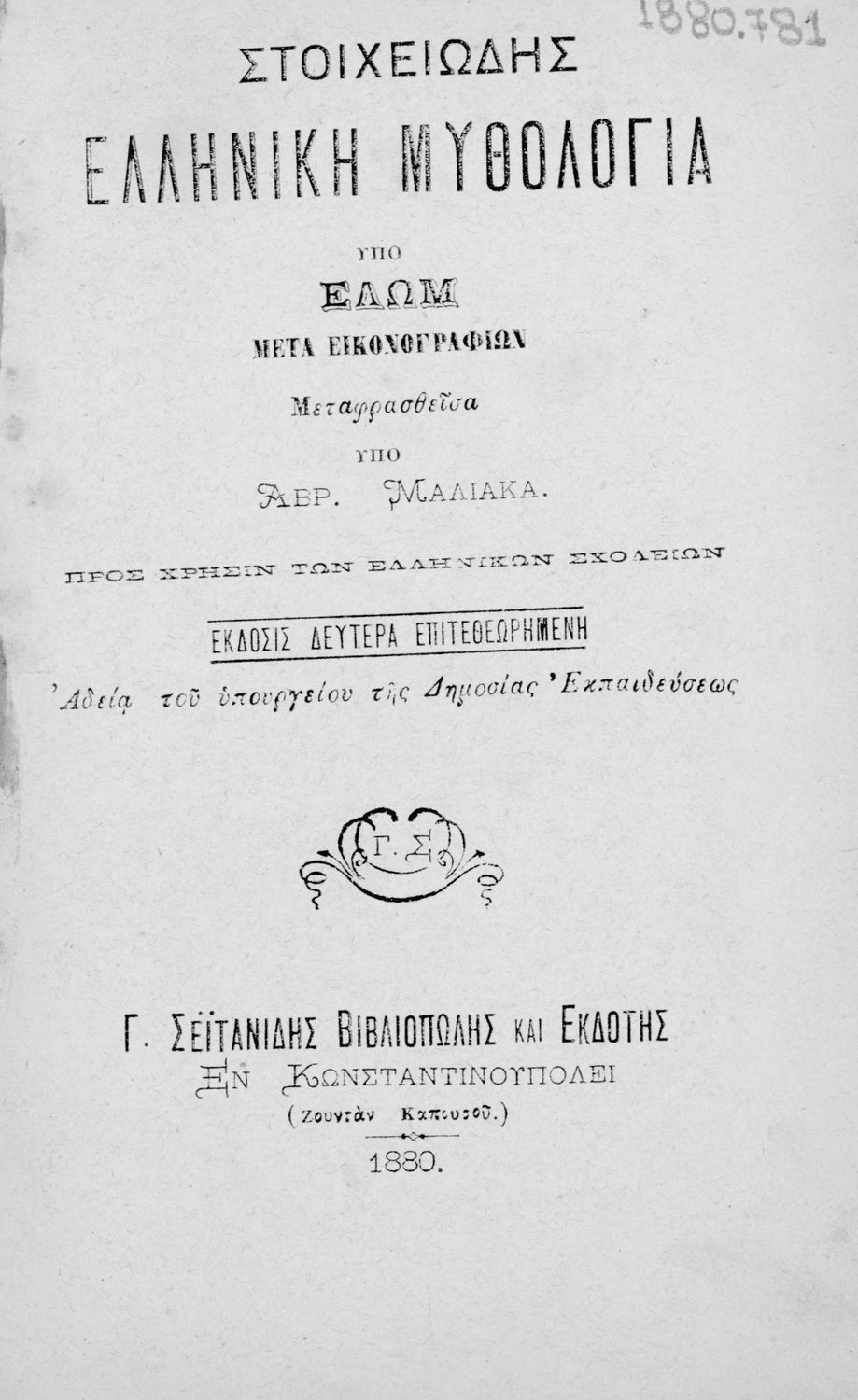 Τίτλος: Στοιχειώδης ελληνική μυθολογία μετά εικονογραφιών προς χρήσιν των Ελληνικών Σχολείων