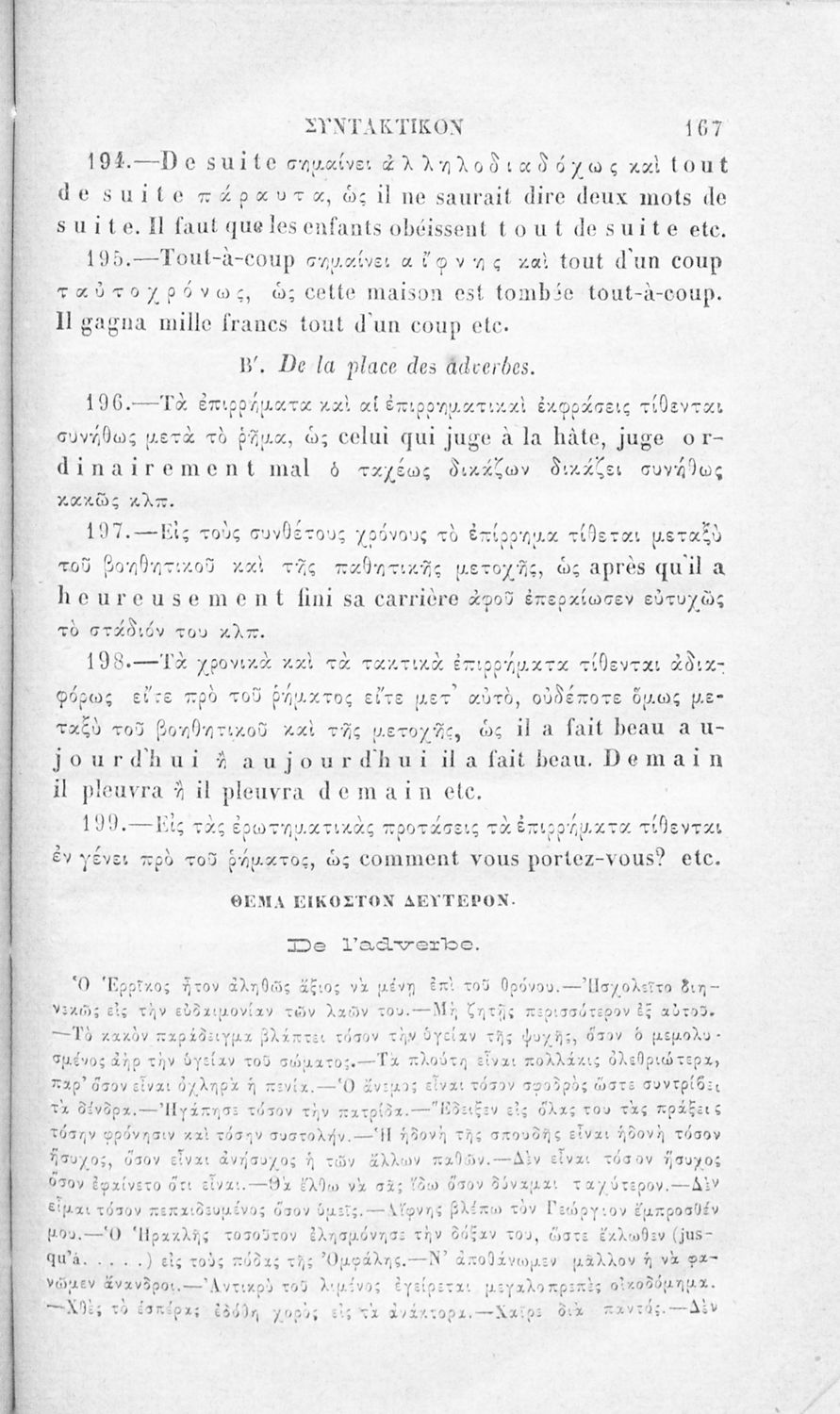 Σχολικό εγχειρίδιο για τις τάξεις των Γυμνασίων, Αστικών σχολείων, Παρθεναγωγείων, Διδασκαλεία και Εμπορικές σχολές. Το βιβλίο περιλαμβάνει ασκήσεις γραμματικής, συντακτικού και λεξιλογίου για πρακτική ...