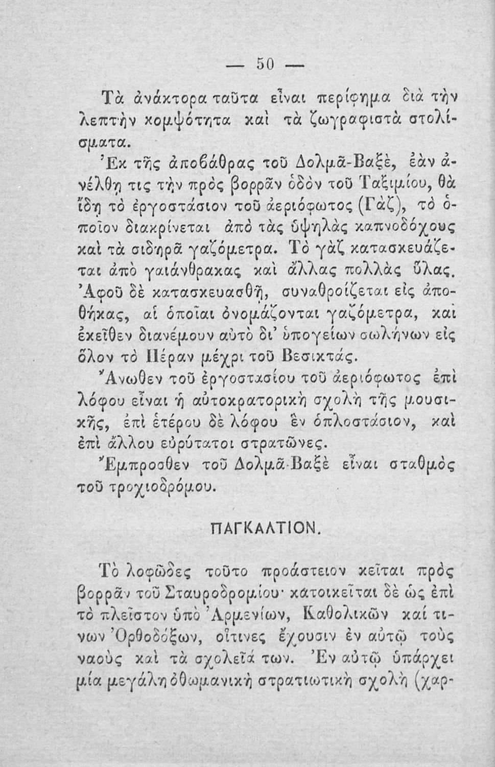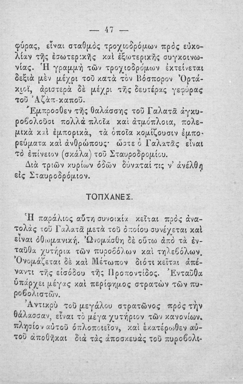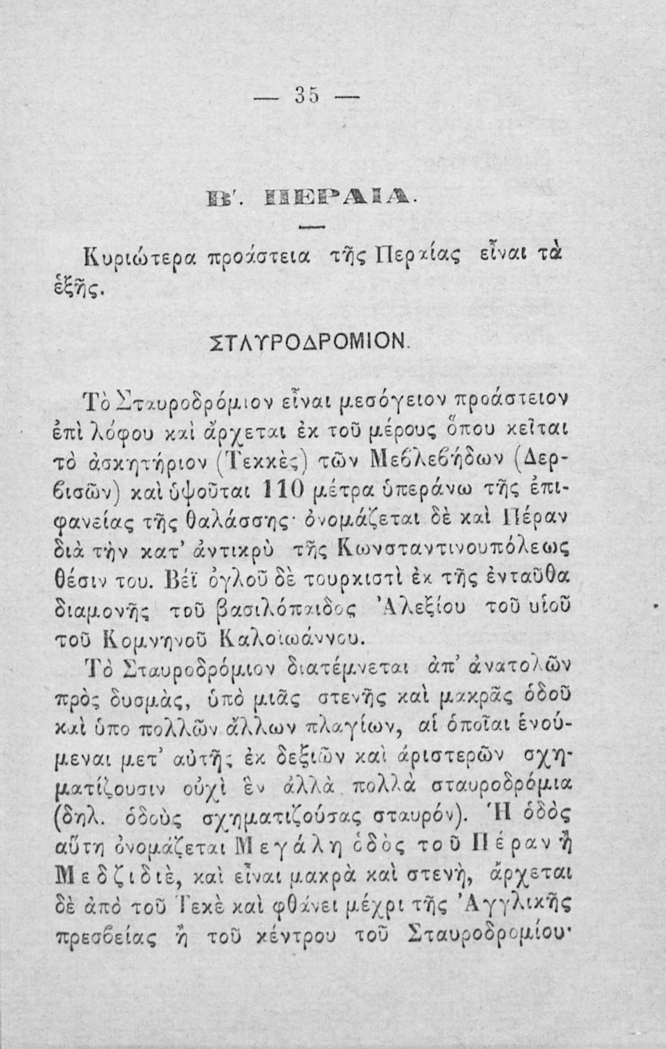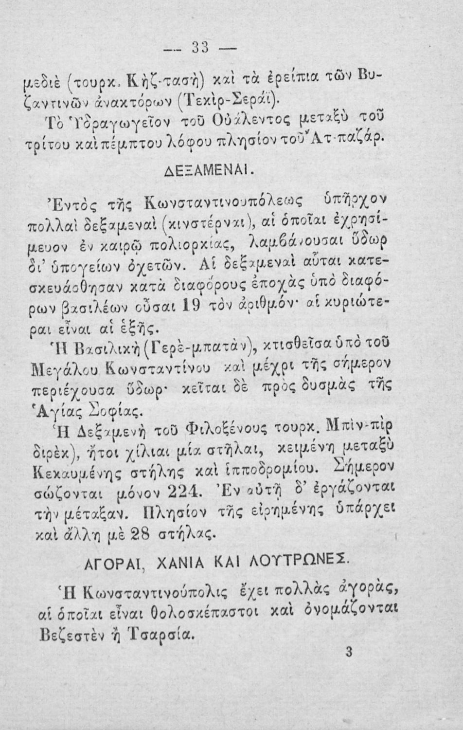 Σχολικό εγχειρίδιο Γεωγραφίας για τους μαθητές των Αστικών σχολείων της Κωνσταντινούπολης που εξετάζει το ιστορικό και γεωμορφολογικό προφίλ της Κωνσταντινούπολης. Περιέχει και στοιχεία οικονομικής γεωγραφίας.