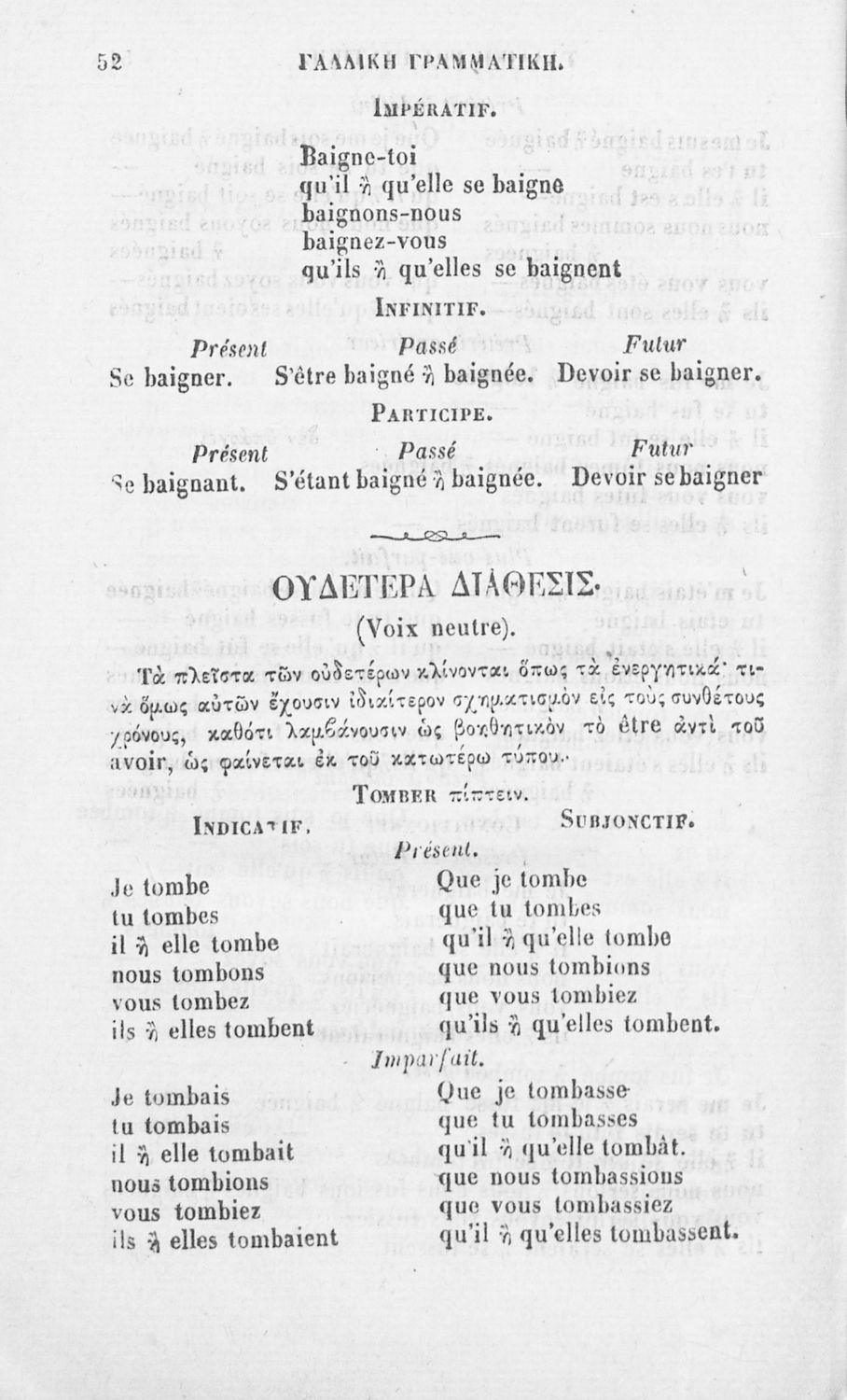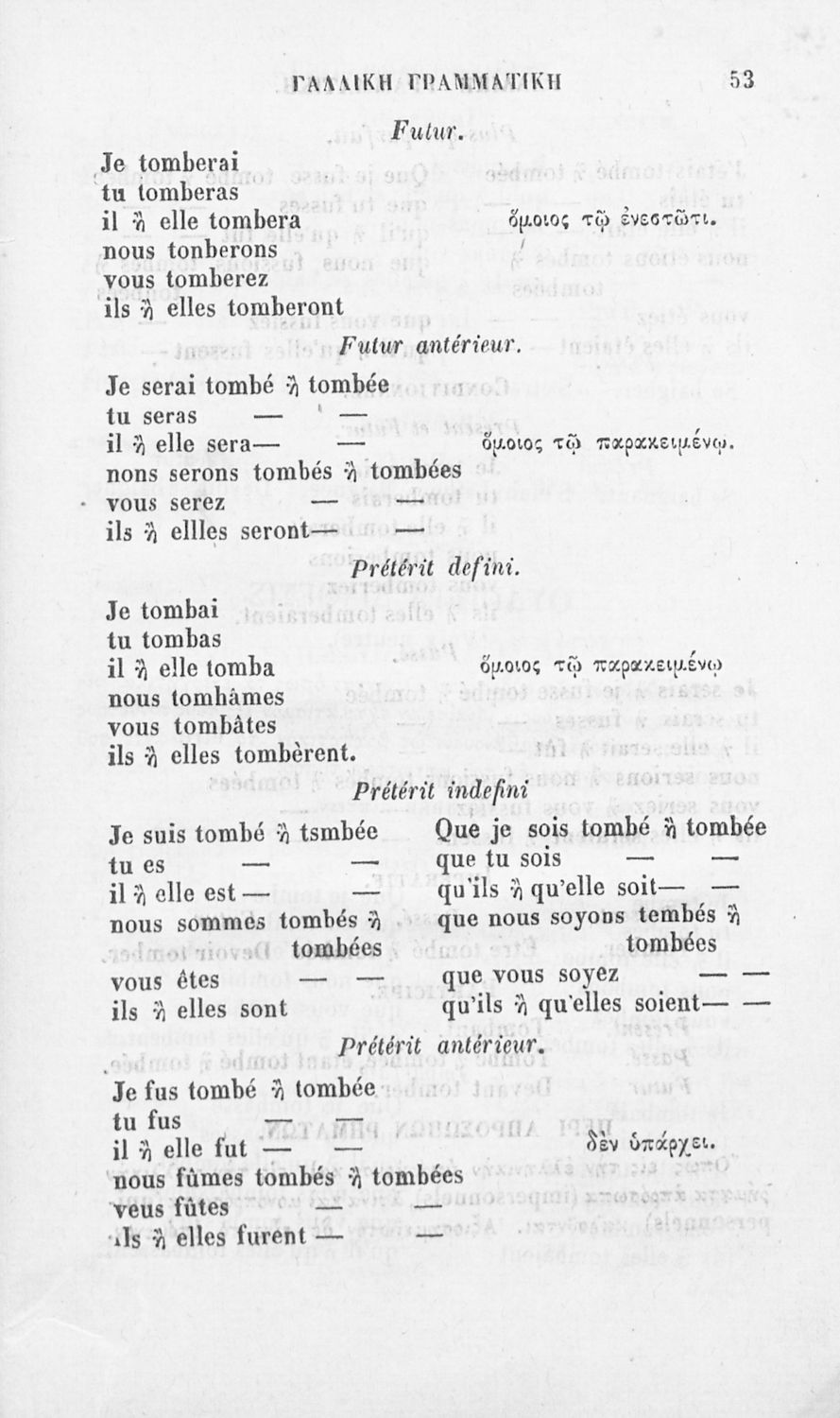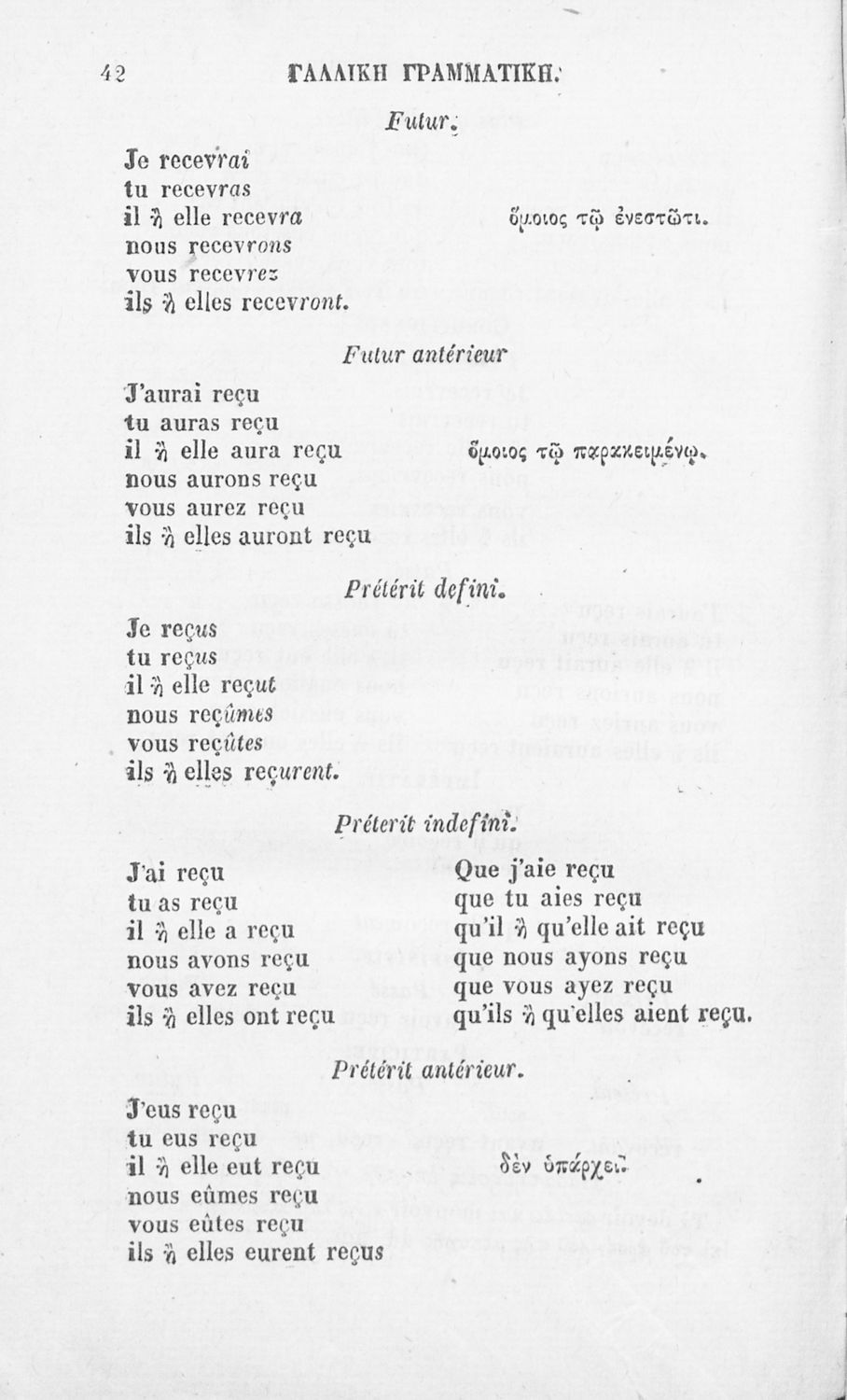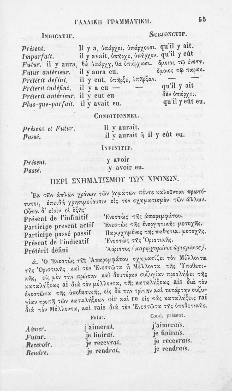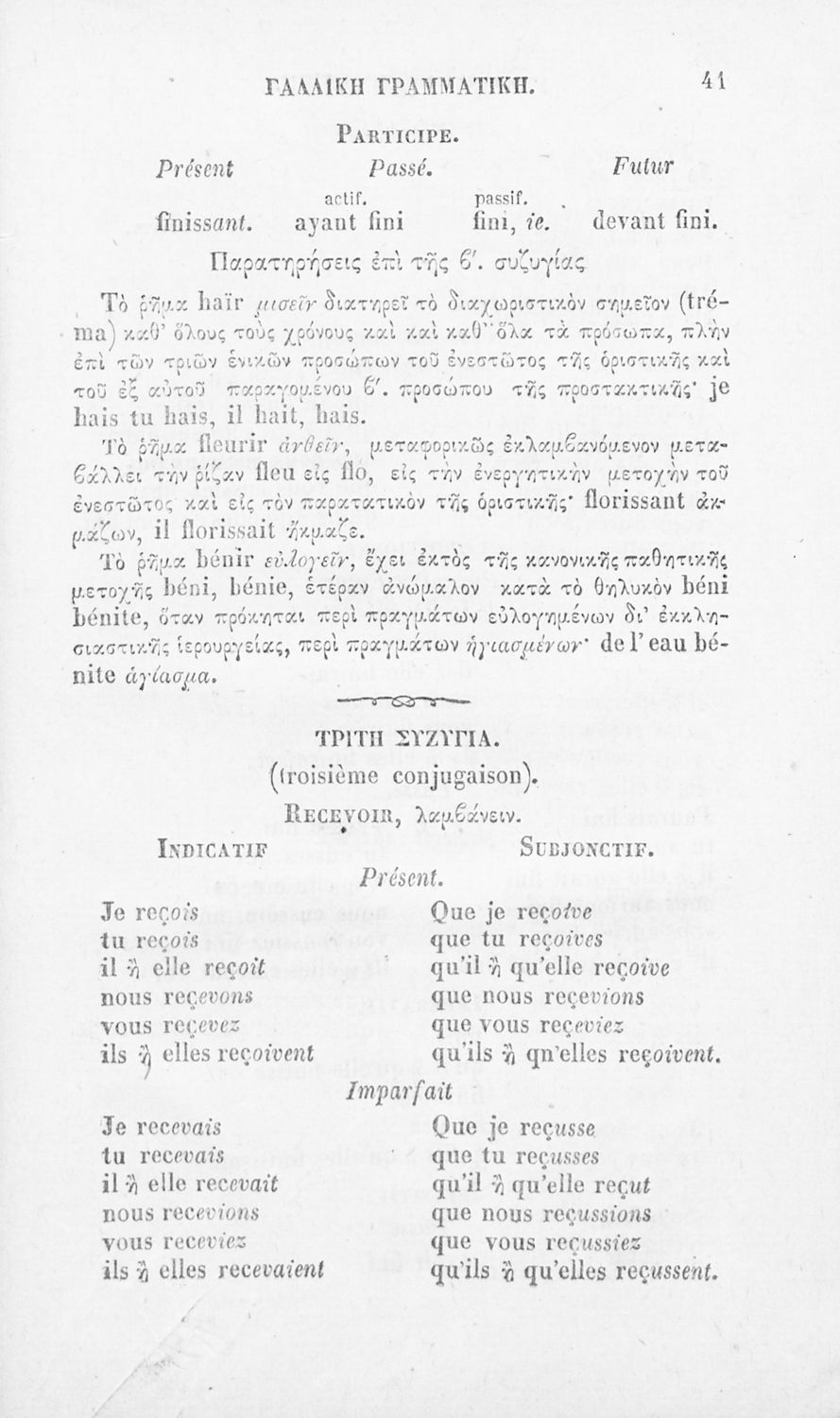 Σχολικό εγχειρίδιο για τα Ελληνικά Σχολεία και Παρθεναγωγεία περιλαμβάνει τους βασικούς κανόνες γραμματικής της γαλλικής γλώσσας.