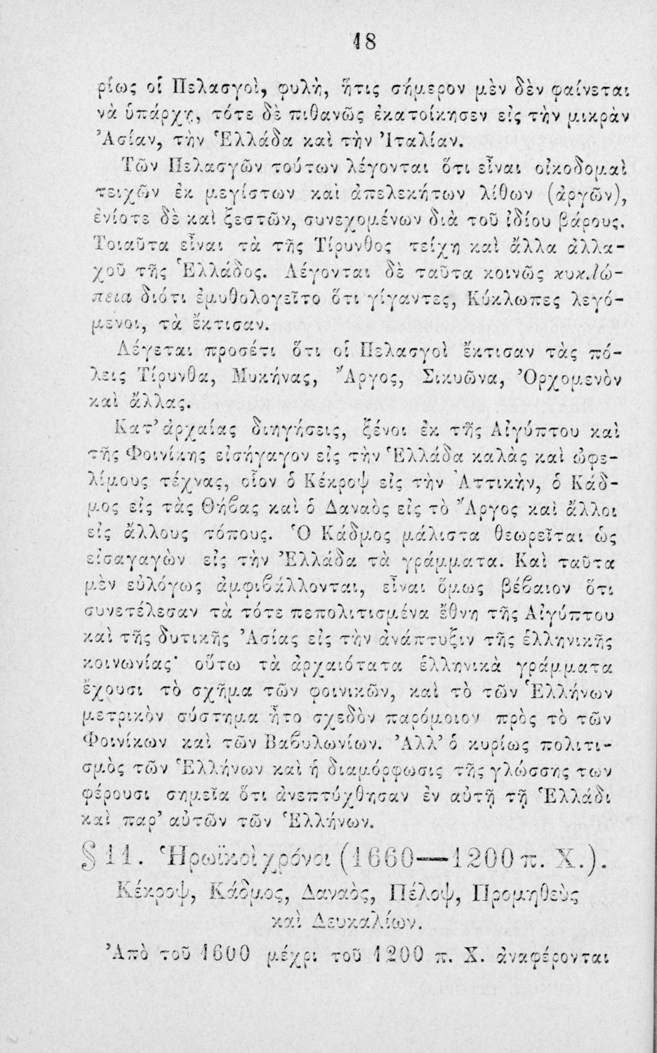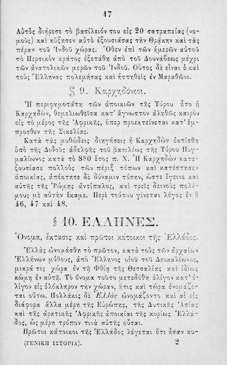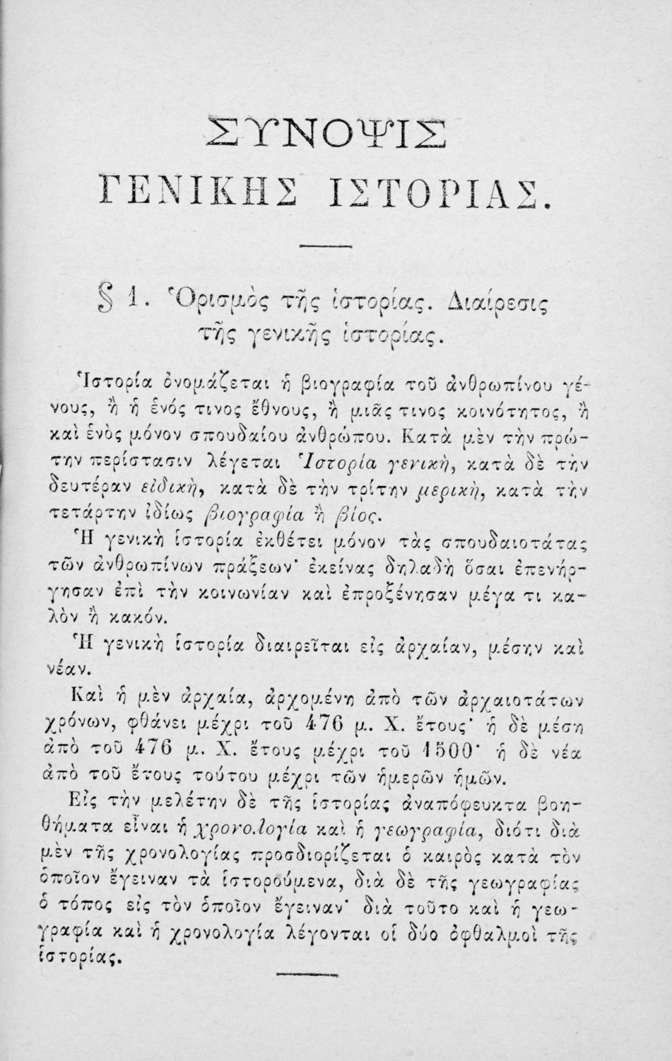 Βαθμίδα εκπαίδευσης: Δευτεροβάθμια Τάξη: Ελληνικό Σχολείο Μάθημα: Ιστορία Γλώσσα: Καθαρεύουσα Παρουσίαση περιεχομένου: Σχολικό εγχειρίδιο για τις τάξεις του Ελληνικού για το μάθημα της Ιστορίας. Το εγχειρίδιο περιλαμβάνει εισαγωγικά τον ορισμό της γενικής ιστορίας και συνεχίζει την καταγραφή και παρουσίαση των γεγονότων με την ιστορία των αρχαίων ανατολικών λαών, την εμφάνιση των πρώτων Ελλήνων, την ιστορία των μυθικών χρόνων, τους Τρωικούς και Περσικούς πολέμους, την ακμή και αίγλη της Αθήνας του Περικλή, την ηγεμονία της Σπάρτης και της Θήβας, την Μακεδονική Ηγεμονία του Φιλίππου και την συνέχεια του Αλεξάνδρου και των διαδόχων, την υποταγή των Ελλήνων στους Ρωμαίους και συνεχίζει συνοπτικά με την ιστορία της Ευρώπης μέχρι και την Γαλλική και Ελληνική Επανάσταση. |