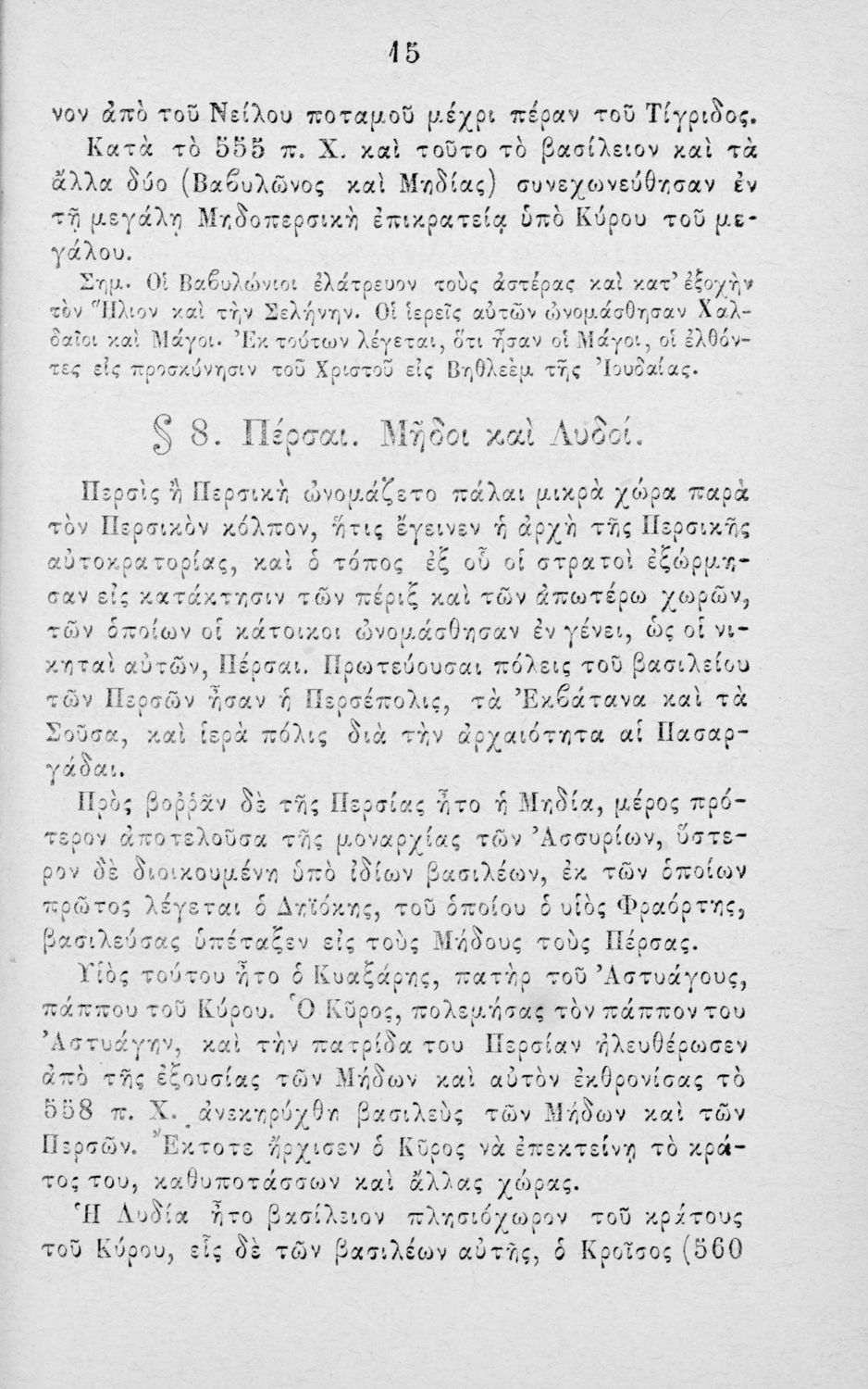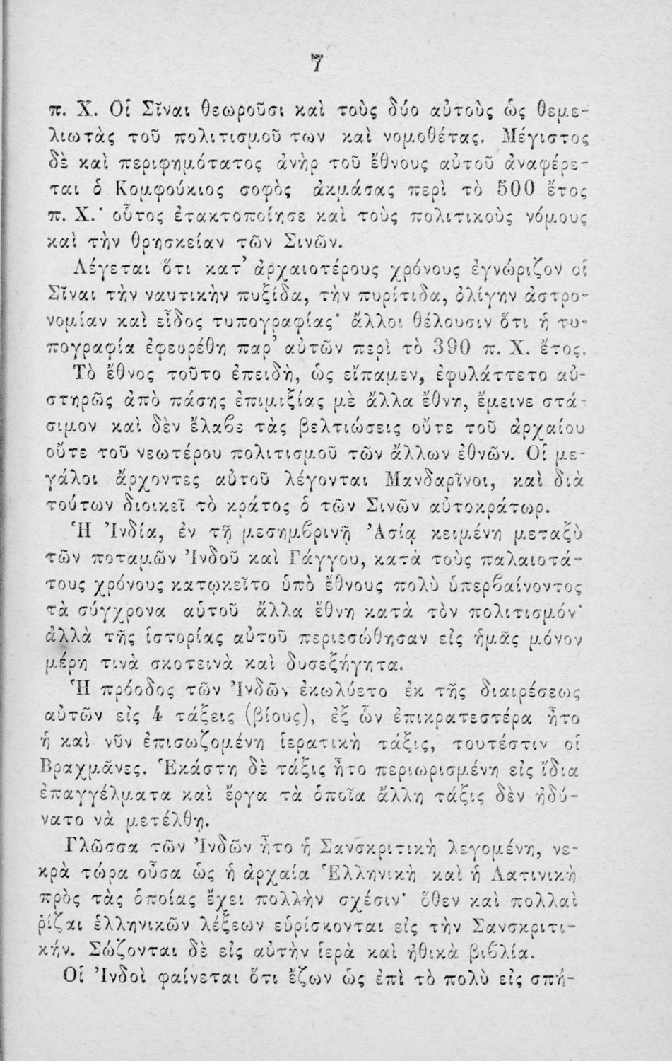 LDR 02303 2200217 4500 035 ## _a02-02721 040 ## _aΕλληνικό Λογοτεχνικό και Ιστορικό Αρχείο 041 ## _ael 100 ## _aΔ. Πανταζής 110 ## _a2721 245 0# _aΣύνοψις γενικής ιστορίας εκτενεστέραν την ελληνικήν περιέχουσα συναρμολογηθείσα προς χρήσιν των μαθητών των Ελληνικών Σχολείων 250 ## _a10η Έκδοση 260 ## _aΑθήνα _bΣ. Κ. Βλαστός _c1880 300 ## _a284 _bΣκίτσα (ασπρόμαυρα), Χάρτες (ασπρόμαυροι) 520 ## _aΣχολικό εγχειρίδιο για τις τάξεις του Ελληνικού για το μάθημα της Ιστορίας. Το εγχειρίδιο περιλαμβάνει εισαγωγικά τον ορισμό της γενικής ιστορίας και συνεχίζει την καταγραφή και παρουσίαση των γεγονότων με την ιστορία των αρχαίων ανατολικών λαών, την εμφάνιση των πρώτων Ελλήνων, την ιστορία των μυθικών χρόνων, τους Τρωικούς και Περσικούς πολέμους, την ακμή και αίγλη της Αθήνας του Περικλή, την ηγεμονία της Σπάρτης και της Θήβας, την Μακεδονική Ηγεμονία του Φιλίππου και την συνέχεια του Αλεξάνδρου και των διαδόχων, την υποταγή των Ελλήνων στους Ρωμαίους και συνεχίζει συνοπτικά με την ιστορία της Ευρώπης μέχρι και την Γαλλική και Ελληνική Επανάσταση. 521 ## _aΕλληνικό Σχολείο 522 ## _aΕλλάδα 546 ## _aΚαθαρεύουσα 563 ## _aΣκληρό Εξώφυλλο 583 ## _a2038/ 24-4-1862 _c1862 650 #4 _aΑρχαία ελληνική ιστορία _aΓαλλική και Ελληνική Επανάσταση _aΕυρωπαϊκή ιστορία _aΙστορία των ανατολικών εθνών