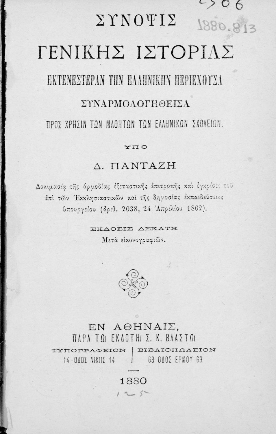 Κωδικός αναγνώρισης: 02-02721 Τίτλος: Σύνοψις γενικής ιστορίας εκτενεστέραν την ελληνικήν περιέχουσα συναρμολογηθείσα προς χρήσιν των μαθητών των Ελληνικών Σχολείων Συγγραφέας: Δ. Πανταζής Μέγεθος και υπόστρωμα: Σχολικό εγχειρίδιο, σκληρό εξώφυλλο, 284 σελίδες. Σκίτσα (ασπρόμαυρα), χάρτες (ασπρόμαυροι). |