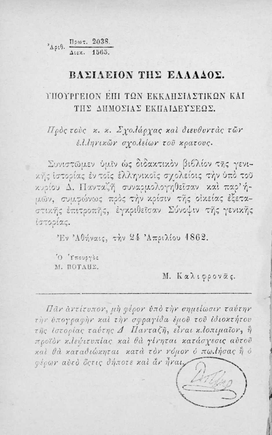 Εκδότης: Σ. Κ. Βλαστός Έτος έκδοσης: 1880 Τόπος έκδοσης: Αθήνα Έκδοση: 10η Υπουργική απόφαση / Σύμβαση: 2038/ 24-4-1862 Έτος έγκρισης: 1862 |