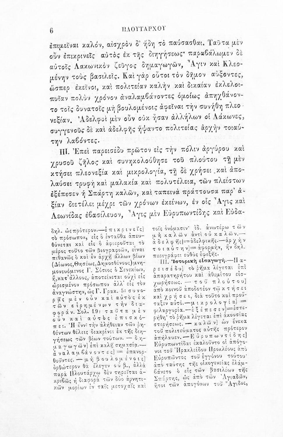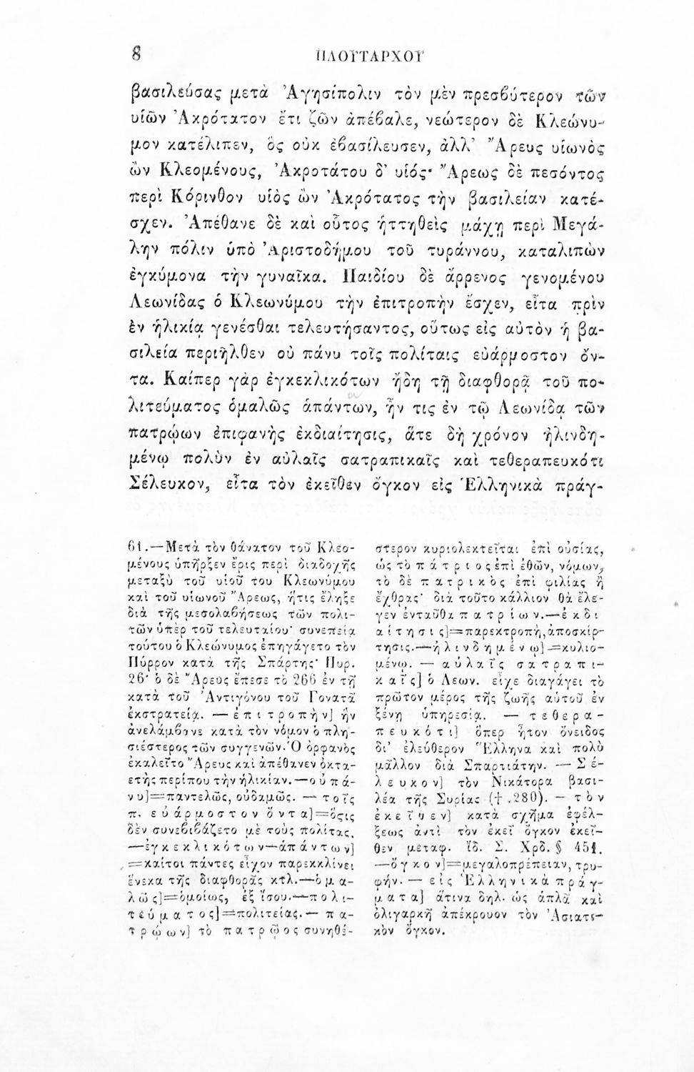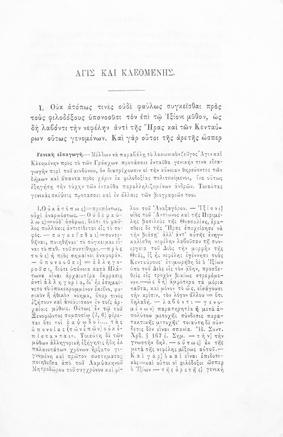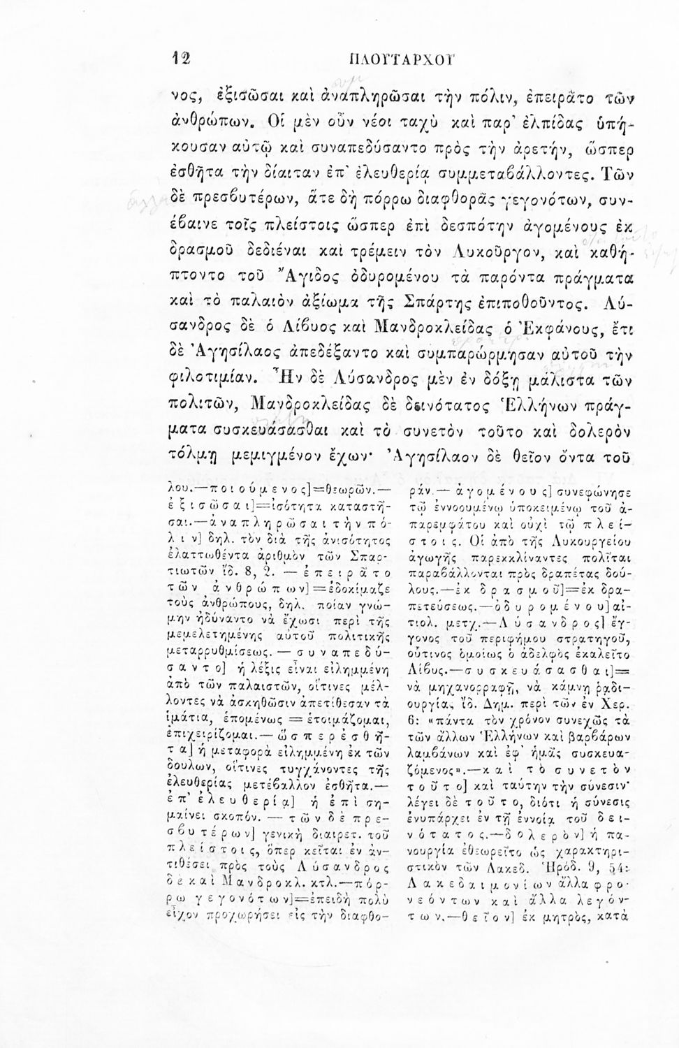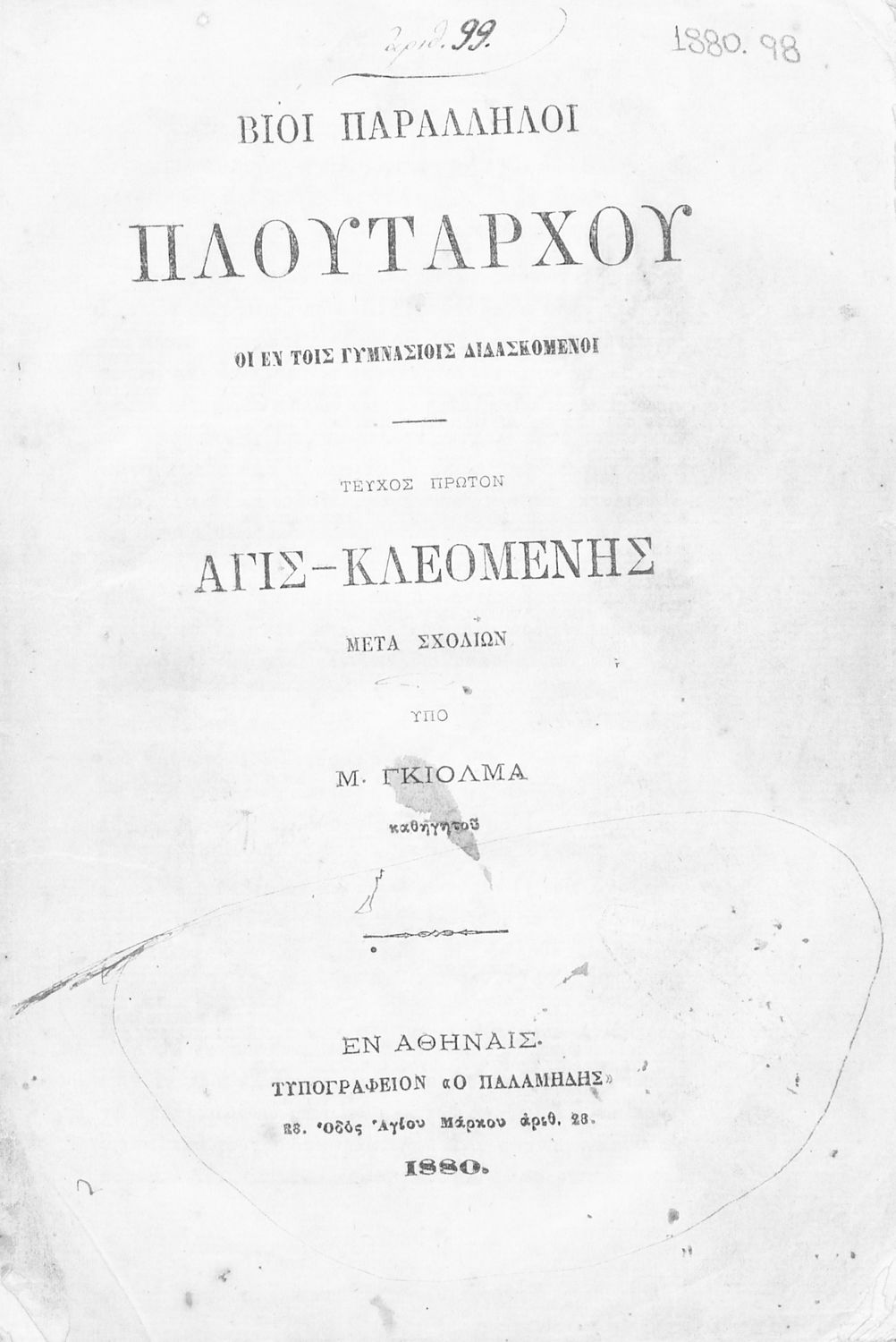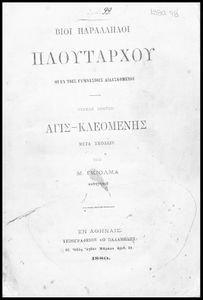 Σχολικό εγχειρίδιο Αρχαίων Ελληνικών για τους μαθητές των Γυμνασίων. Το βιβλίο περιλαμβάνει τις βιογραφίες των δύο βασιλέων της Λακωνίας, Άγι και Κλεομένη οι οποίες και συνοδεύονται από ερμηνευτικές, αι πραγματολογικές και γλωσσικές σημειώσεις.