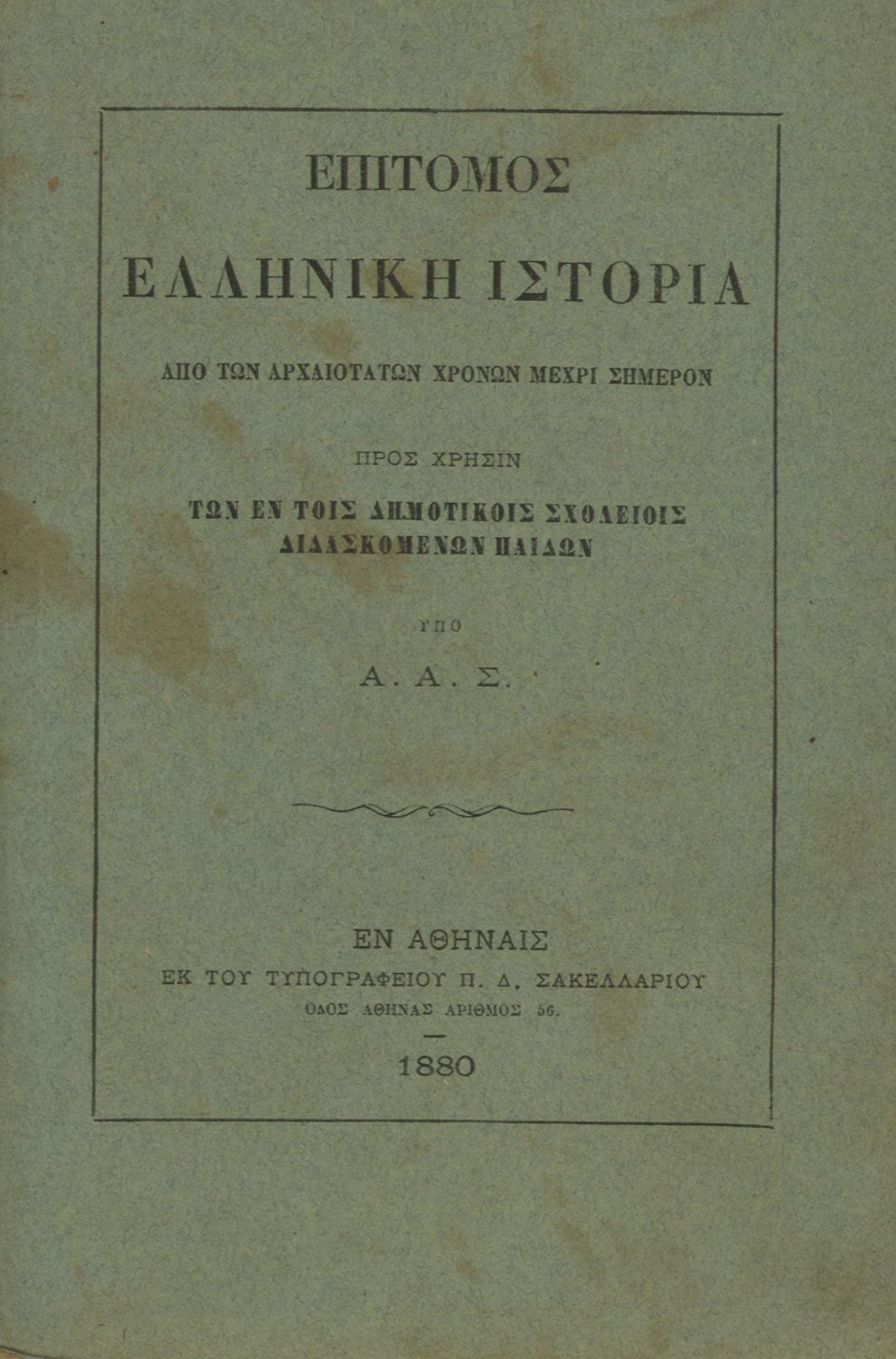 Κωδικός αναγνώρισης: 02-02725 Τίτλος: Επίτομος ελληνική ιστορία από των αρχαιοτάτων χρόνων μέχρι σήμερον προς χρήσιν των εν τοις Δημοτικοίς Σχολείοις διδασκομένων αυτών Συγγραφέας: Α. Α. Σ. Μέγεθος και υπόστρωμα: Σχολικό εγχειρίδιο, μαλακό εξώφυλλο, 102 σελίδες. |