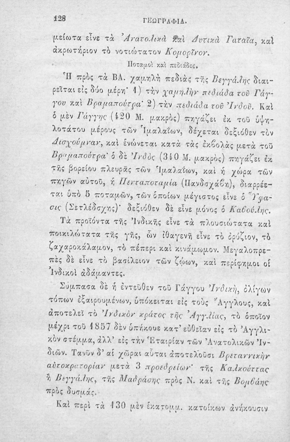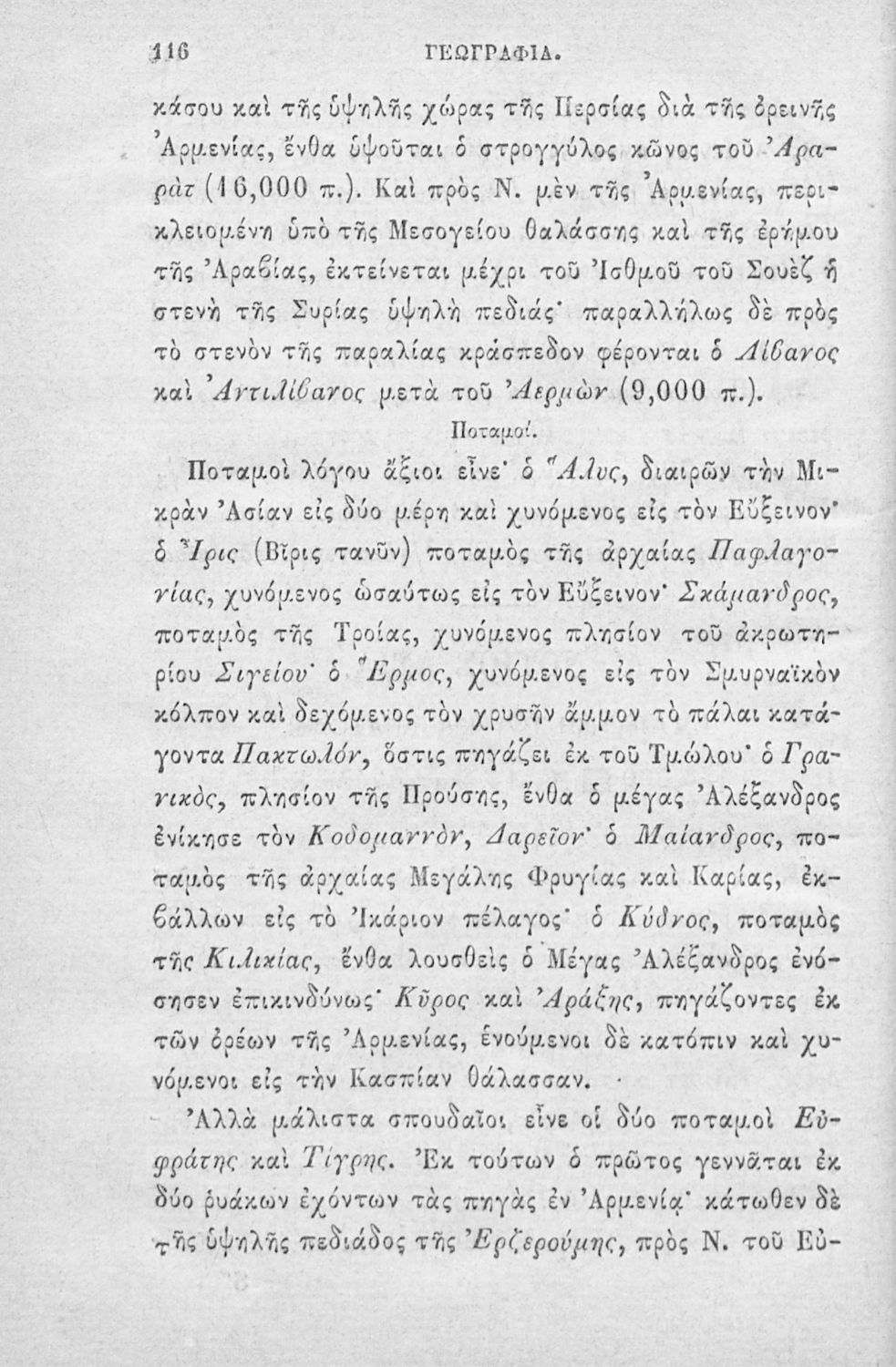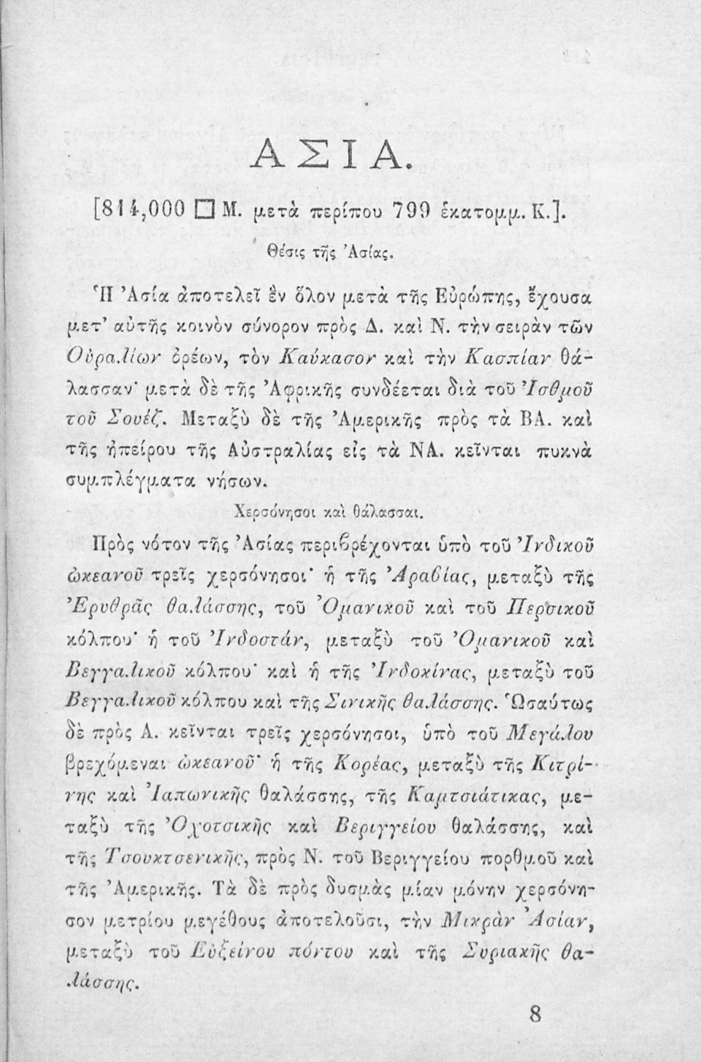 Σχολικό εγχειρίδιο Γεωγραφίας για τα Ελληνικά Σχολεία που περιλαμβάνει εισαγωγή στις βασικές έννοιες και ορισμούς της επιστήμης, και στοιχεία μαθηματικής, φυσικής και πολιτικής γεωγραφίας των πέντε ηπείρων.