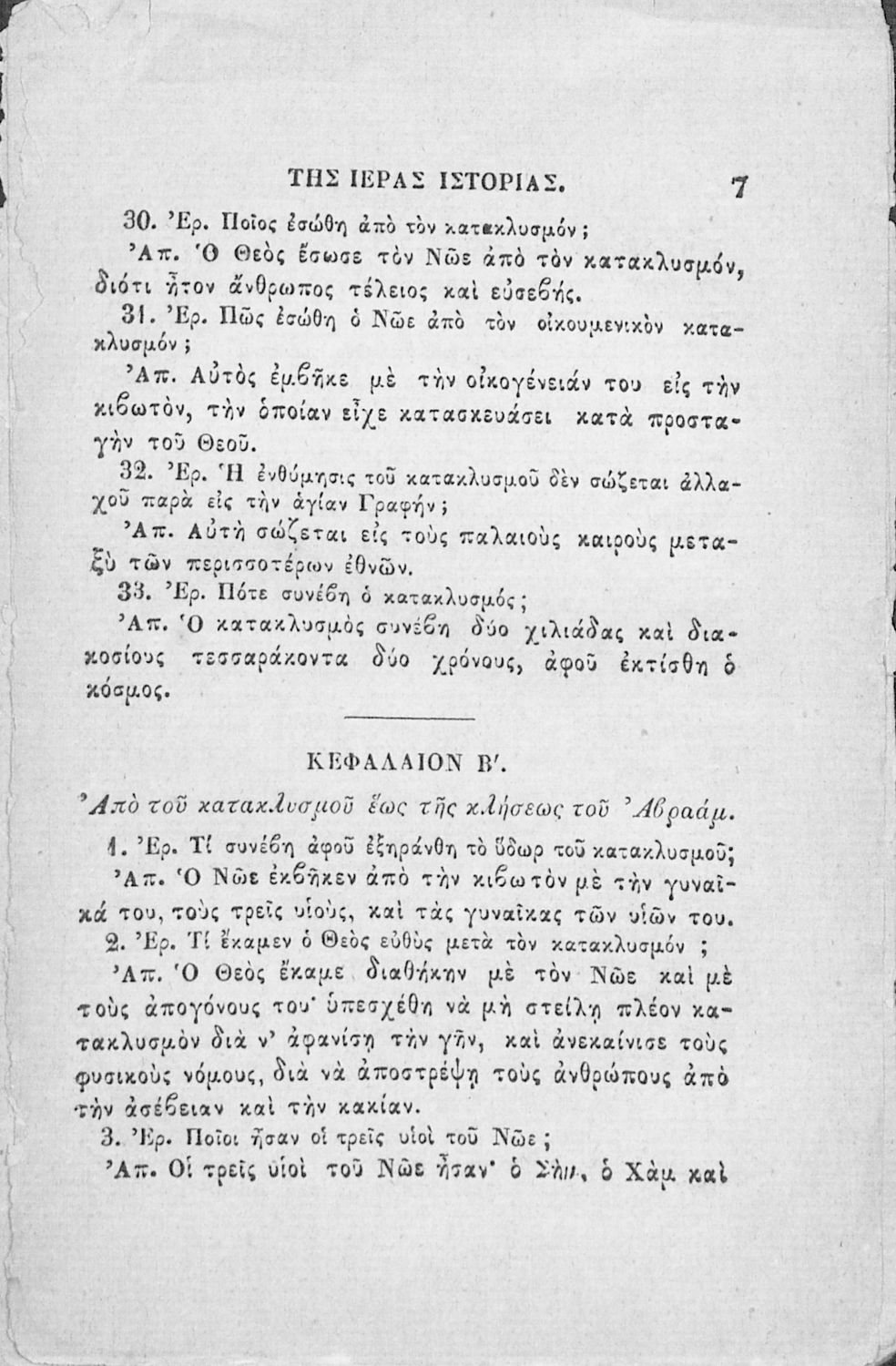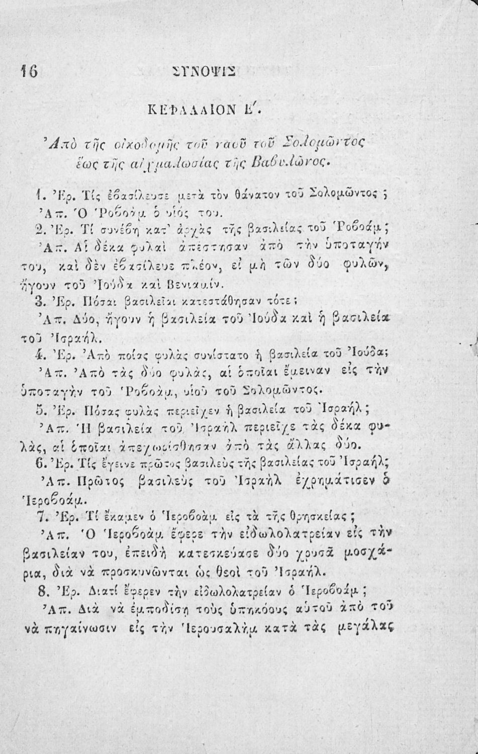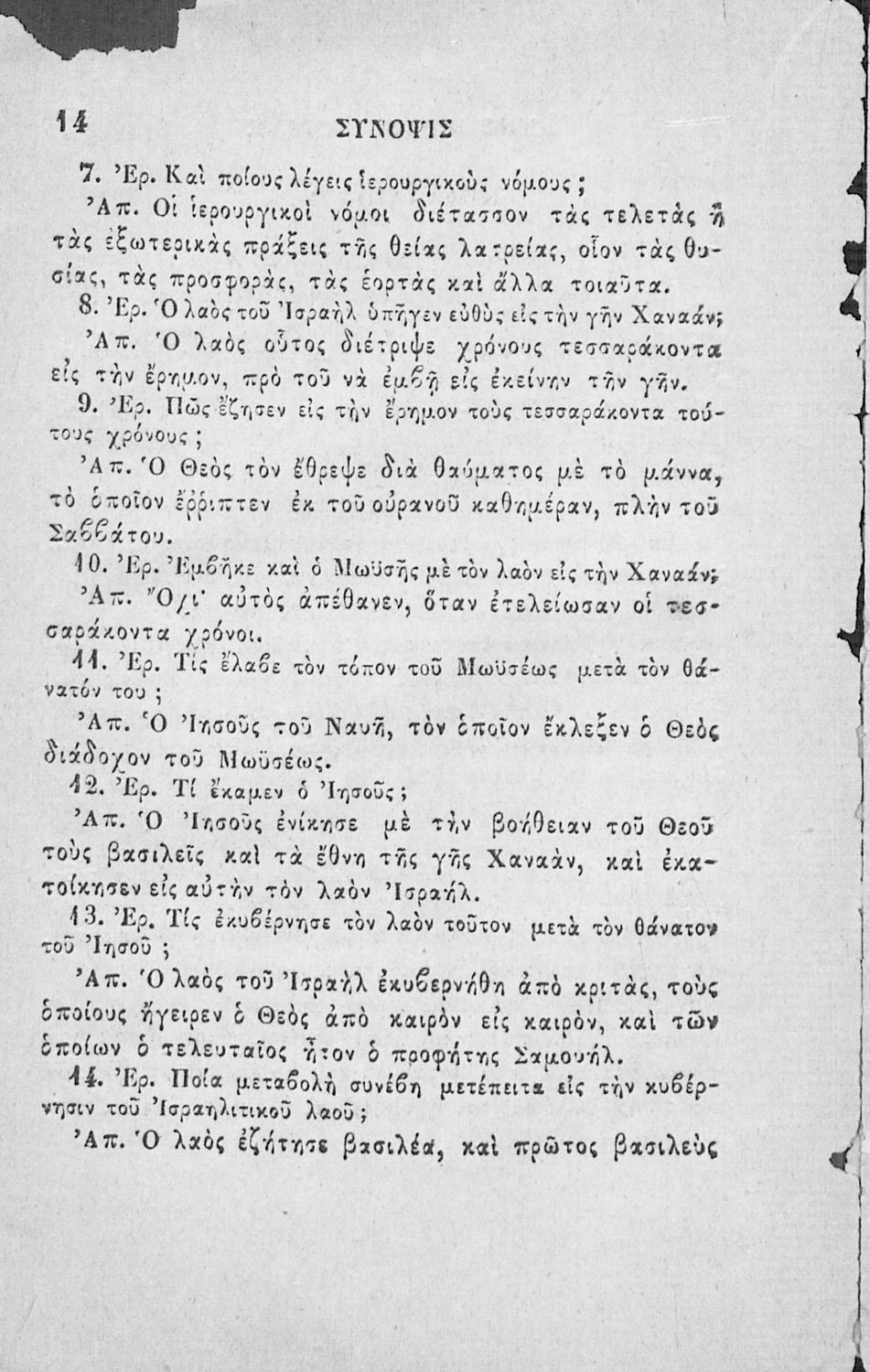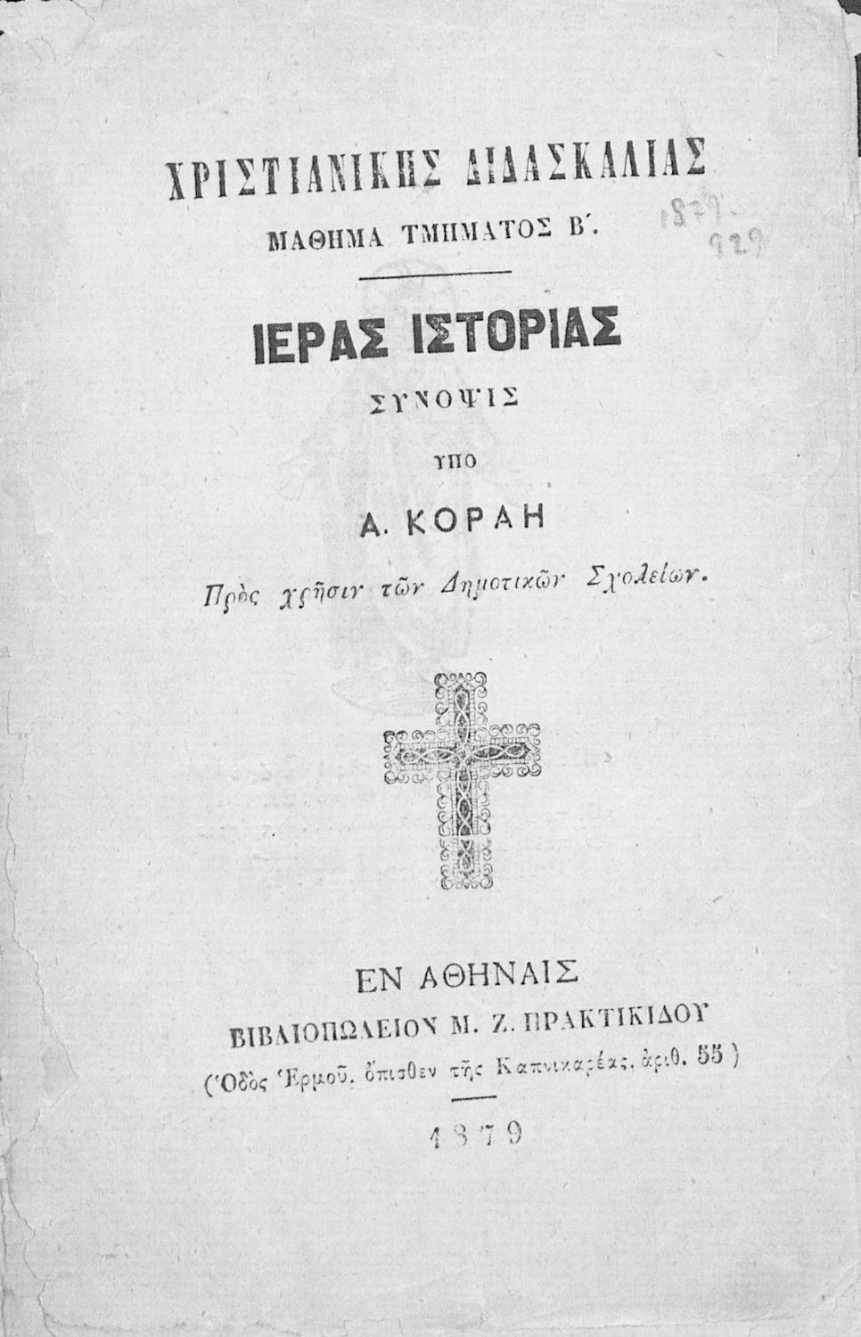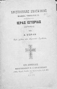 Κωδικός αναγνώρισης: 02-02752 Τίτλος: Χριστιανικής διδασκαλίας μάθημα τμήματος Β΄, ιεράς ιστορίας σύνοψις προς χρήσιν των Δημοτικών Σχολείων Συγγραφέας: Α. Κοραής Μέγεθος και υπόστρωμα: Σχολικό εγχειρίδιο, 32 σελίδες. Σκίτσα (ασπρόμαυρα). |