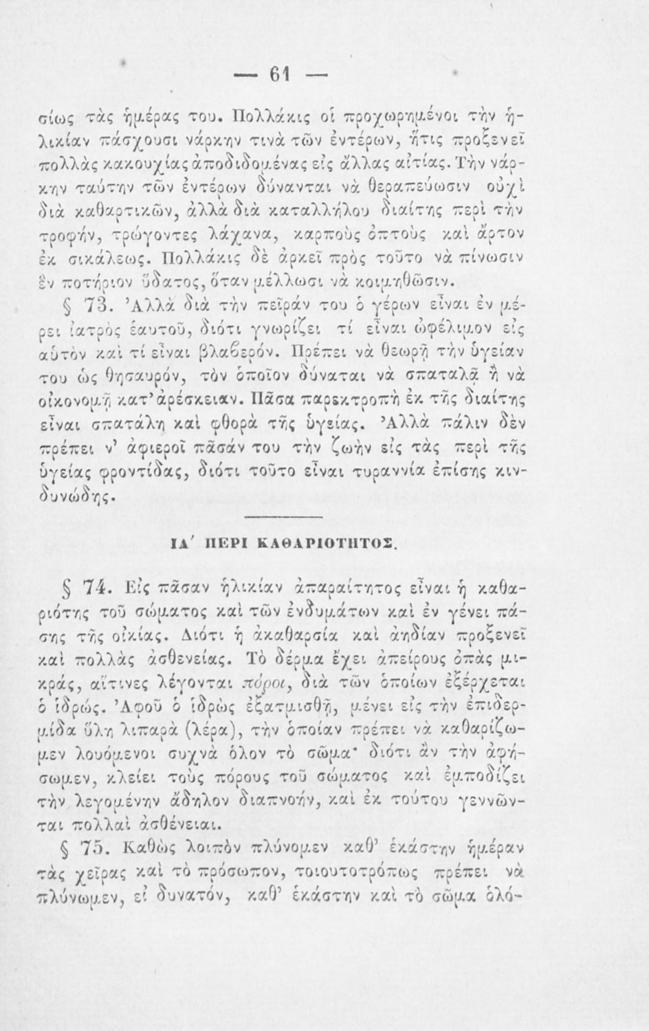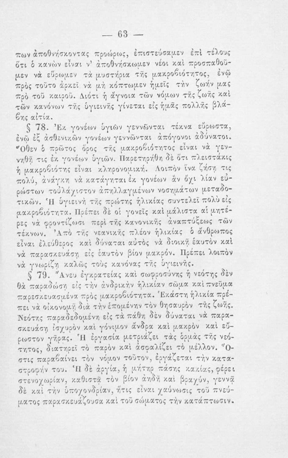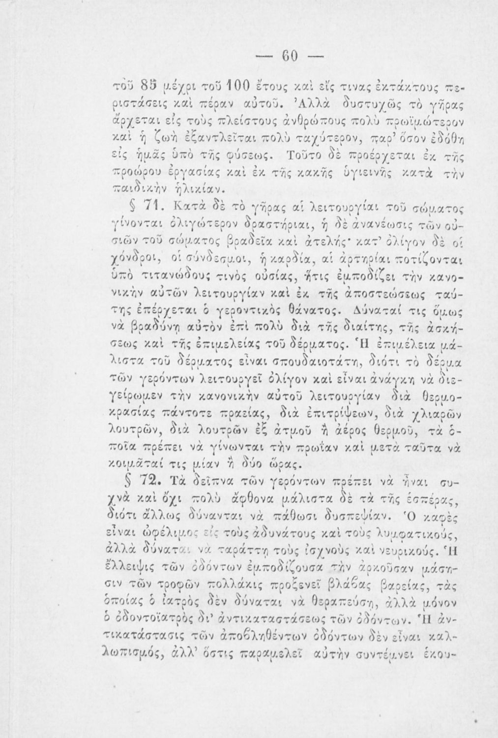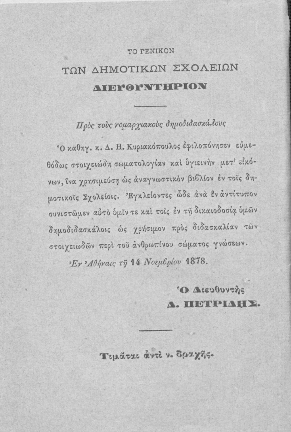 Βαθμίδα εκπαίδευσης: Πρωτοβάθμια Μάθημα: Ανθρωπολογία Γλώσσα: Καθαρεύουσα Παρουσίαση περιεχομένου: Σχολικό εγχειρίδιο Ανθρωπολογίας και Υγιεινής για τους μαθητές του Δημοτικού το οποίο εξετάζει στις λειτουργίες του ανθρώπινου σώματος, τα εξωτερικά και εσωτερικά μέρη του σώματος και τους παράγοντες οι οποίοι επηρεάζουν θετικά ή αρνητικά τον ανθρώπινο οργανισμό, όπως η εργασία, η τροφή και η άσκηση. |