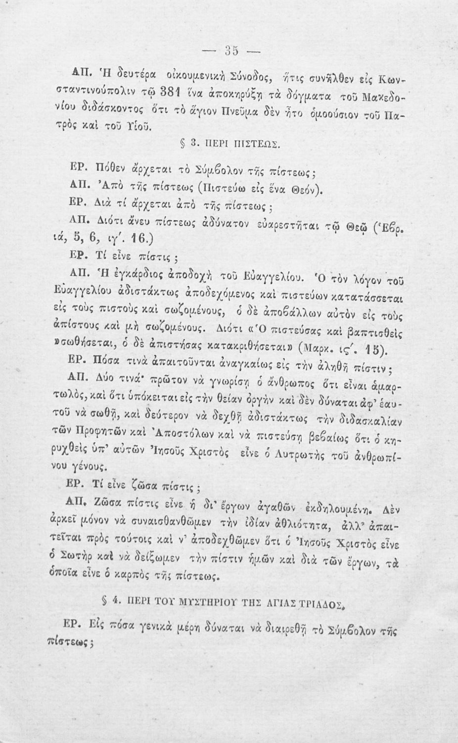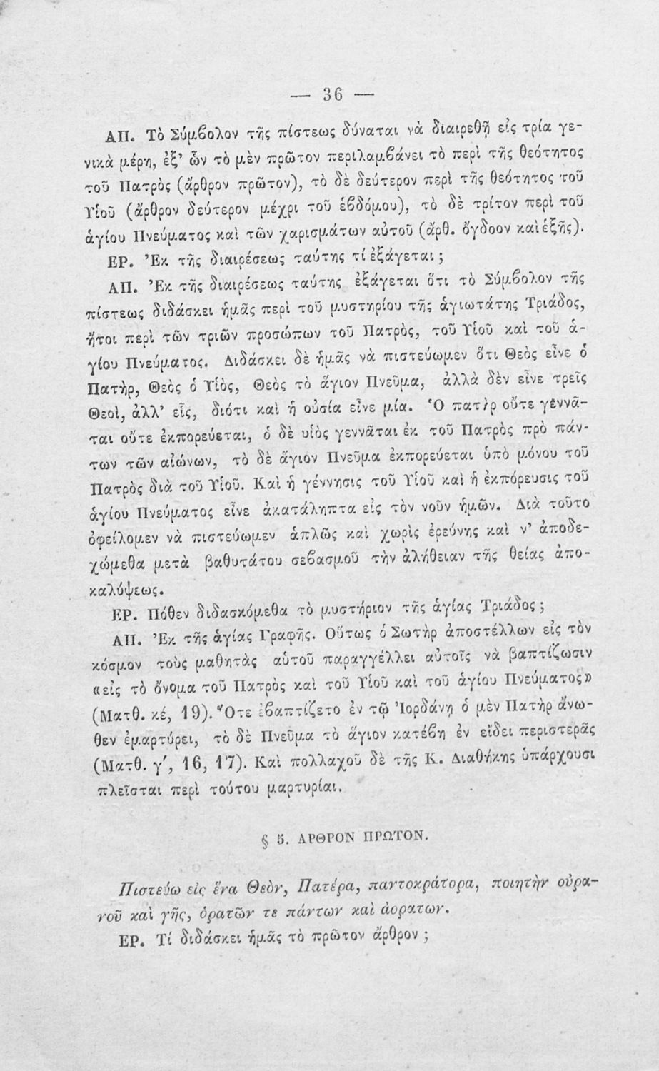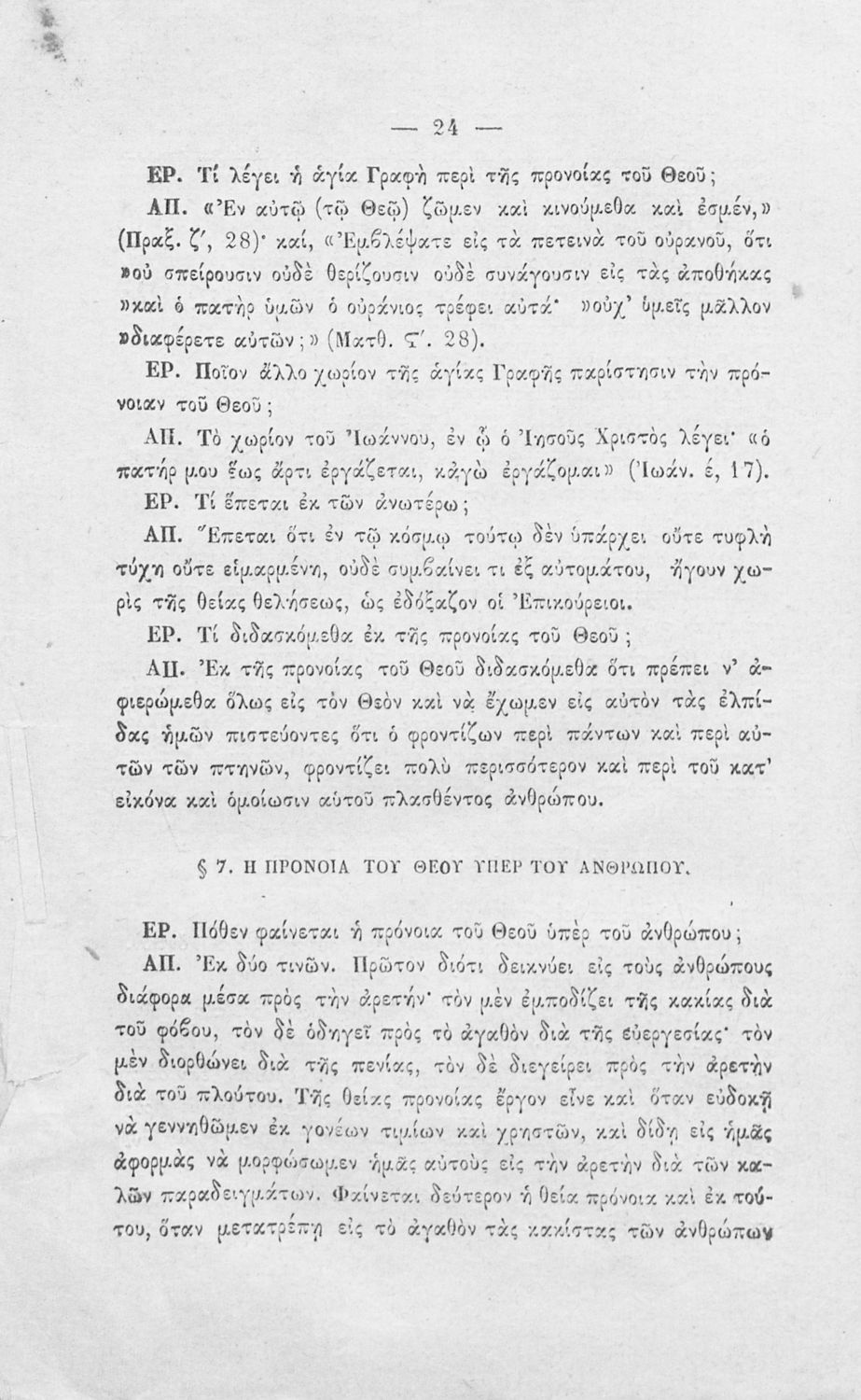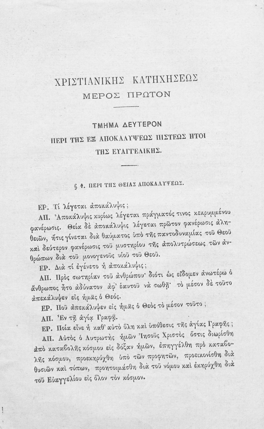 Σχολικό εγχειρίδιο για τις τάξεις του Ελληνικού για το μάθημα των Θρησκευτικών. Το εγχειρίδιο είναι χωρισμένο σε 3 μέρη. Το πρώτο μέρος περιλαμβάνει την γνώση για το Θεό και αποκαλείται ως "φυσική θεογνωσία". Το δεύτερο μέρος ασχολείται με την ευαγγελική πίστη και τα 7 μυστήρια της εκκλησίας και τους θεϊκούς νόμους και στο τρίτο μέρος σχολιάζεται συνοπτικά η αξία της Κυριακάτικης προσευχής.