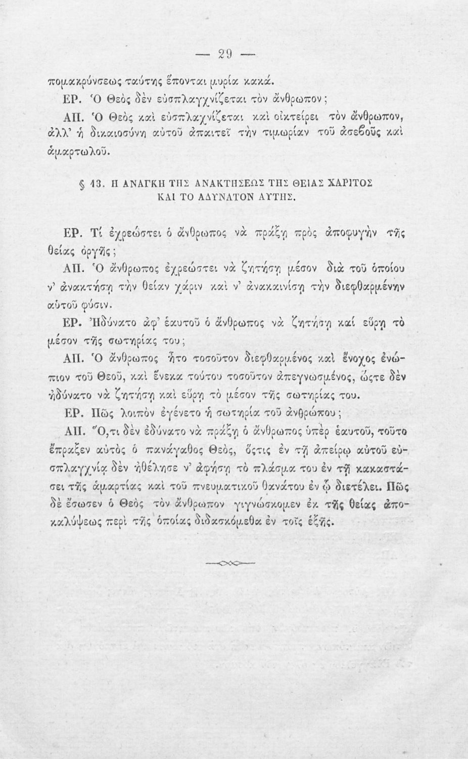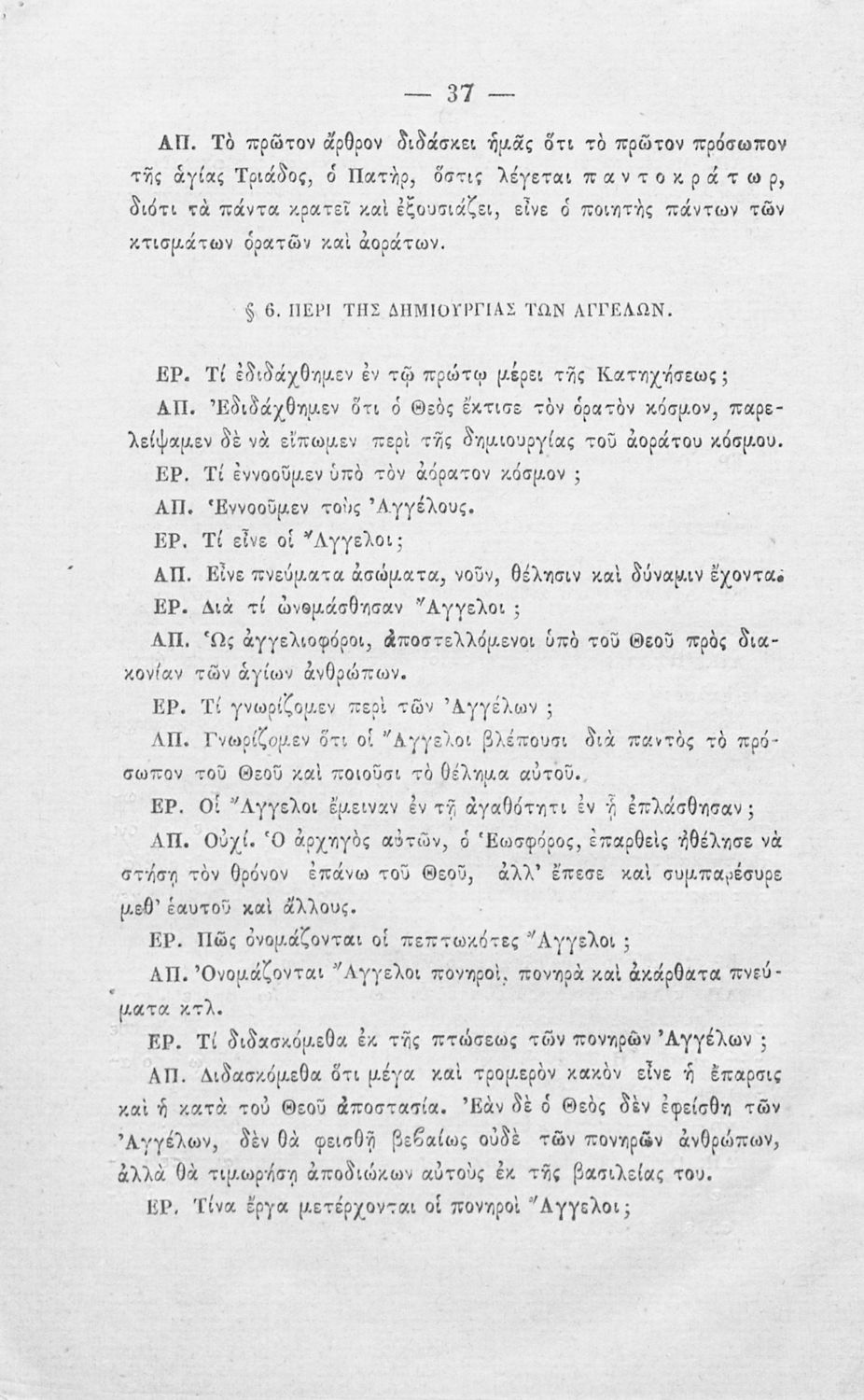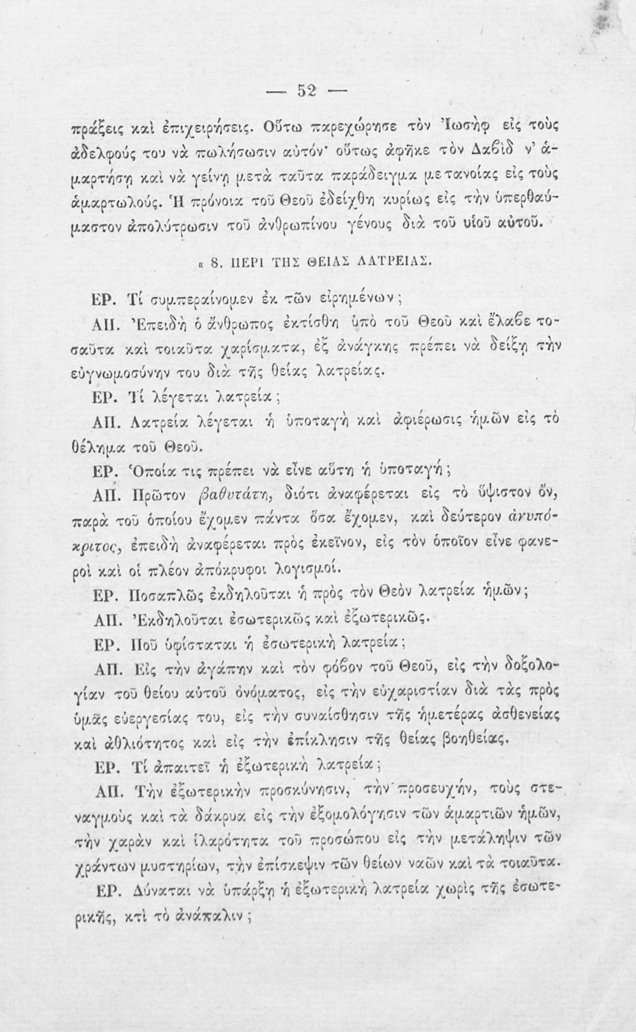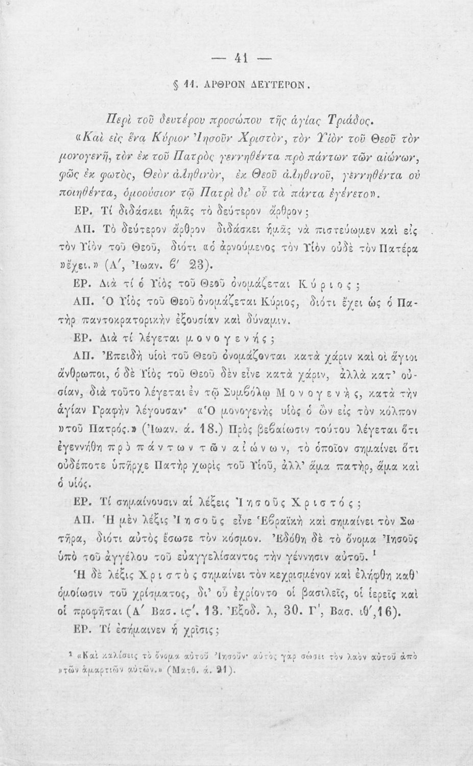 Σχολικό εγχειρίδιο για τις τάξεις του Ελληνικού για το μάθημα των Θρησκευτικών. Το εγχειρίδιο είναι χωρισμένο σε 3 μέρη. Το πρώτο μέρος περιλαμβάνει την γνώση για το Θεό και αποκαλείται ως "φυσική θεογνωσία". Το δεύτερο μέρος ασχολείται με την ευαγγελική πίστη και τα 7 μυστήρια της εκκλησίας και τους θεϊκούς νόμους και στο τρίτο μέρος σχολιάζεται συνοπτικά η αξία της Κυριακάτικης προσευχής.