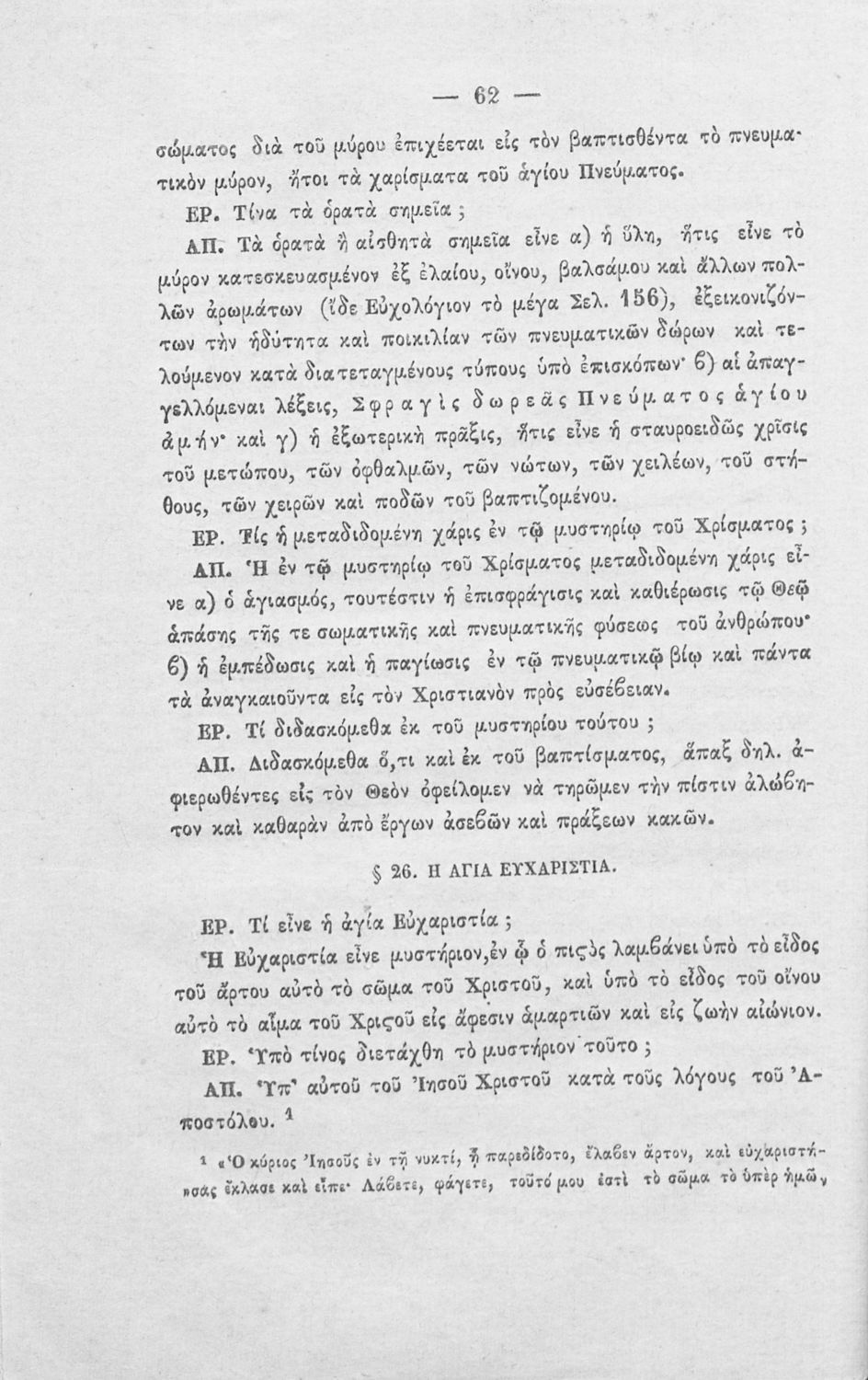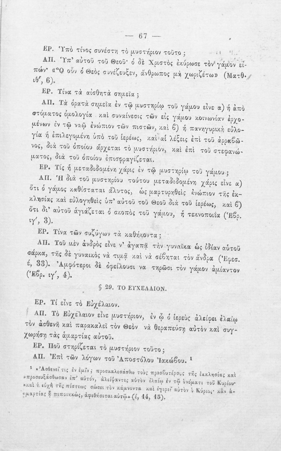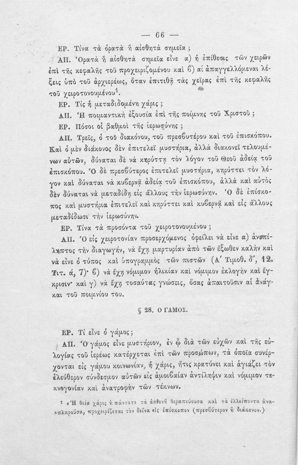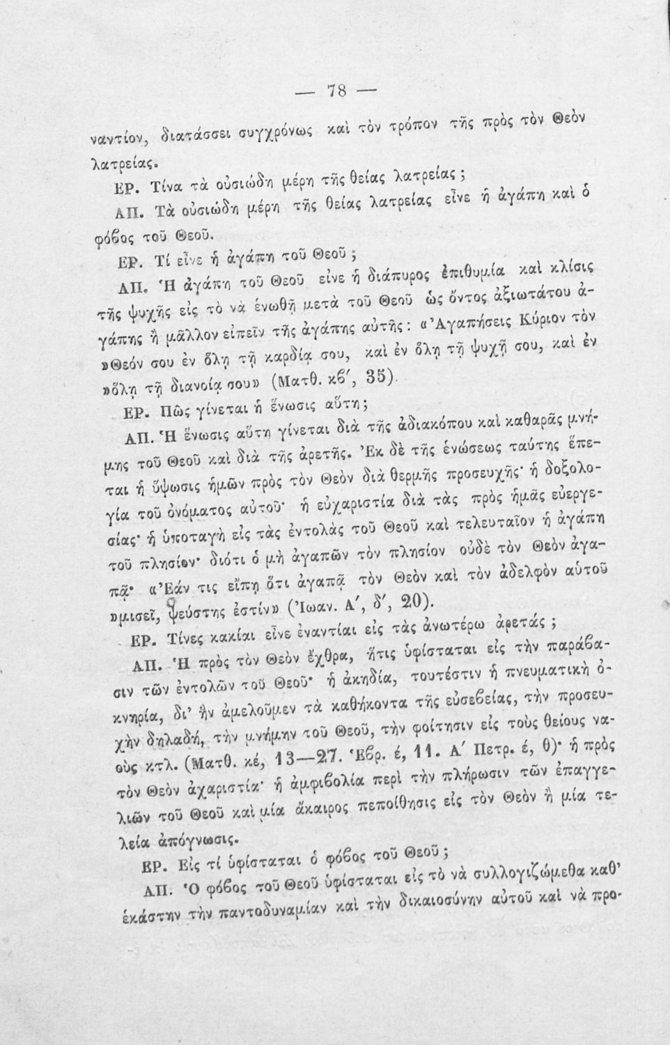 Σχολικό εγχειρίδιο για τις τάξεις του Ελληνικού για το μάθημα των Θρησκευτικών. Το εγχειρίδιο είναι χωρισμένο σε 3 μέρη. Το πρώτο μέρος περιλαμβάνει την γνώση για το Θεό και αποκαλείται ως "φυσική θεογνωσία". Το δεύτερο μέρος ασχολείται με την ευαγγελική πίστη και τα 7 μυστήρια της εκκλησίας και τους θεϊκούς νόμους και στο τρίτο μέρος σχολιάζεται συνοπτικά η αξία της Κυριακάτικης προσευχής.