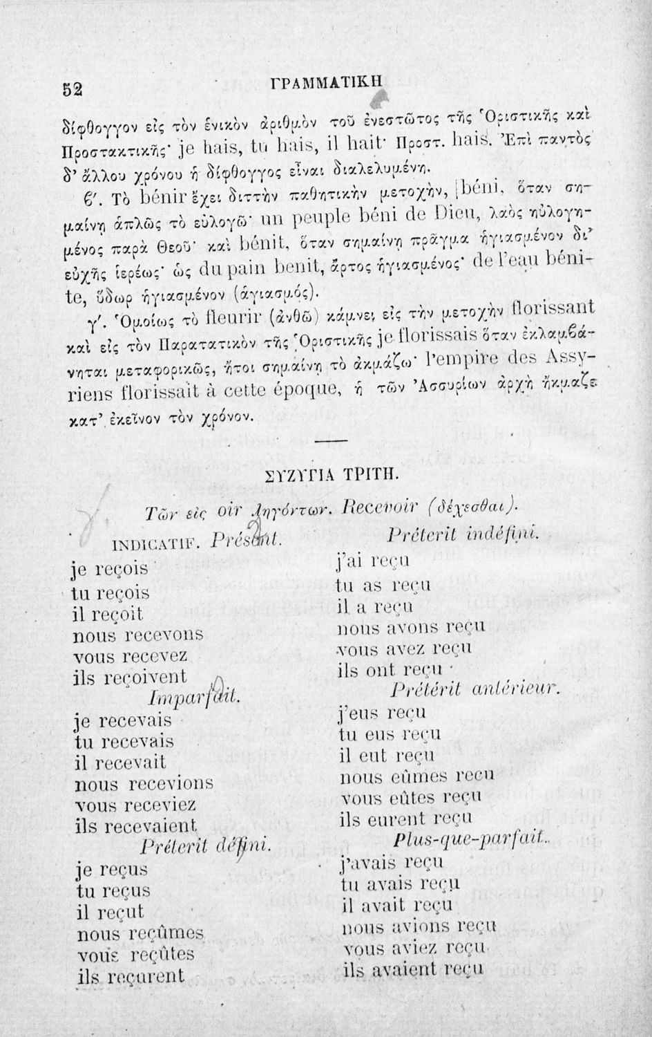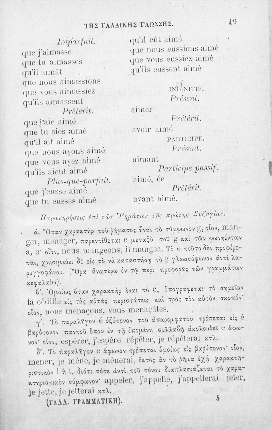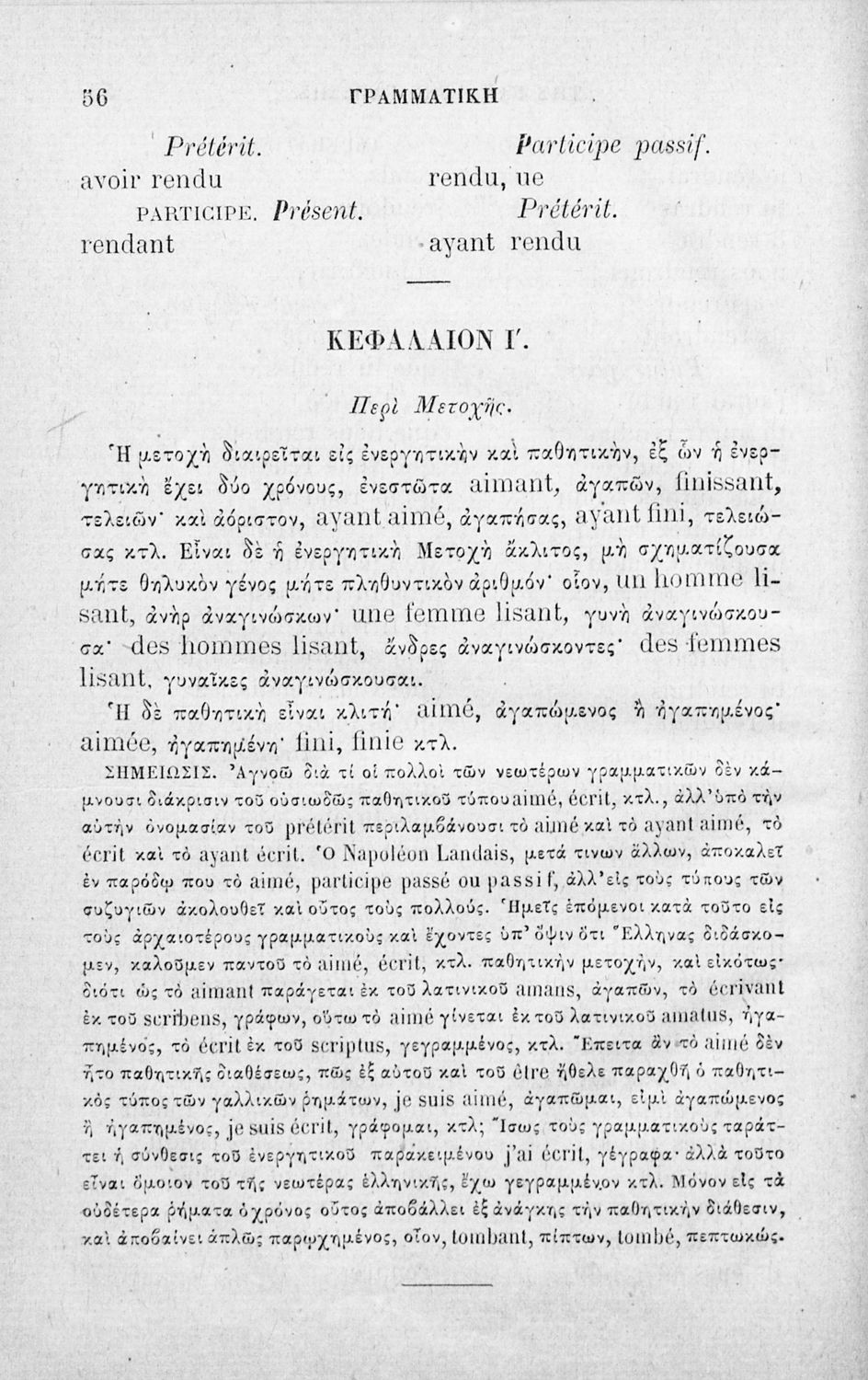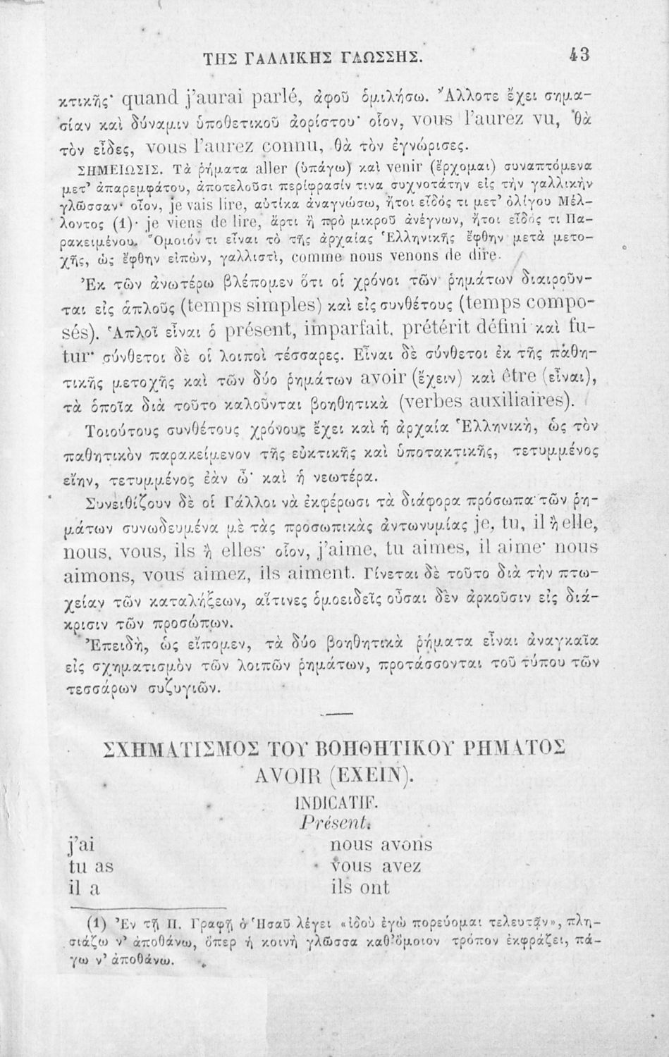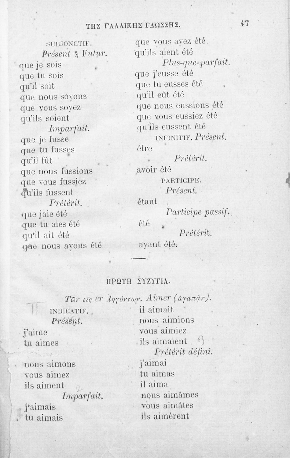 LDR 00958 2200205 4500 035 ## _a02-02797 040 ## _aΕλληνικό Λογοτεχνικό και Ιστορικό Αρχείο 041 ## _ael 100 ## _aΙωάννης Δ. Καρασούτσας 110 ## _a1877.95 245 0# _aΓραμματική της γαλλικής γλώσσης, συνταχθείσα προς χρήσιν των Γυμνασίων και σχολείων της Ελλάδος 260 ## _aΑθήνα _bΑ. Κορομηλάς _c1877 300 ## _a162 520 ## _aΣχολικό εγχειρίδιο Γαλλικών Γυμνασίου που περιέχει τους κανόνες γραμματικής και συντακτικού. 521 ## _aΓυμνάσιο 522 ## _aΕλλάδα 546 ## _aΚαθαρεύουσα 563 ## _aΣκληρό Εξώφυλλο 583 ## _a1870/ 650 #4 _aΑντωνυμίες _aΕπίθετα _aΟνόματα _aΡήματα