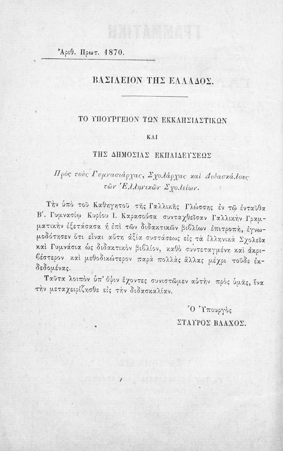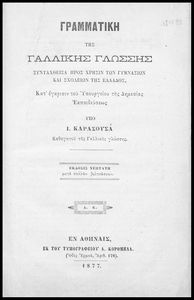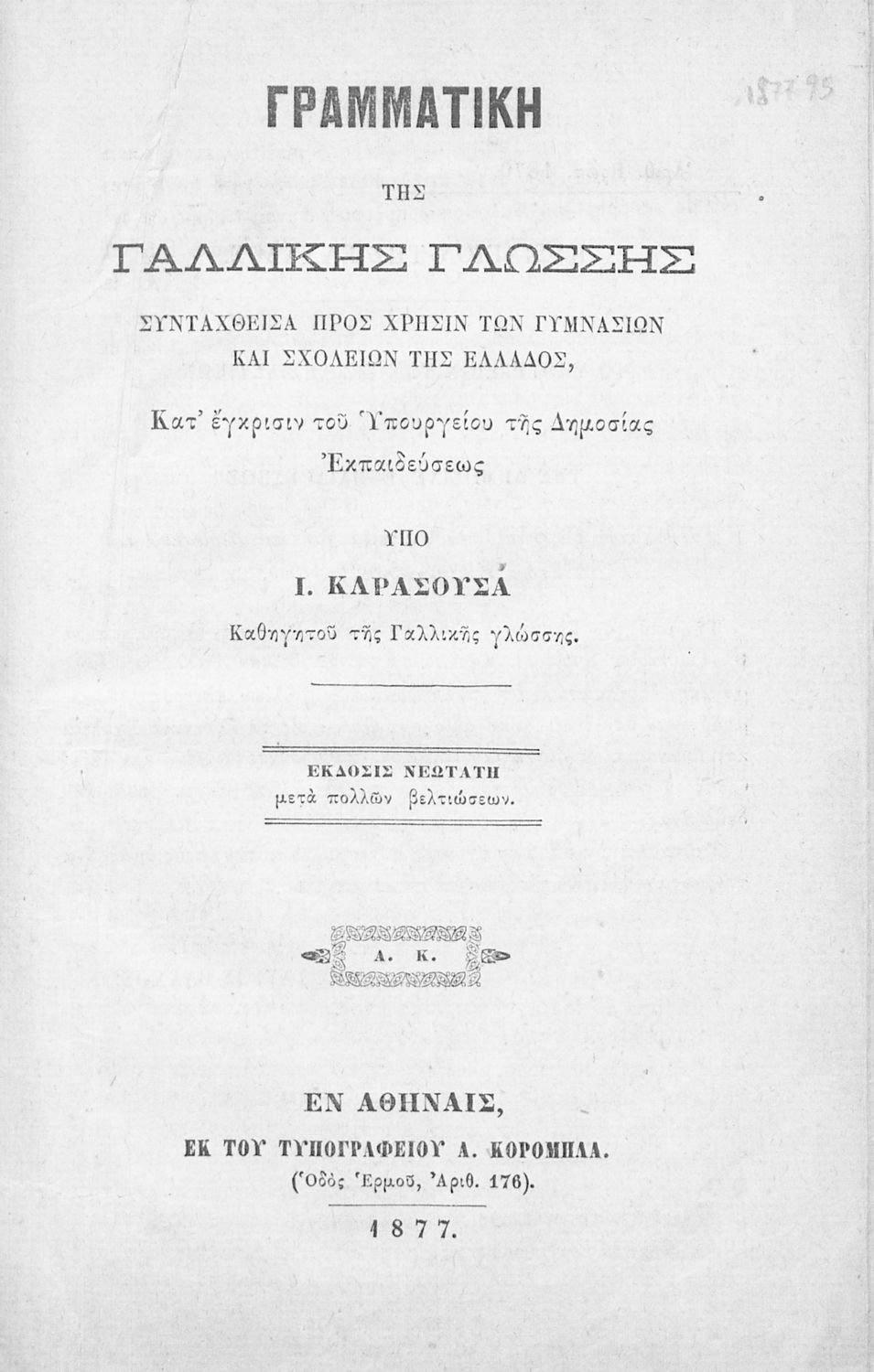 Εκδότης: Α. Κορομηλάς Έτος έκδοσης: 1877 Τόπος έκδοσης: Αθήνα Υπουργική απόφαση / Σύμβαση: 1870/ |