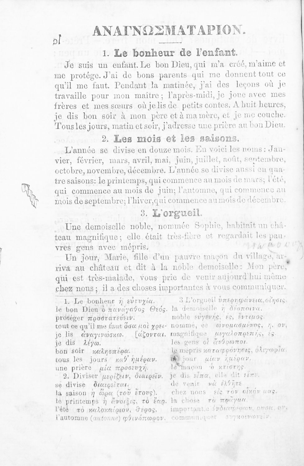 Πρόκειται για το Α΄ μέρος σχολικού εγχειριδίου το οποίο μέσα από μικρά αυτοτελή μαθήματα προοριζόταν για τη διδασκαλία του μαθήματος της Γαλλικής γλώσσας. Φέρει λίγες προσωπικές σημειώσεις του μαθητή.