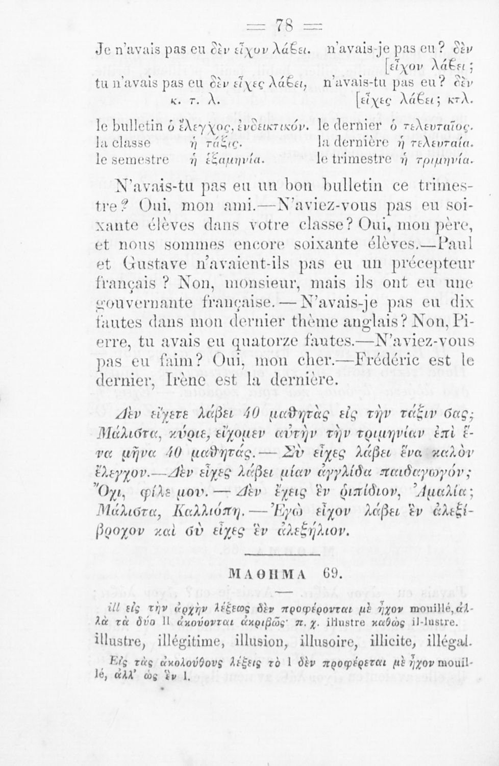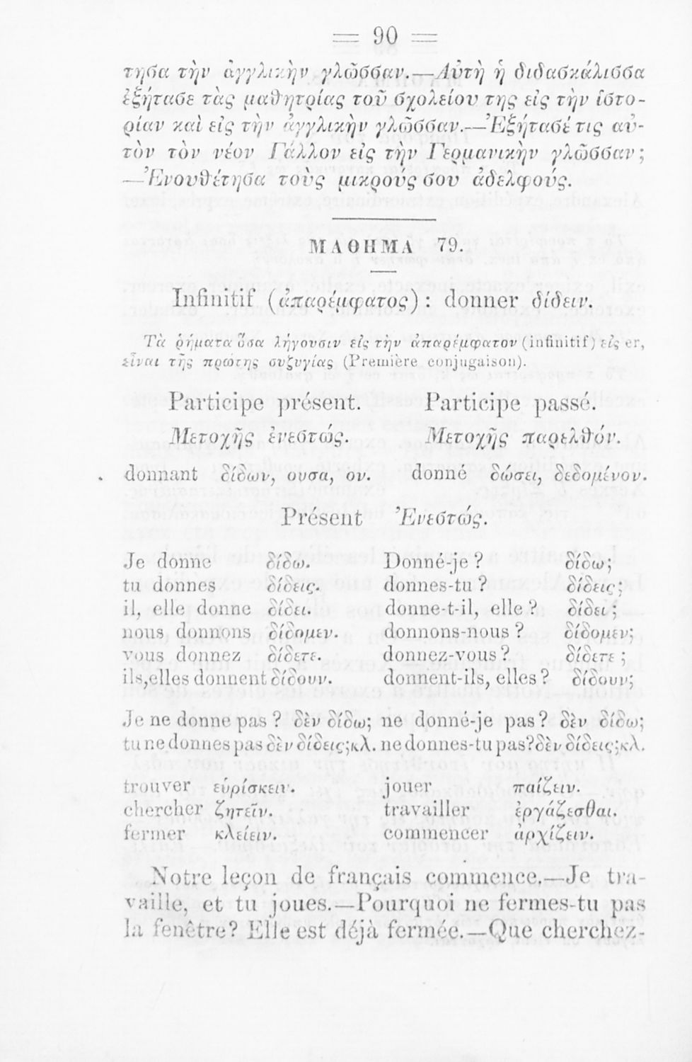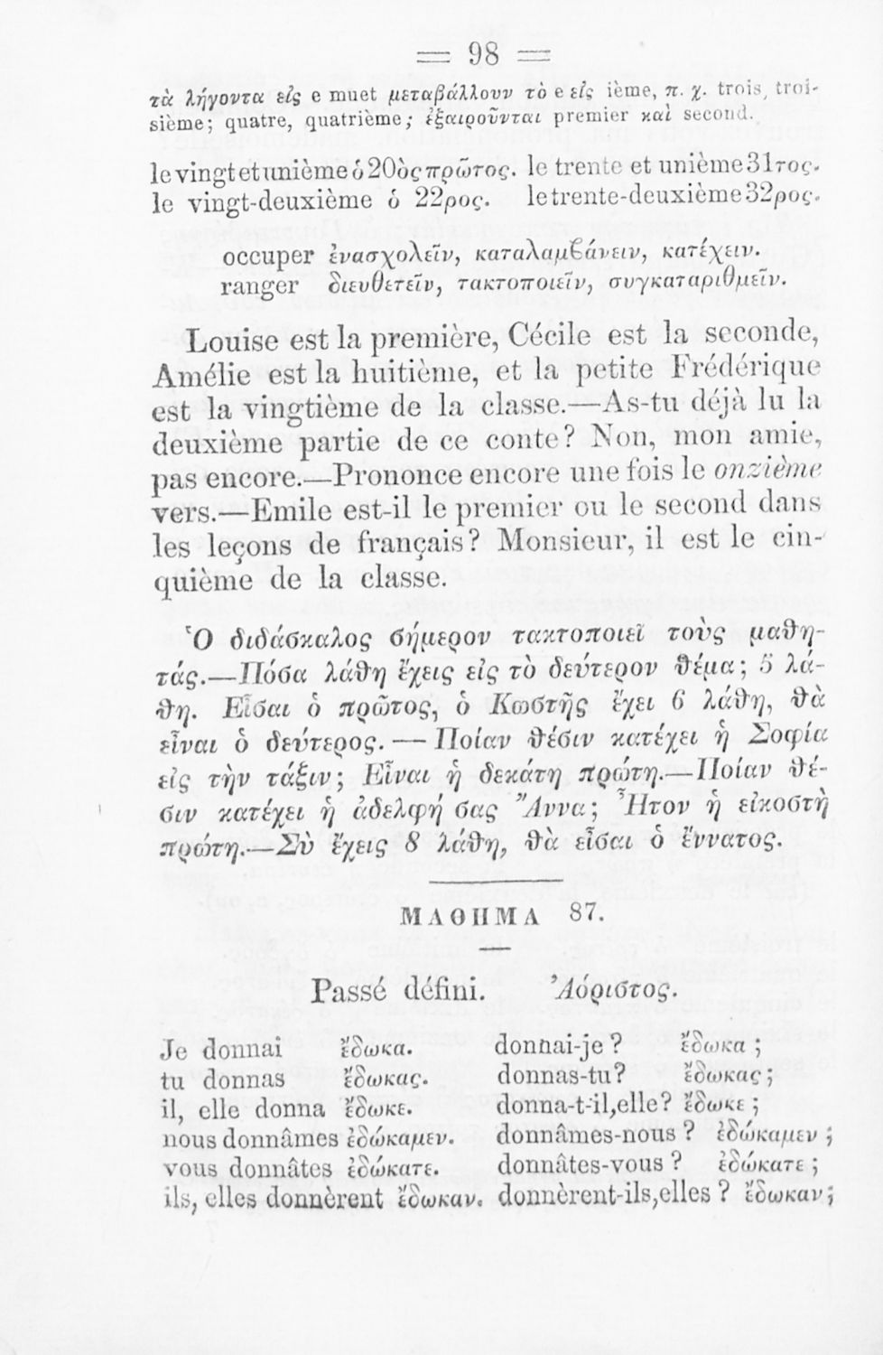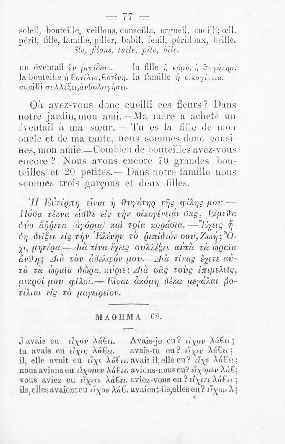 Σχολικό εγχειρίδιο Γαλλικών περιέχει κείμενα απλών διαλόγων στη γαλλική γλώσσα και τα οποία αναλύει γραμματικά και συντακτικά.