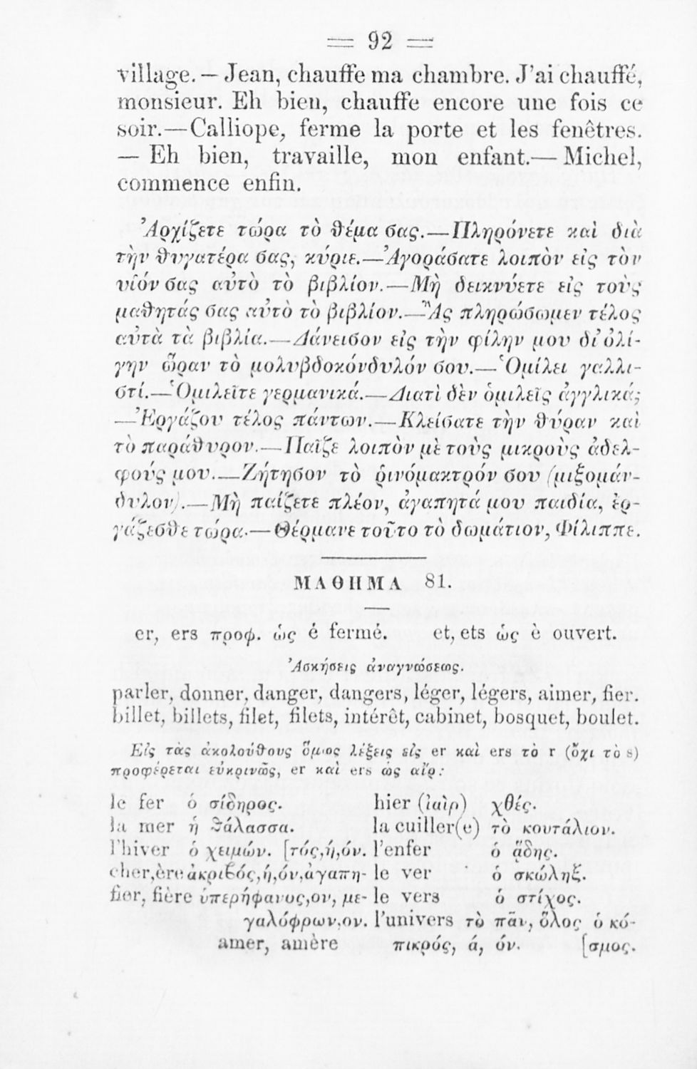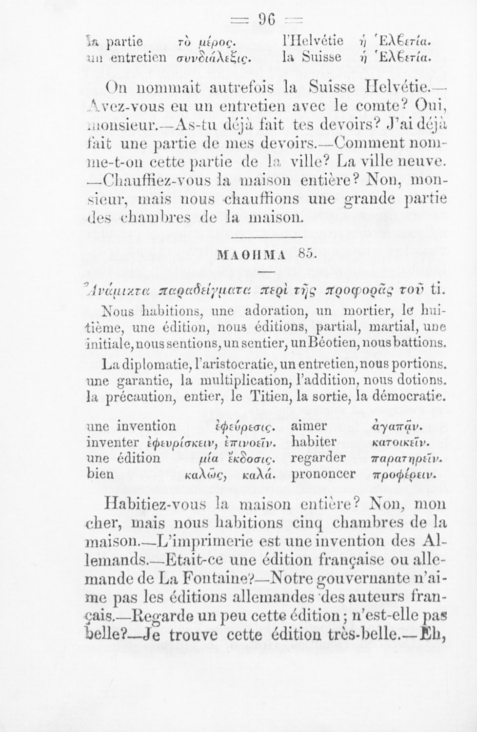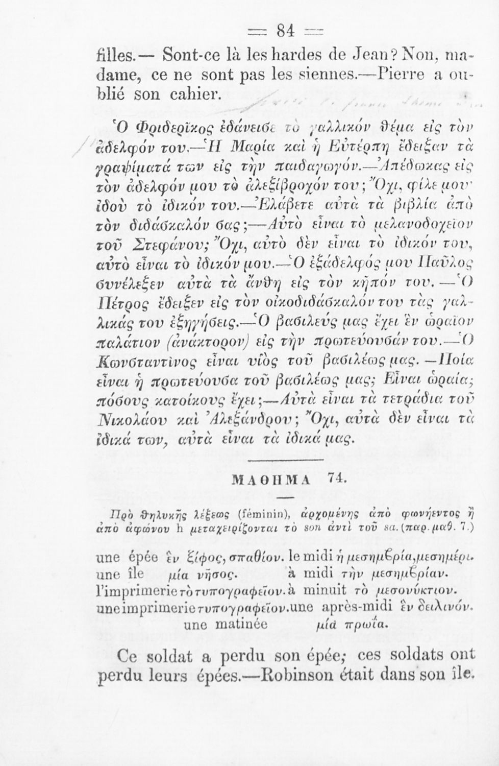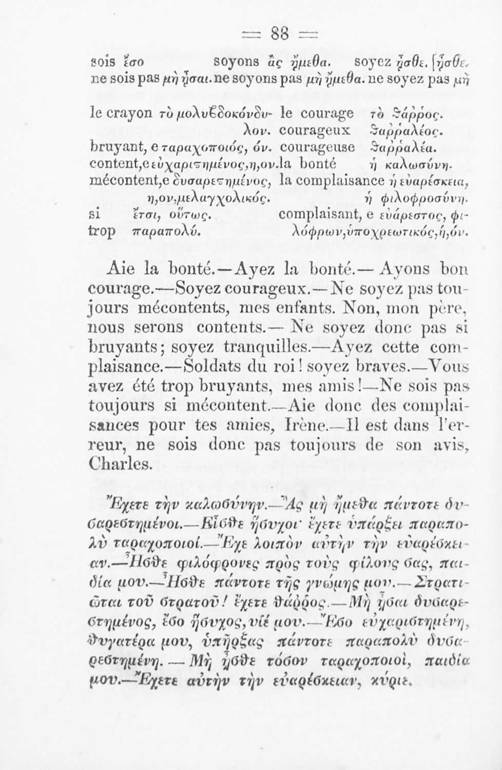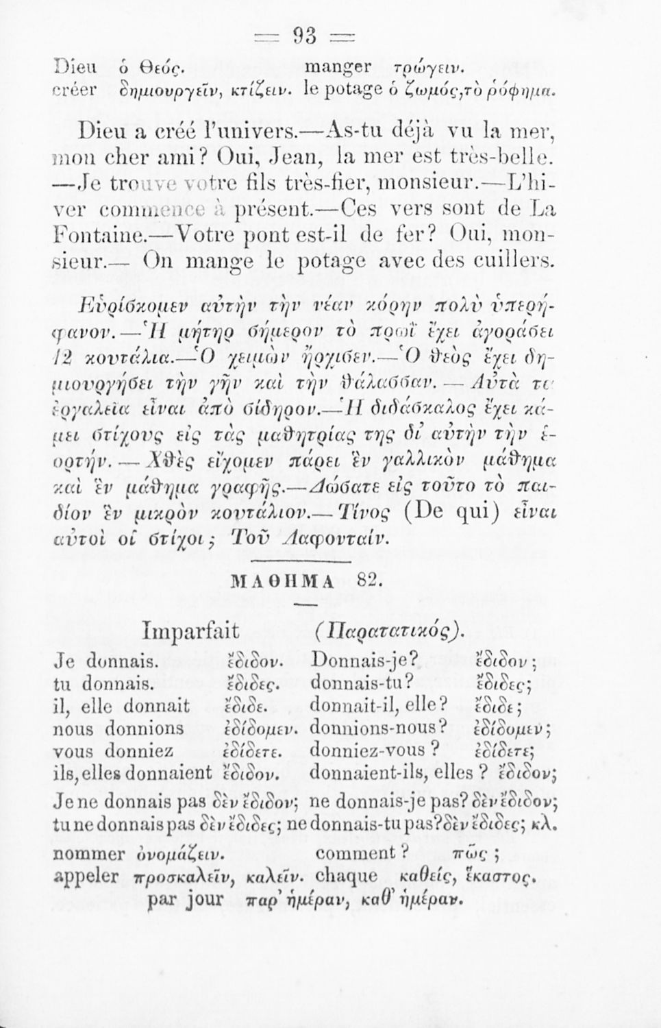 Σχολικό εγχειρίδιο Γαλλικών περιέχει κείμενα απλών διαλόγων στη γαλλική γλώσσα και τα οποία αναλύει γραμματικά και συντακτικά.