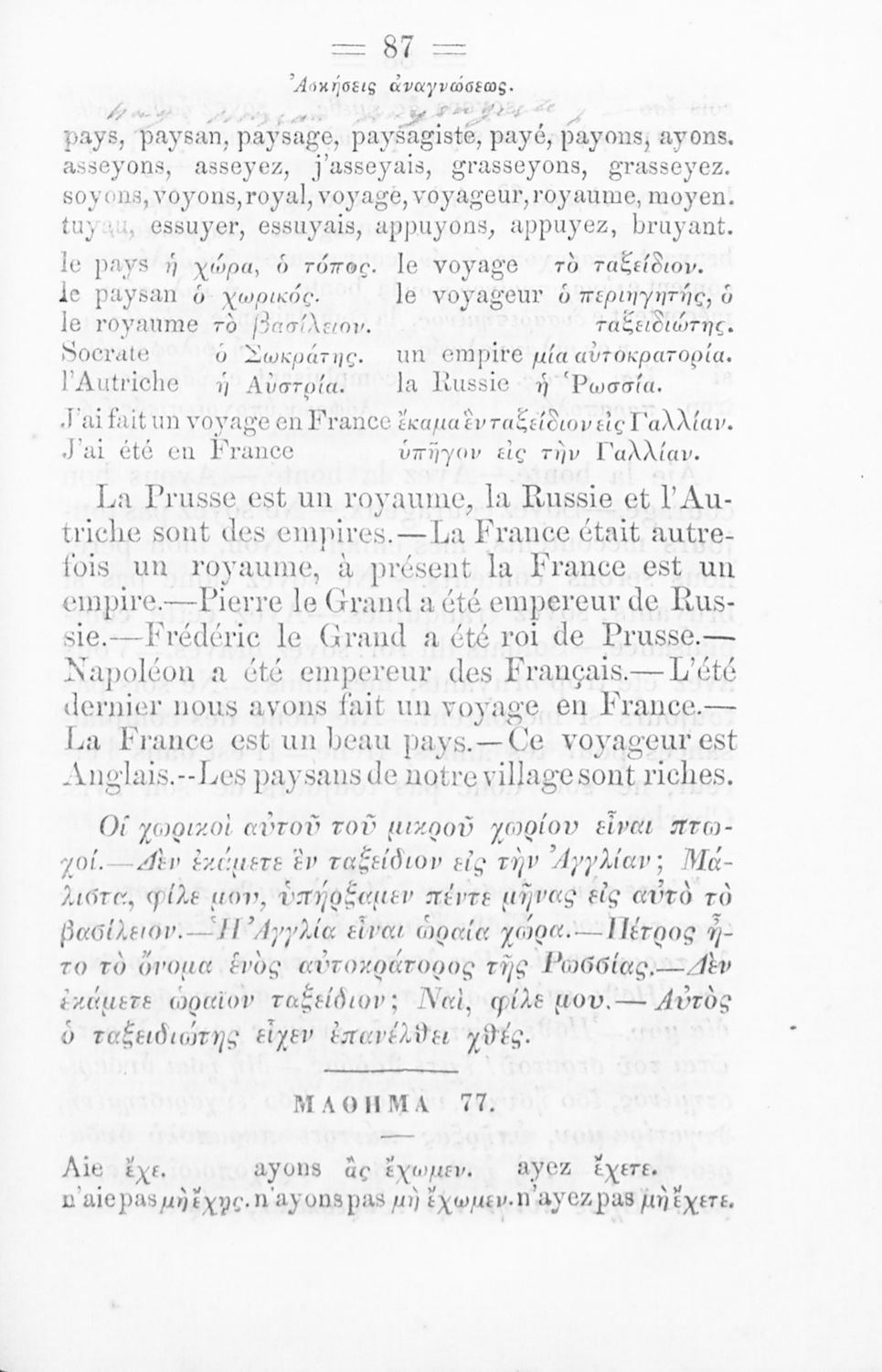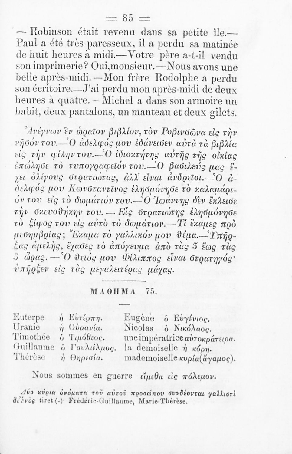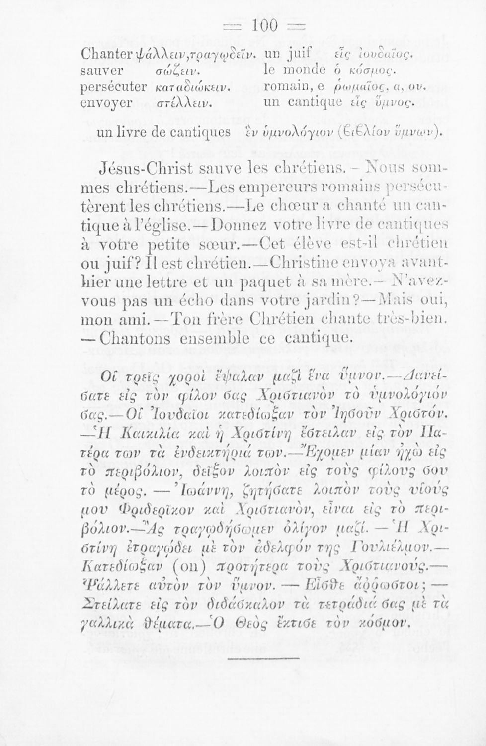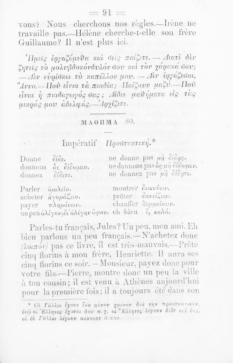Σχολικό εγχειρίδιο Γαλλικών περιέχει κείμενα απλών διαλόγων στη γαλλική γλώσσα και τα οποία αναλύει γραμματικά και συντακτικά.