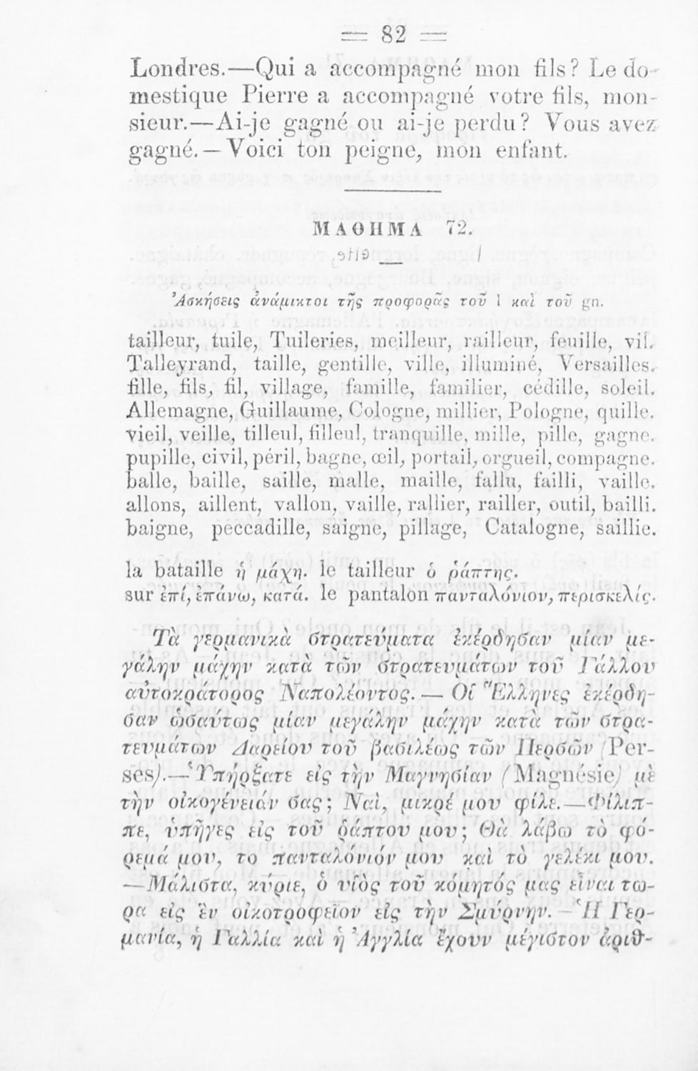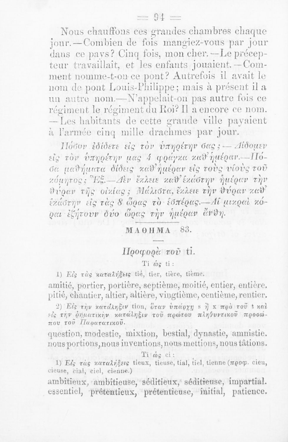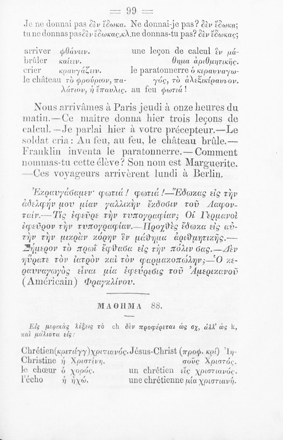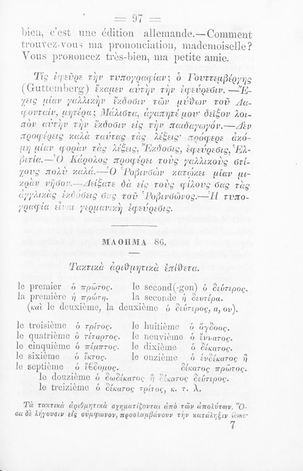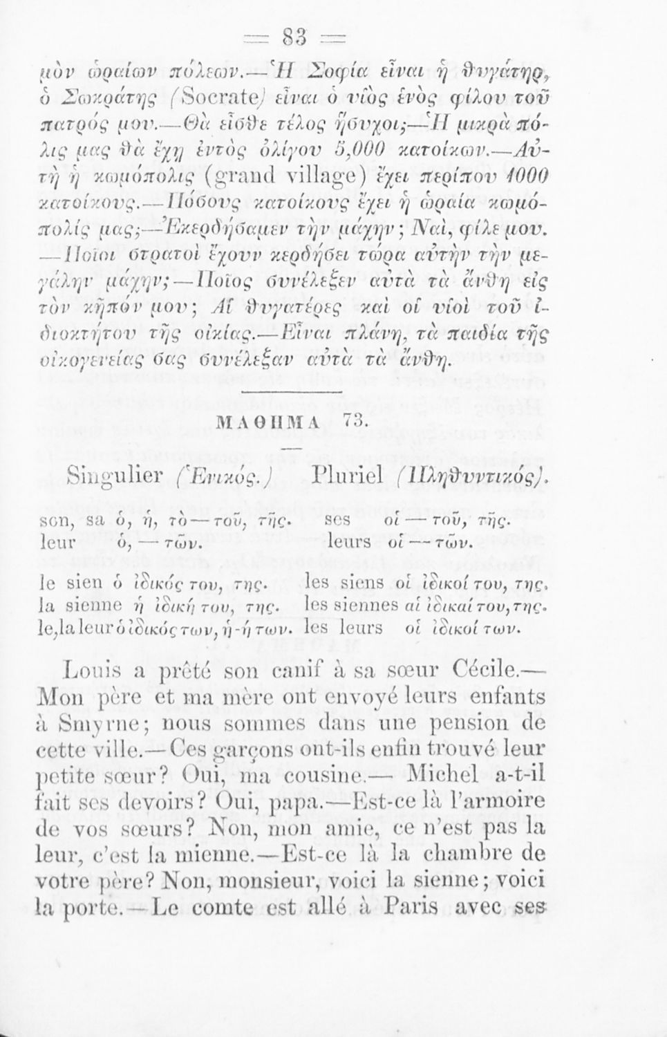 Σχολικό εγχειρίδιο Γαλλικών περιέχει κείμενα απλών διαλόγων στη γαλλική γλώσσα και τα οποία αναλύει γραμματικά και συντακτικά.