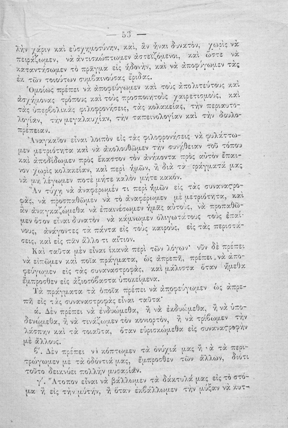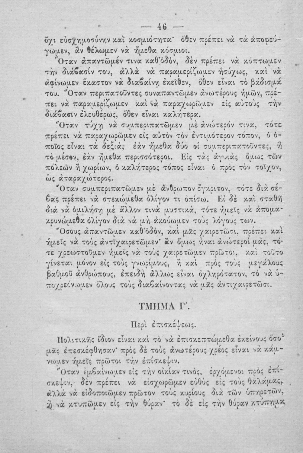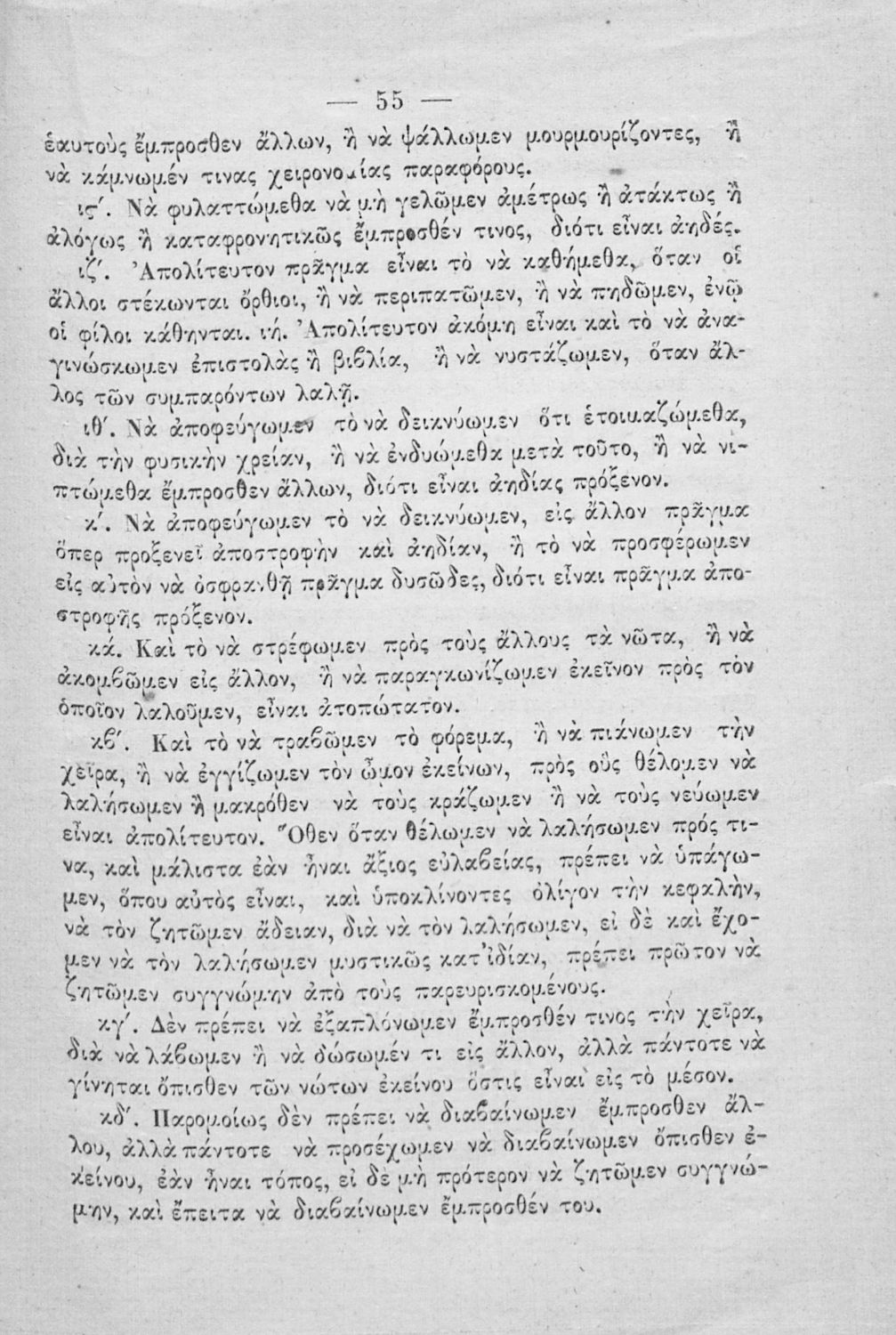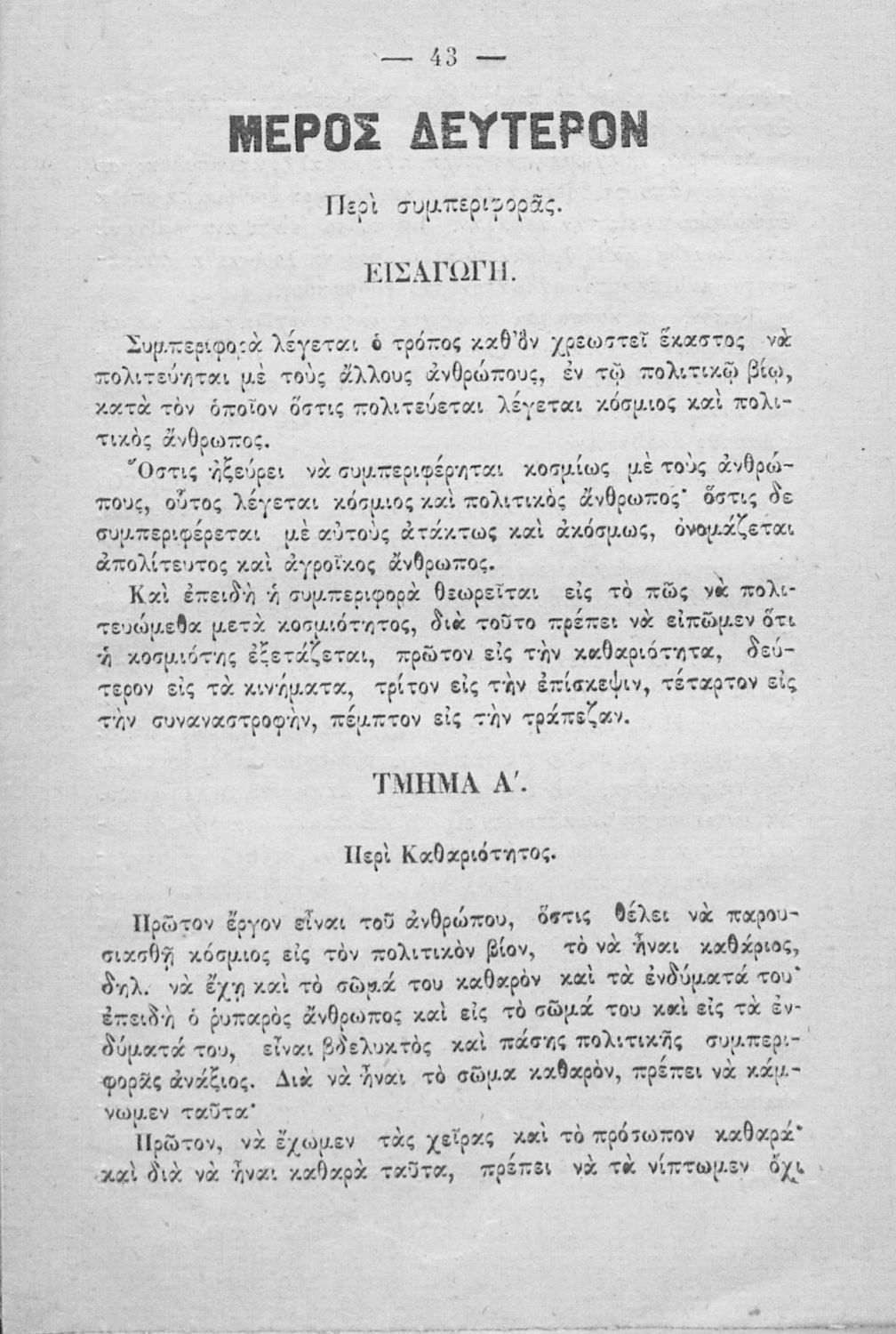 Παρουσίαση περιεχομένου: Σχολικό εγχειρίδιο Χρηστοήθειας των Αλληλοδιδακτικών σχολείων. Το βιβλίο περιέχει τρόπους διαχείρισης της συμπεριφοράς των μαθητών σε έντονες ψυχικές καταστάσεις, όπως διαχείριση φόβου ή οργής, καθώς και κανόνες σωστής συμπεριφοράς στις κοινωνικές συναναστροφές τους.