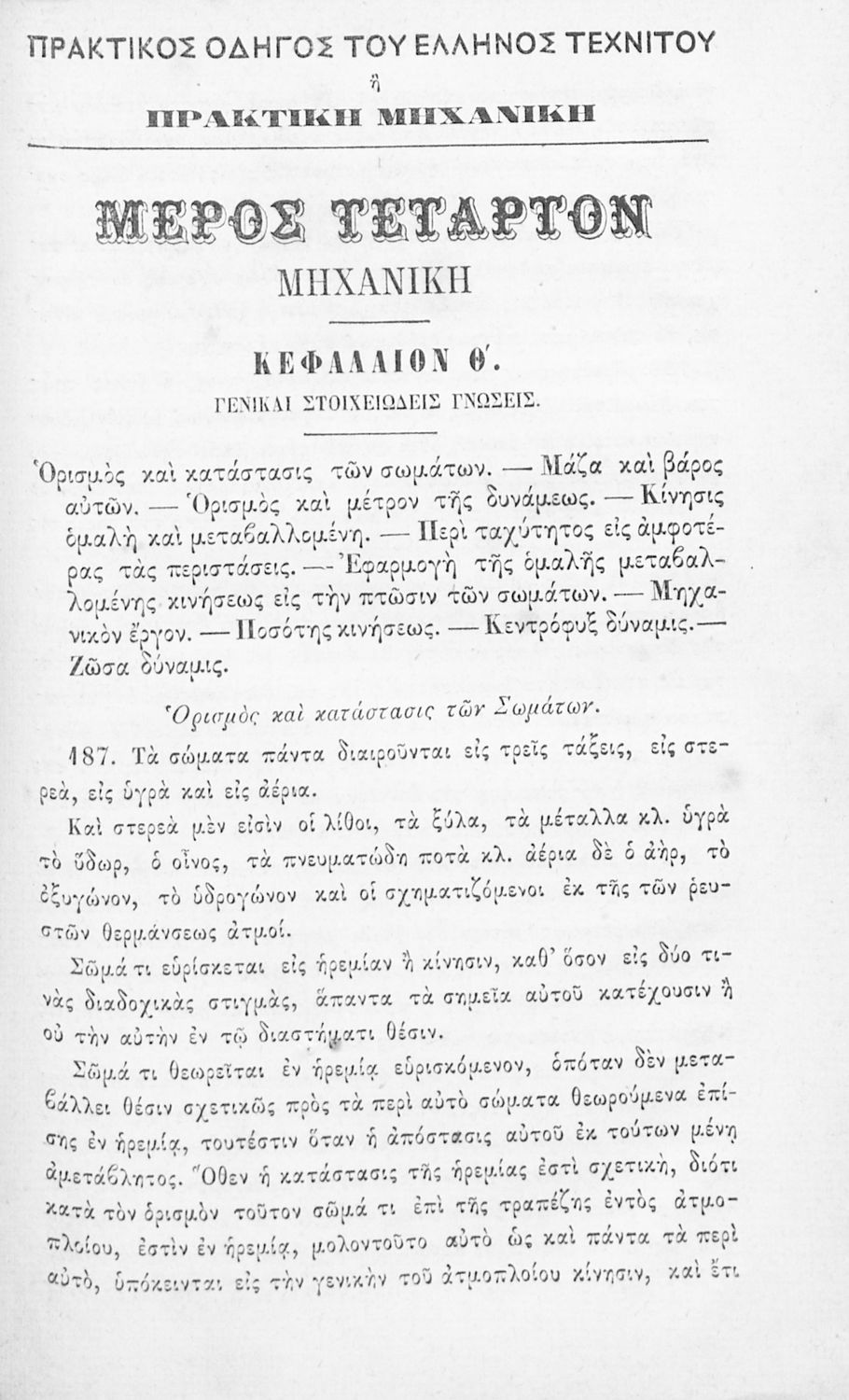 Εγχειρίδιο πρακτικής μηχανικής για τους Έλληνες τεχνίτες το οποίο περιέχει θεματικές Γεωμετρίας και Μηχανικής των σωμάτων καθώς και τρόπους υπολογισμού των δυνάμεων μεταξύ των σωμάτων.