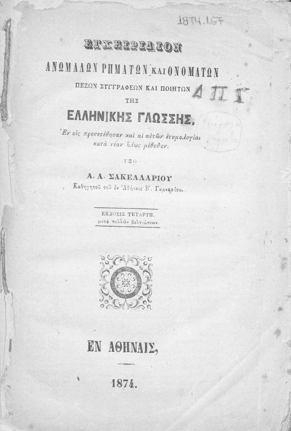 Έτος έκδοσης: 1874 Τόπος έκδοσης: Αθήνα Έκδοση: 4η |