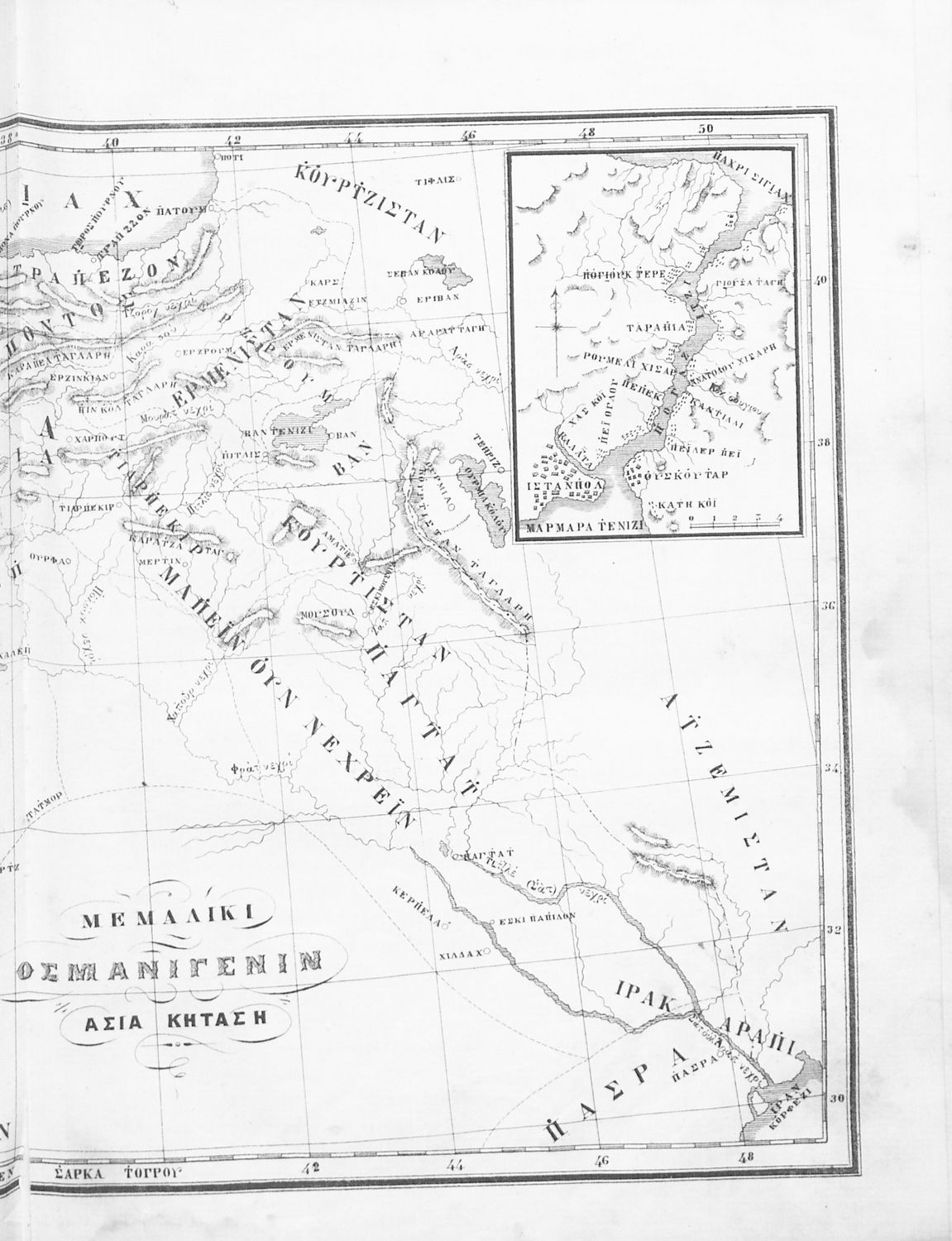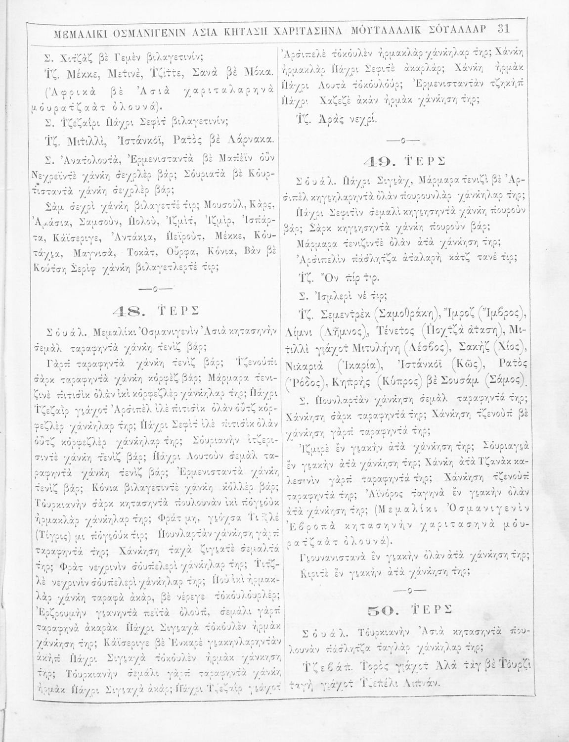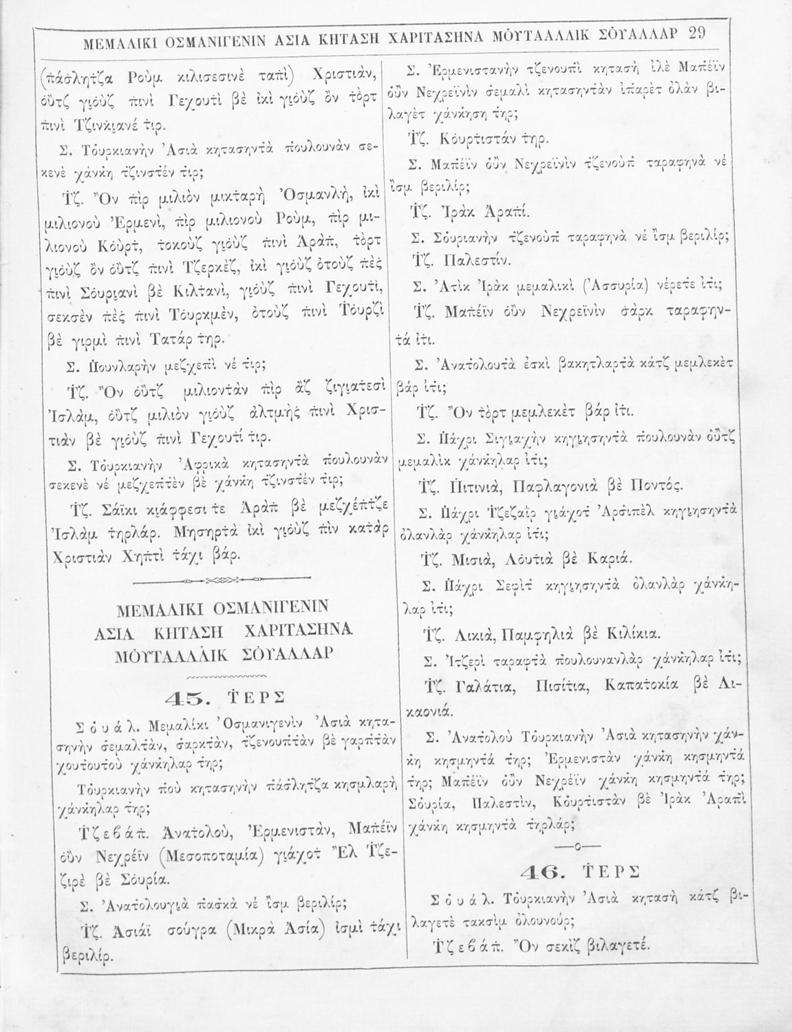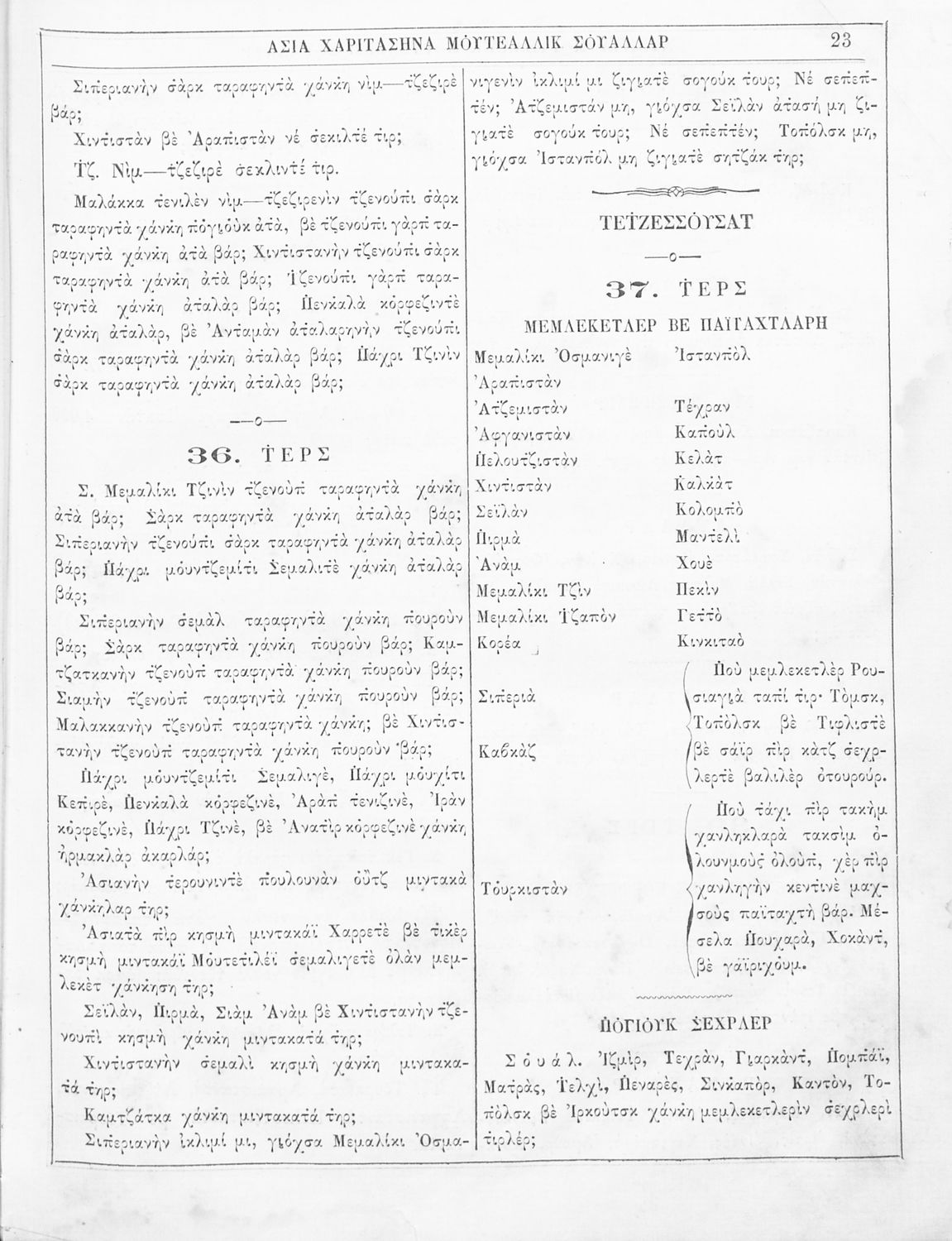 Μάθημα: Γεωγραφία Γλώσσα: Καραμανλίδικα Παρουσίαση περιεχομένου: Σχολικό εγχειρίδιο Γεωγραφίας για τους μαθητές της εθνοτικής ομάδας των “καραμανλίδων” (τουρκόφωνοι χριστιανοί ορθόδοξοι της Οθωμανικής αυτοκρατορίας). Το βιβλίο κάνει μια γενική επισκόπηση της παγκόσμιας φυσικής γεωγραφίας καθώς και της ανθρωπογεωγραφίας παρουσιάζοντας τις διαφορετικές φυλές του πλανήτη. |