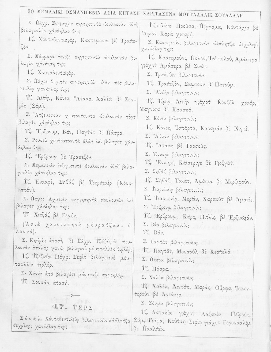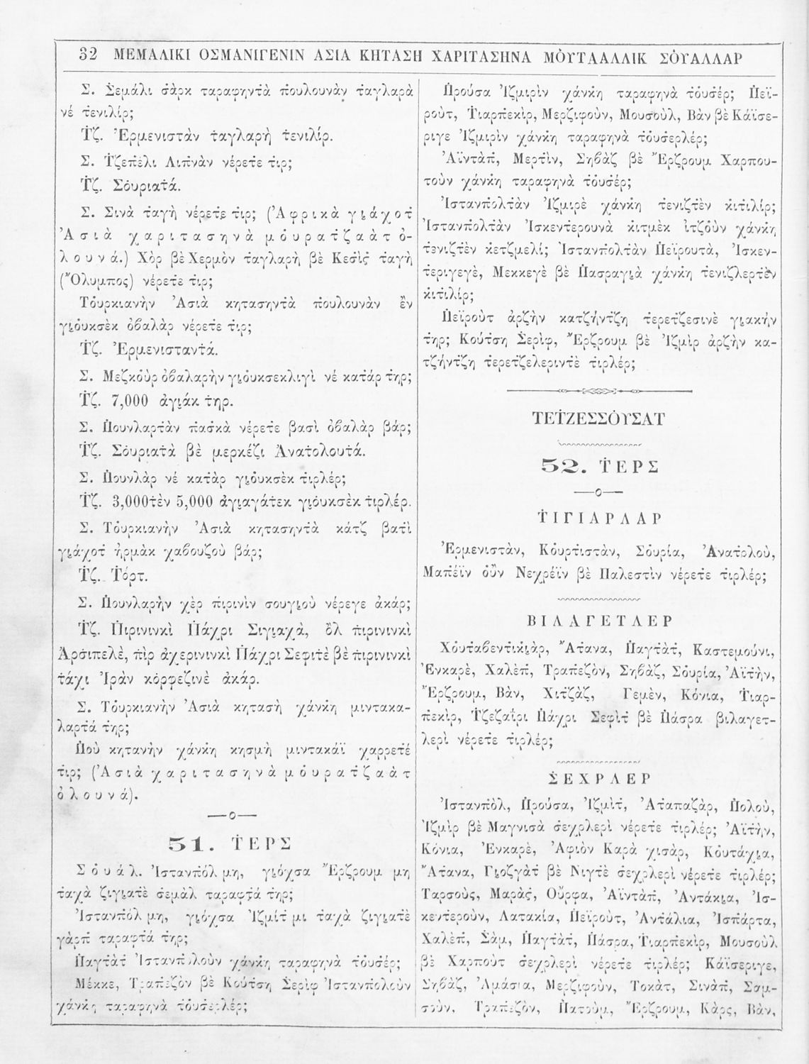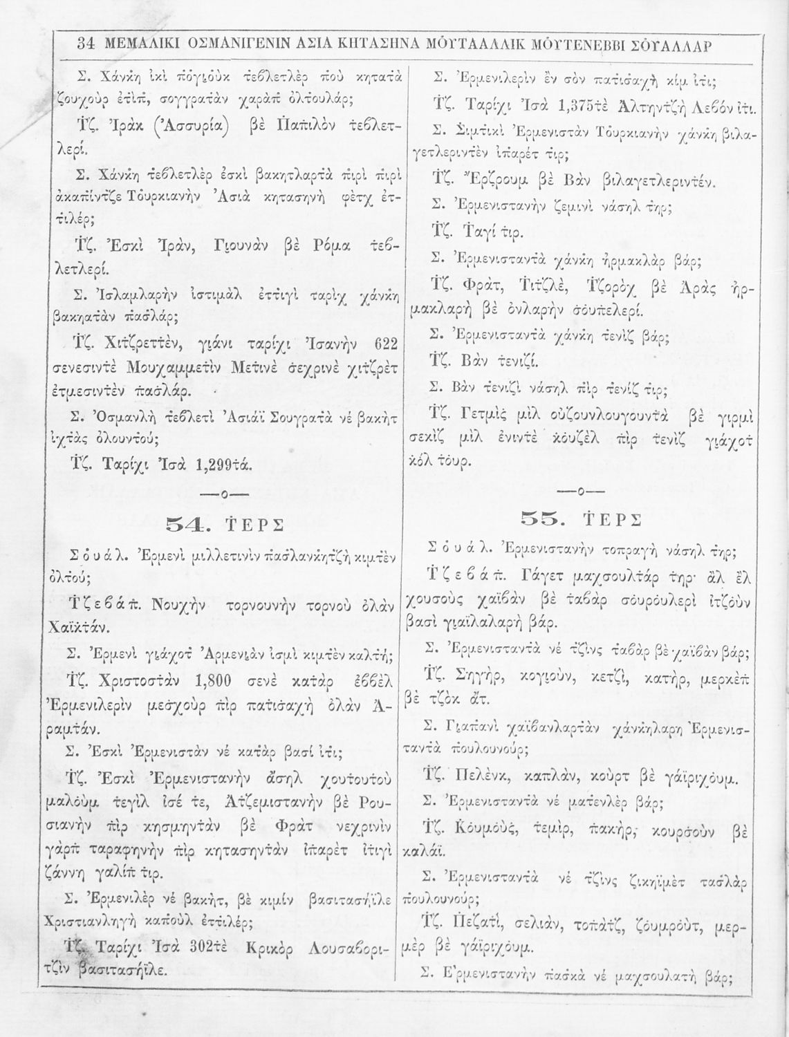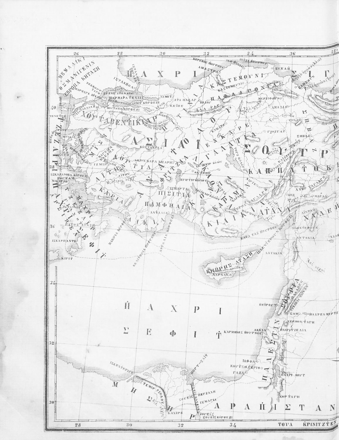 Μάθημα: Γεωγραφία Γλώσσα: Καραμανλίδικα Παρουσίαση περιεχομένου: Σχολικό εγχειρίδιο Γεωγραφίας για τους μαθητές της εθνοτικής ομάδας των “καραμανλίδων” (τουρκόφωνοι χριστιανοί ορθόδοξοι της Οθωμανικής αυτοκρατορίας). Το βιβλίο κάνει μια γενική επισκόπηση της παγκόσμιας φυσικής γεωγραφίας καθώς και της ανθρωπογεωγραφίας παρουσιάζοντας τις διαφορετικές φυλές του πλανήτη. |