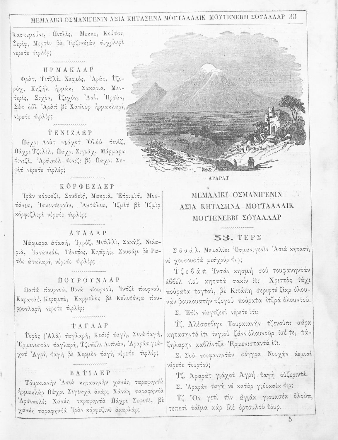 Σχολικό εγχειρίδιο Γεωγραφίας για τους μαθητές της εθνοτικής ομάδας των “καραμανλίδων” (τουρκόφωνοι χριστιανοί ορθόδοξοι της Οθωμανικής αυτοκρατορίας). Το βιβλίο κάνει μια γενική επισκόπηση της παγκόσμιας φυσικής γεωγραφίας καθώς και της ανθρωπογεωγραφίας παρουσιάζοντας τις διαφορετικές φυλές του πλανήτη.