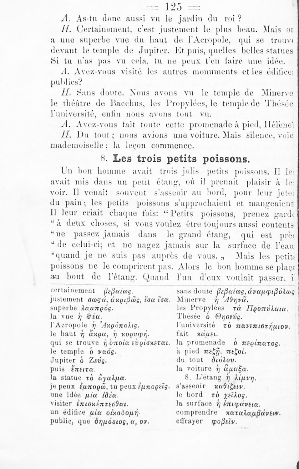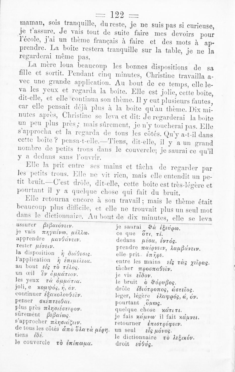 Πρόκειται για το Α΄ μέρος σχολικού εγχειριδίου το οποίο μέσα από μικρά αυτοτελή μαθήματα προοριζόταν για τη διδασκαλία του μαθήματος της Γαλλικής γλώσσας. Φέρει λίγες προσωπικές σημειώσεις του μαθητή.