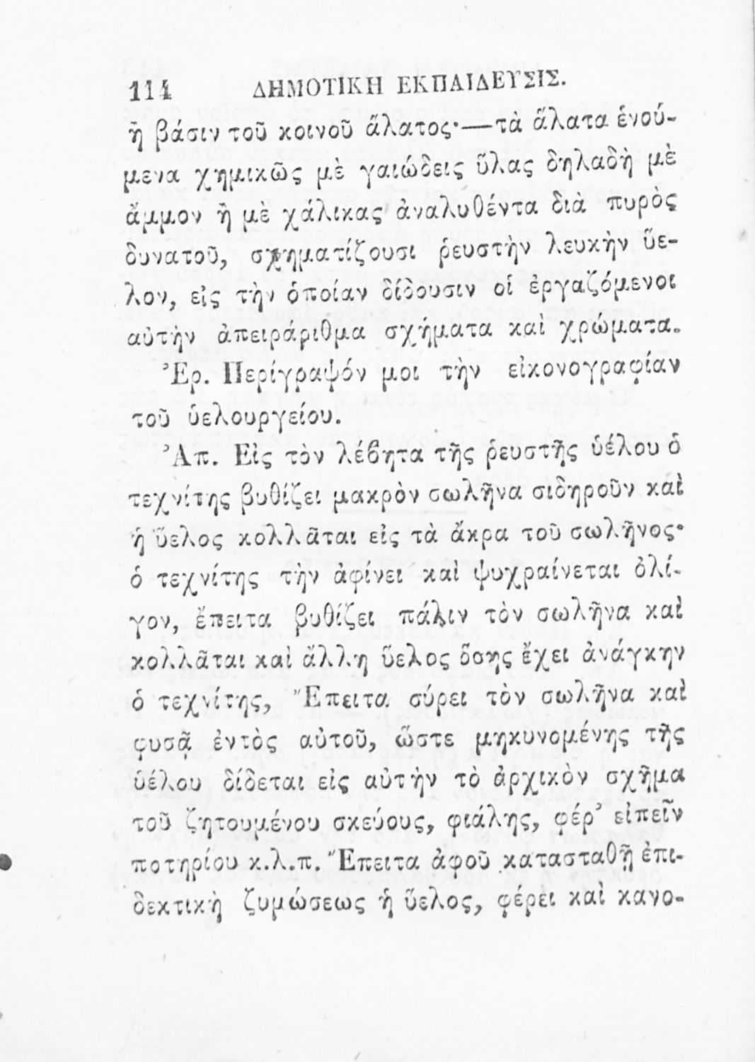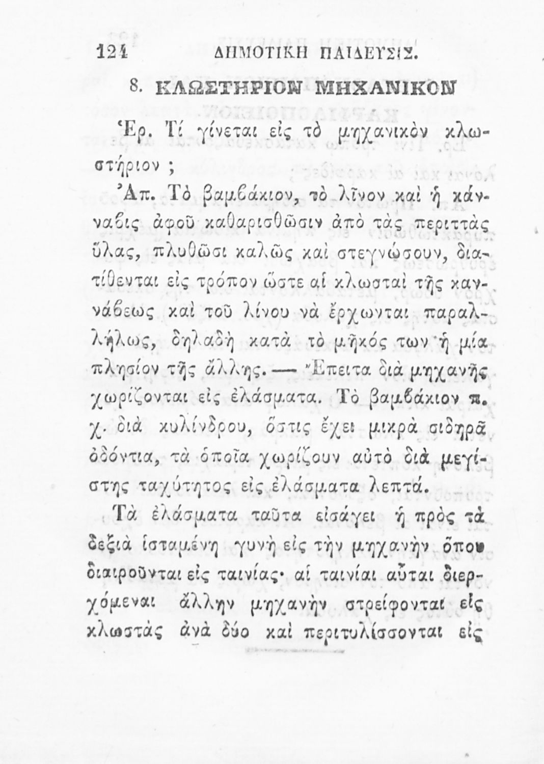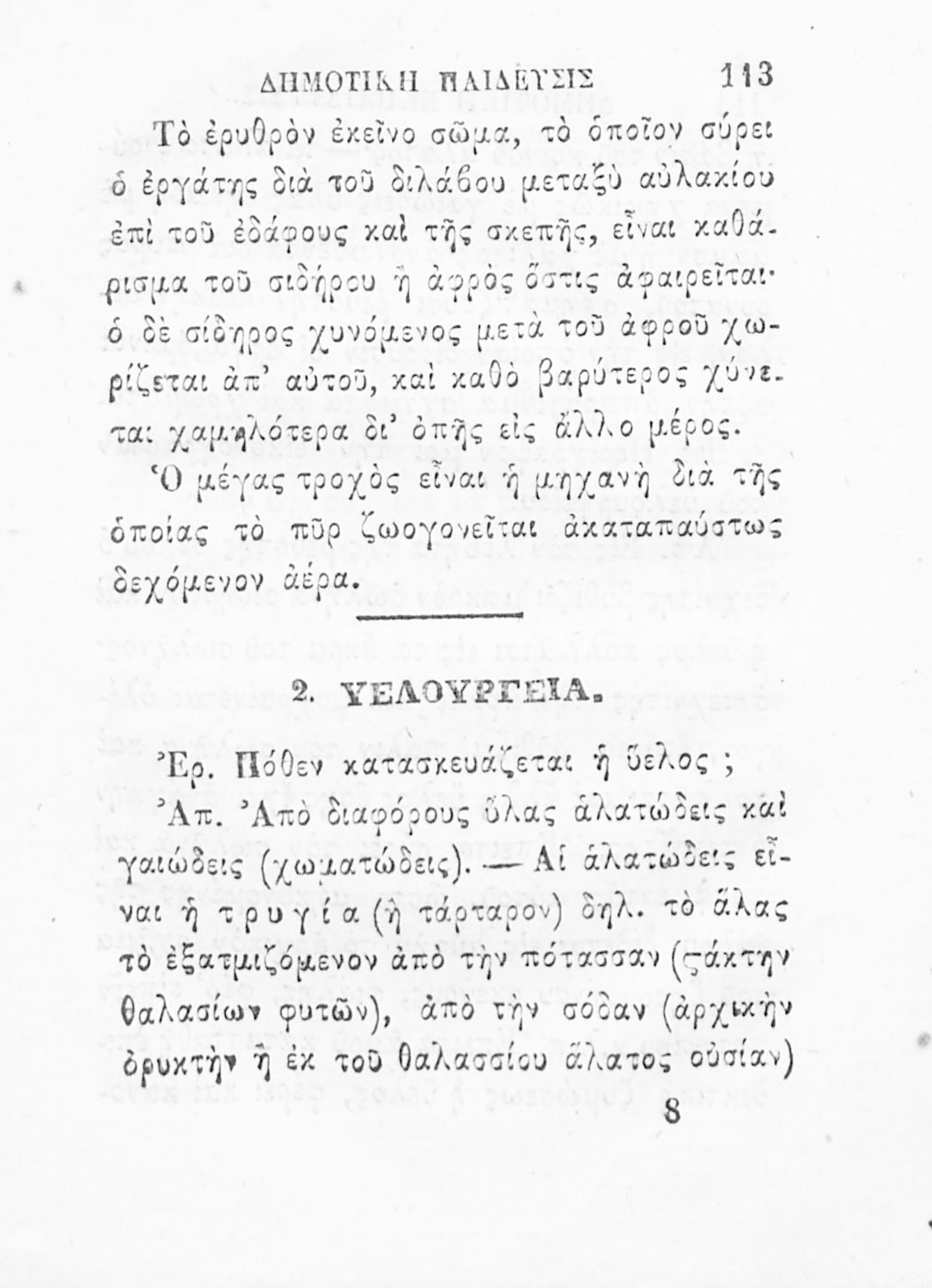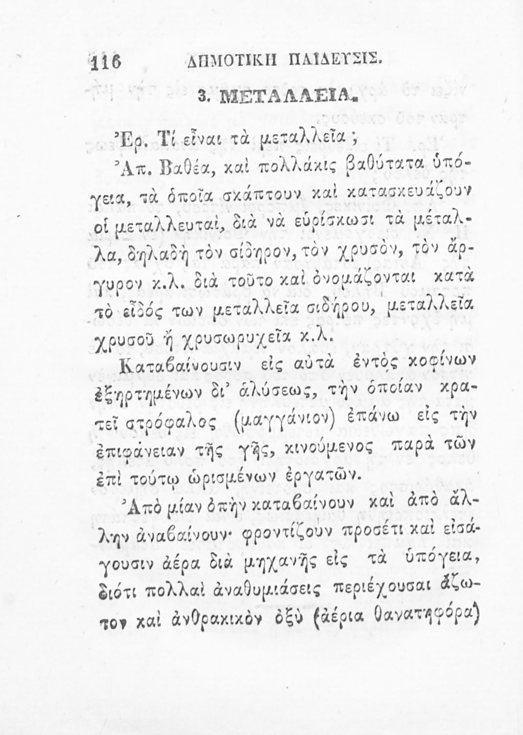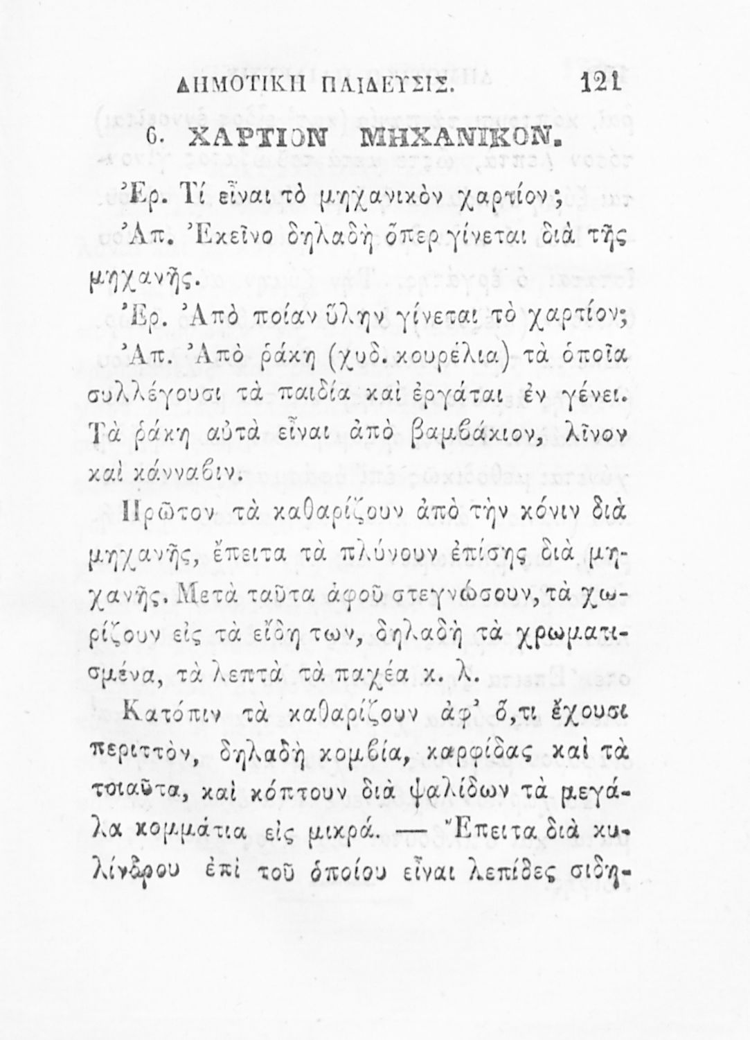 Αναγνωστικό Δημοτικού που έχει τη μορφή ερωταποκρίσεων και παρουσιάζει βασικές πληροφορίες για ένα μεγάλο εύρος ζητημάτων από τα ζώα, τα φυτά και τα χαρακτηριστικά τους ως τη σιδηρουργία και τη στενογραφία.
