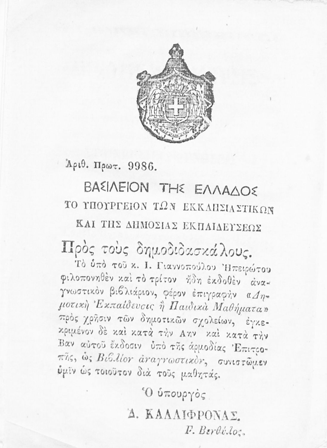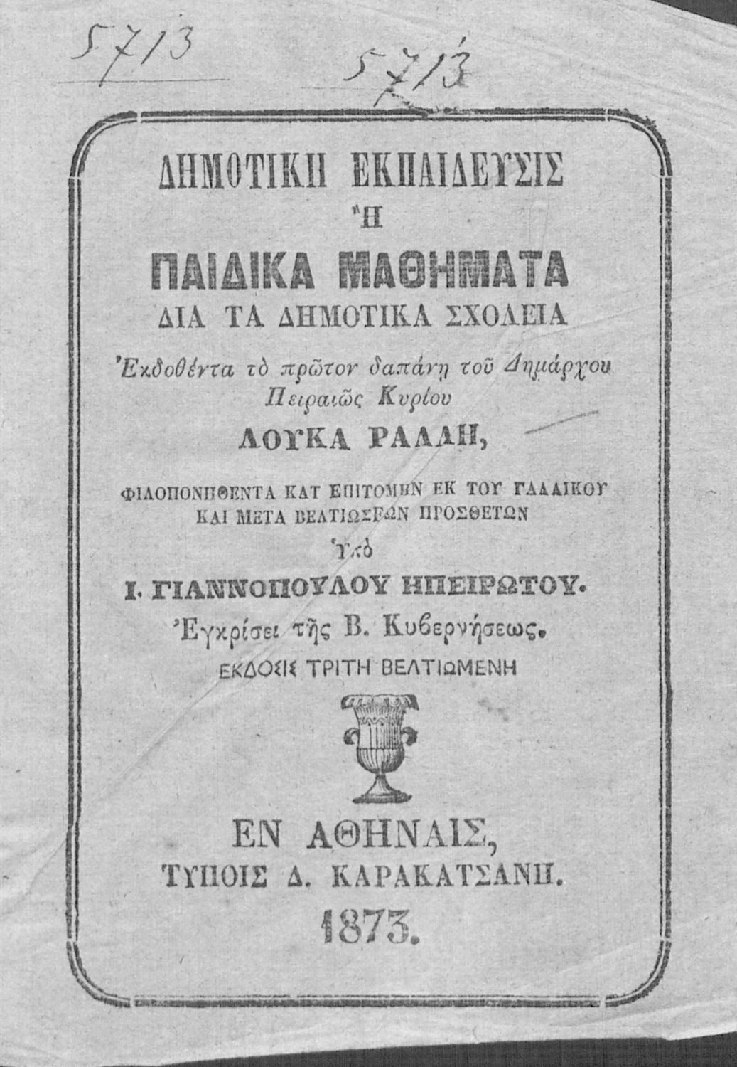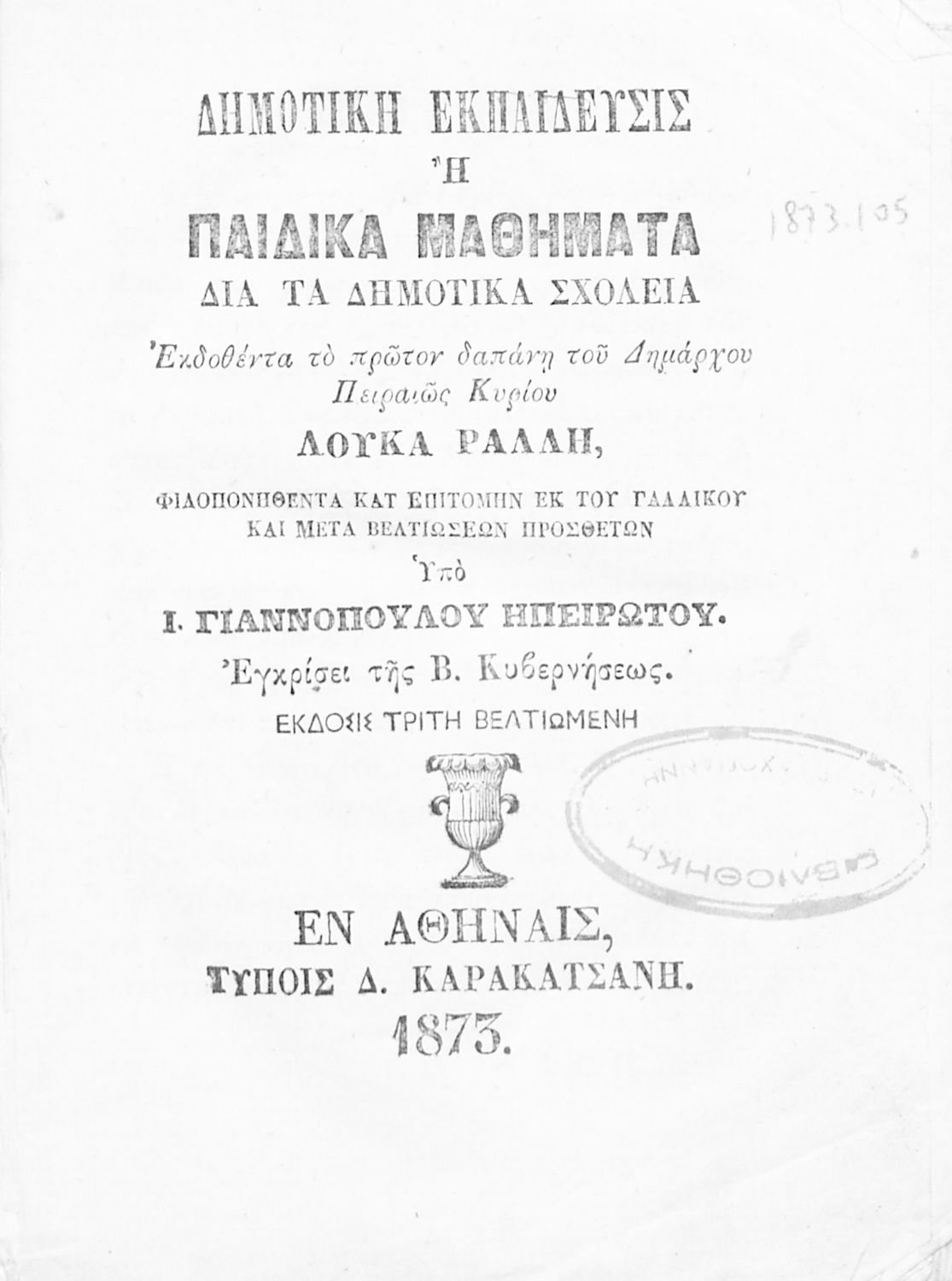 Τίτλος: Δημοτική εκπαίδευσις ή παιδικά μαθήματα δια τα Δημοτικά σχολεία