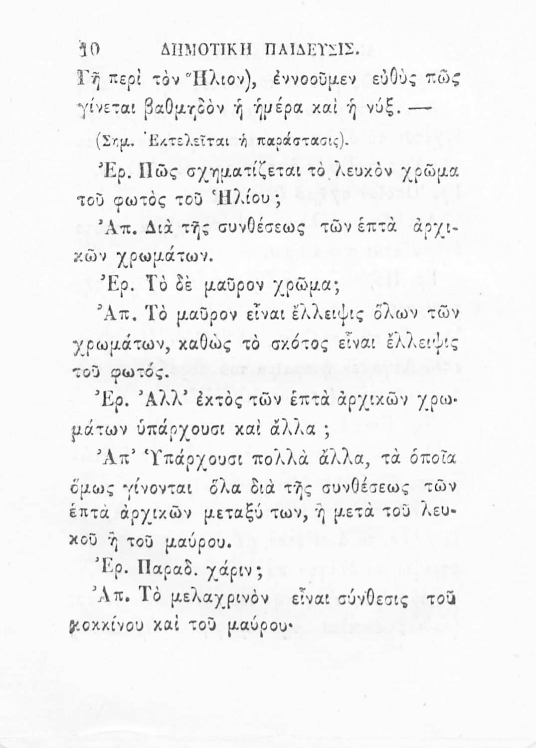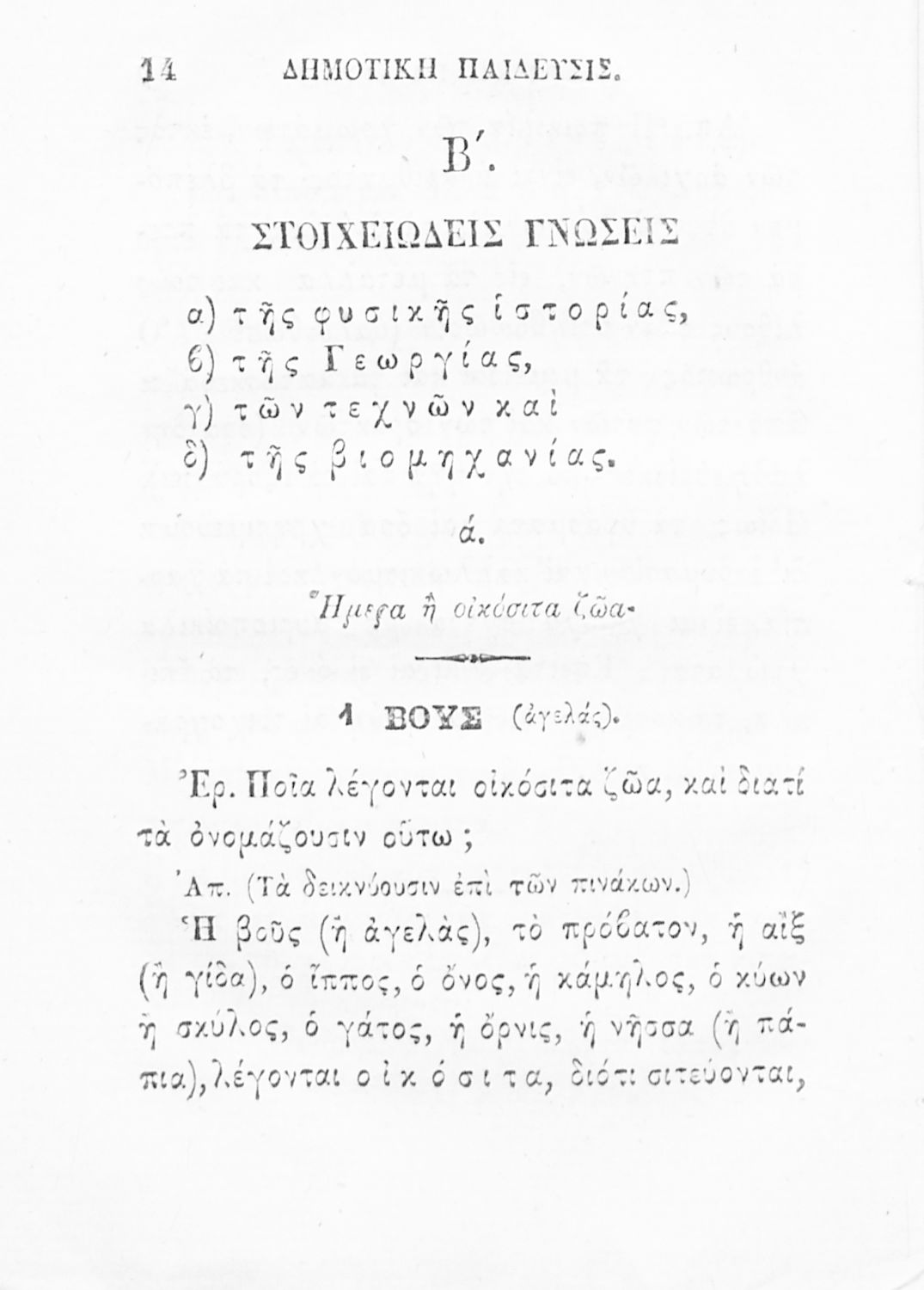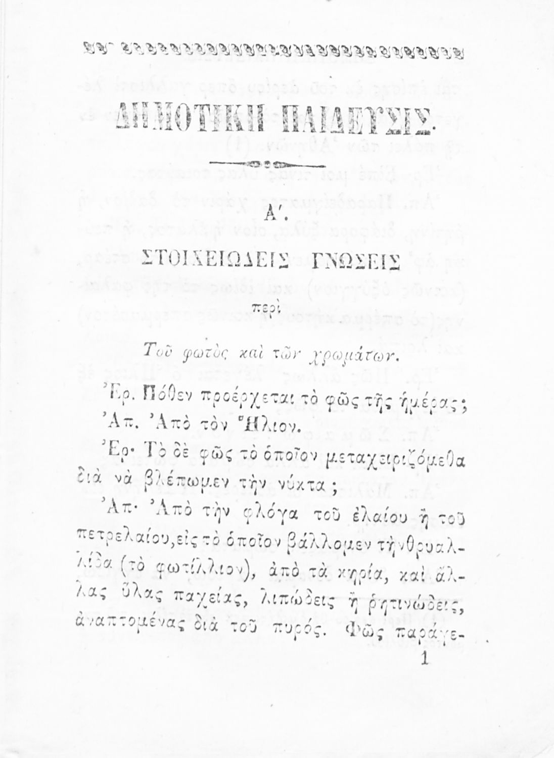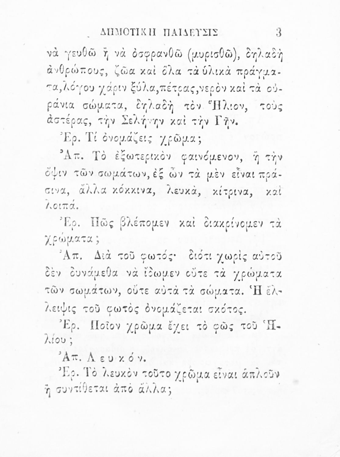 Αναγνωστικό Δημοτικού που έχει τη μορφή ερωταποκρίσεων και παρουσιάζει βασικές πληροφορίες για ένα μεγάλο εύρος ζητημάτων από τα ζώα, τα φυτά και τα χαρακτηριστικά τους ως τη σιδηρουργία και τη στενογραφία.
