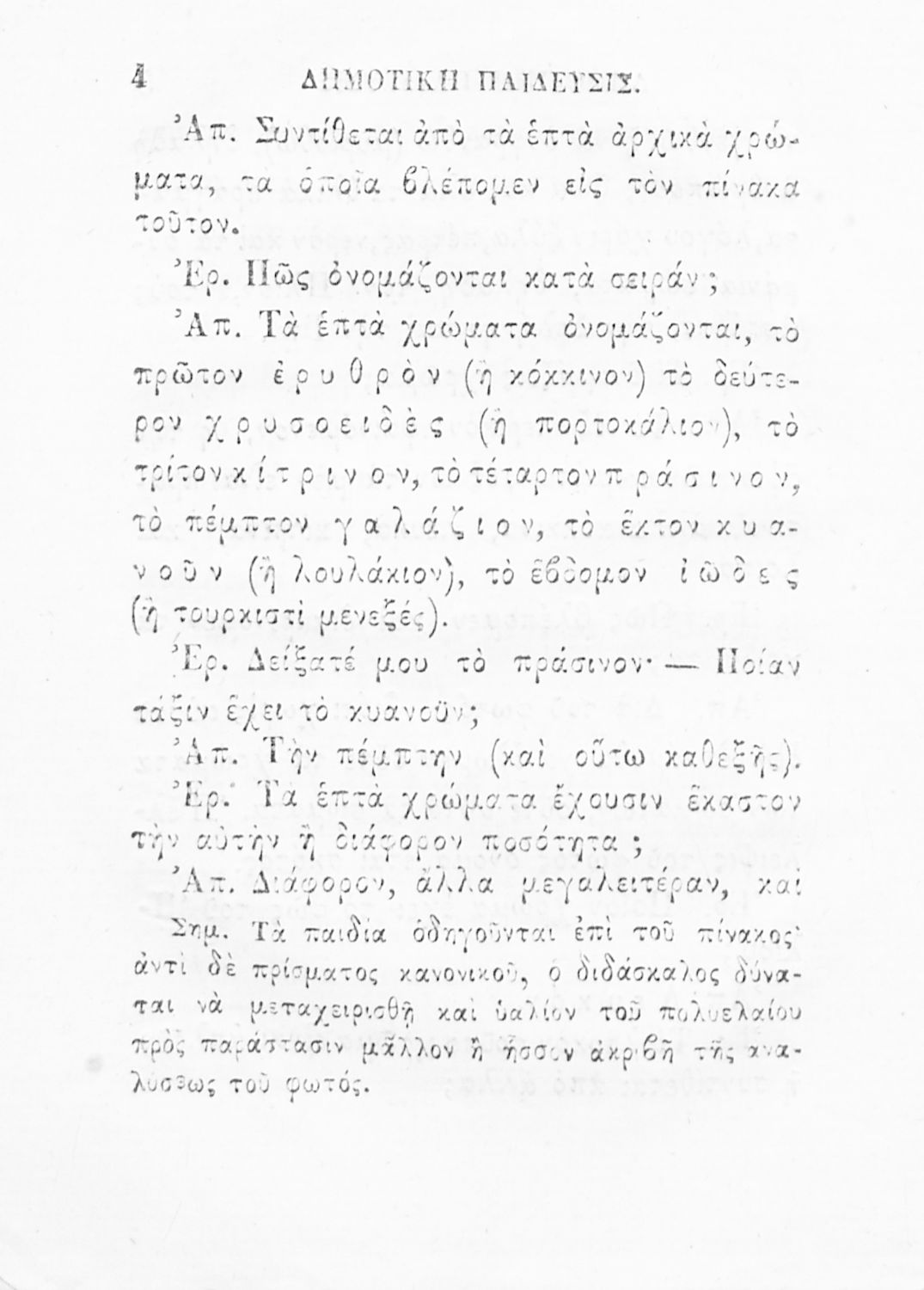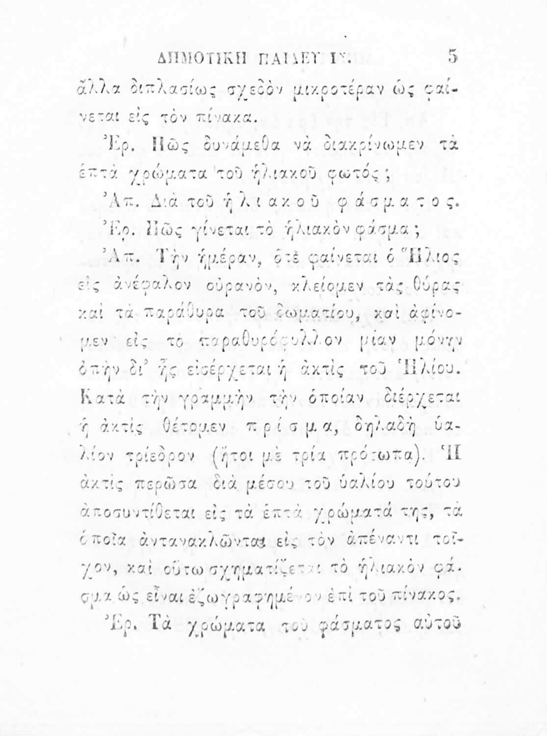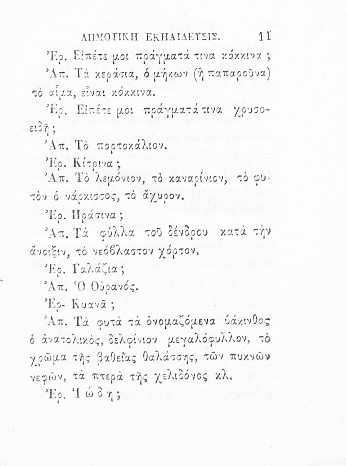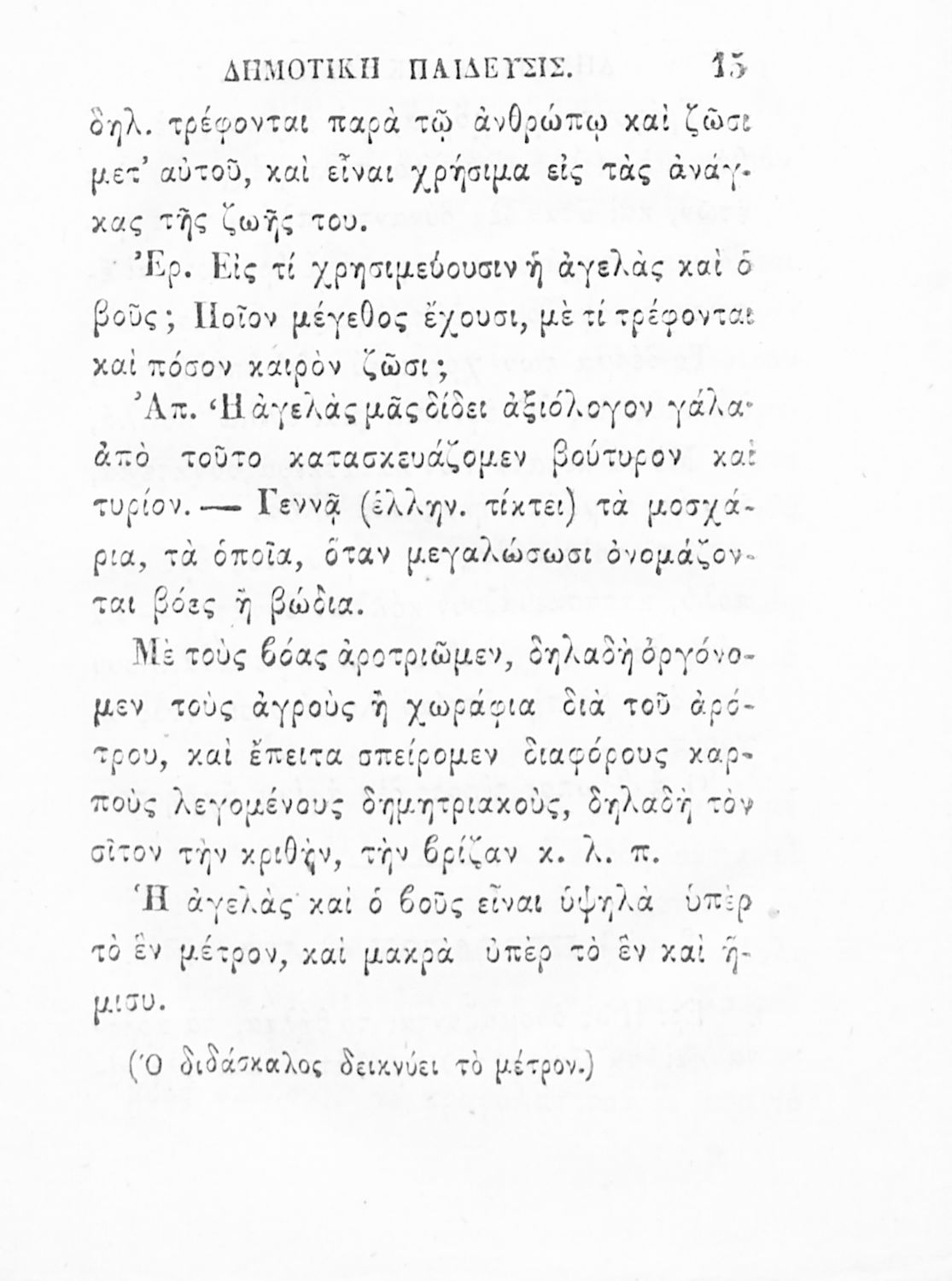 Αναγνωστικό Δημοτικού που έχει τη μορφή ερωταποκρίσεων και παρουσιάζει βασικές πληροφορίες για ένα μεγάλο εύρος ζητημάτων από τα ζώα, τα φυτά και τα χαρακτηριστικά τους ως τη σιδηρουργία και τη στενογραφία.