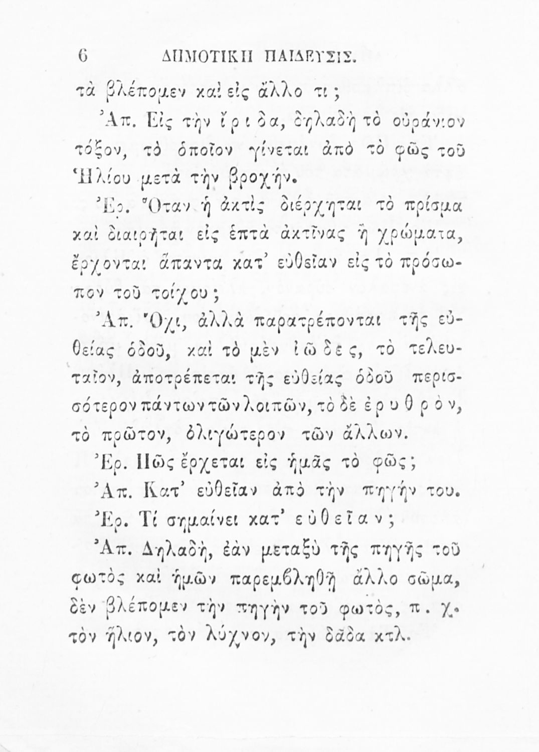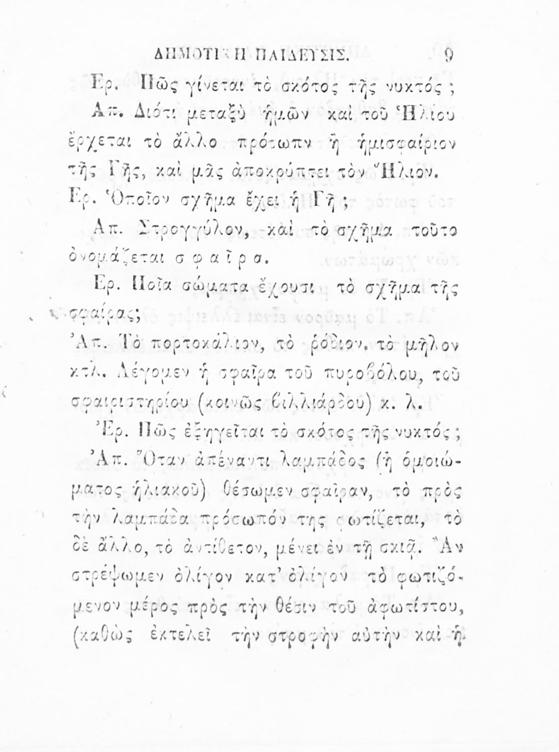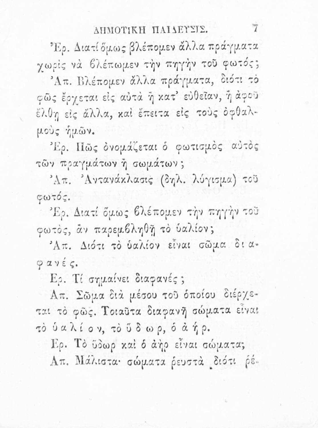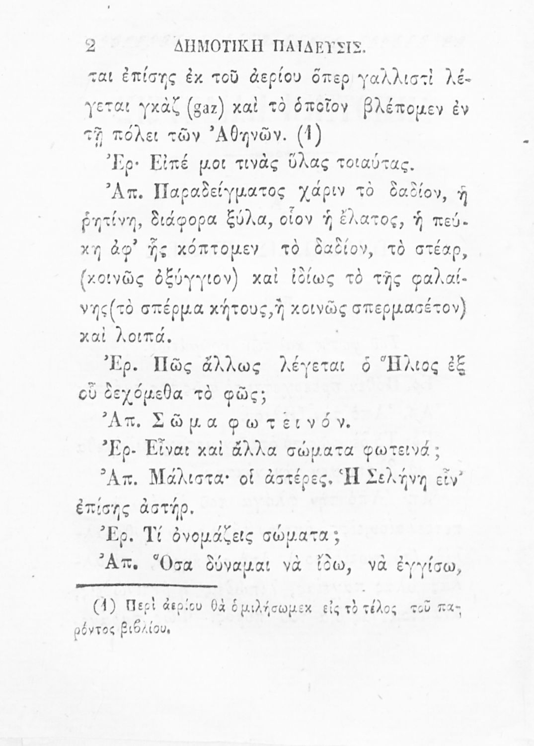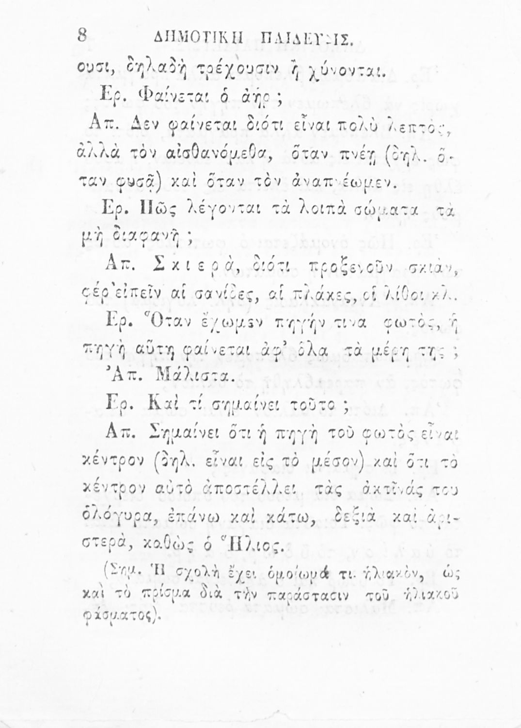 Αναγνωστικό Δημοτικού που έχει τη μορφή ερωταποκρίσεων και παρουσιάζει βασικές πληροφορίες για ένα μεγάλο εύρος ζητημάτων από τα ζώα, τα φυτά και τα χαρακτηριστικά τους ως τη σιδηρουργία και τη στενογραφία.