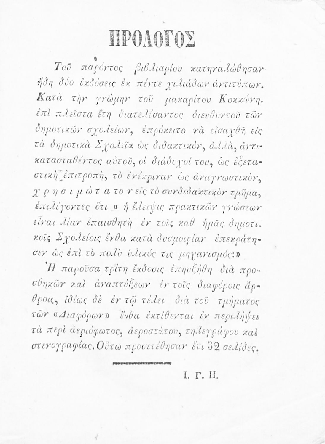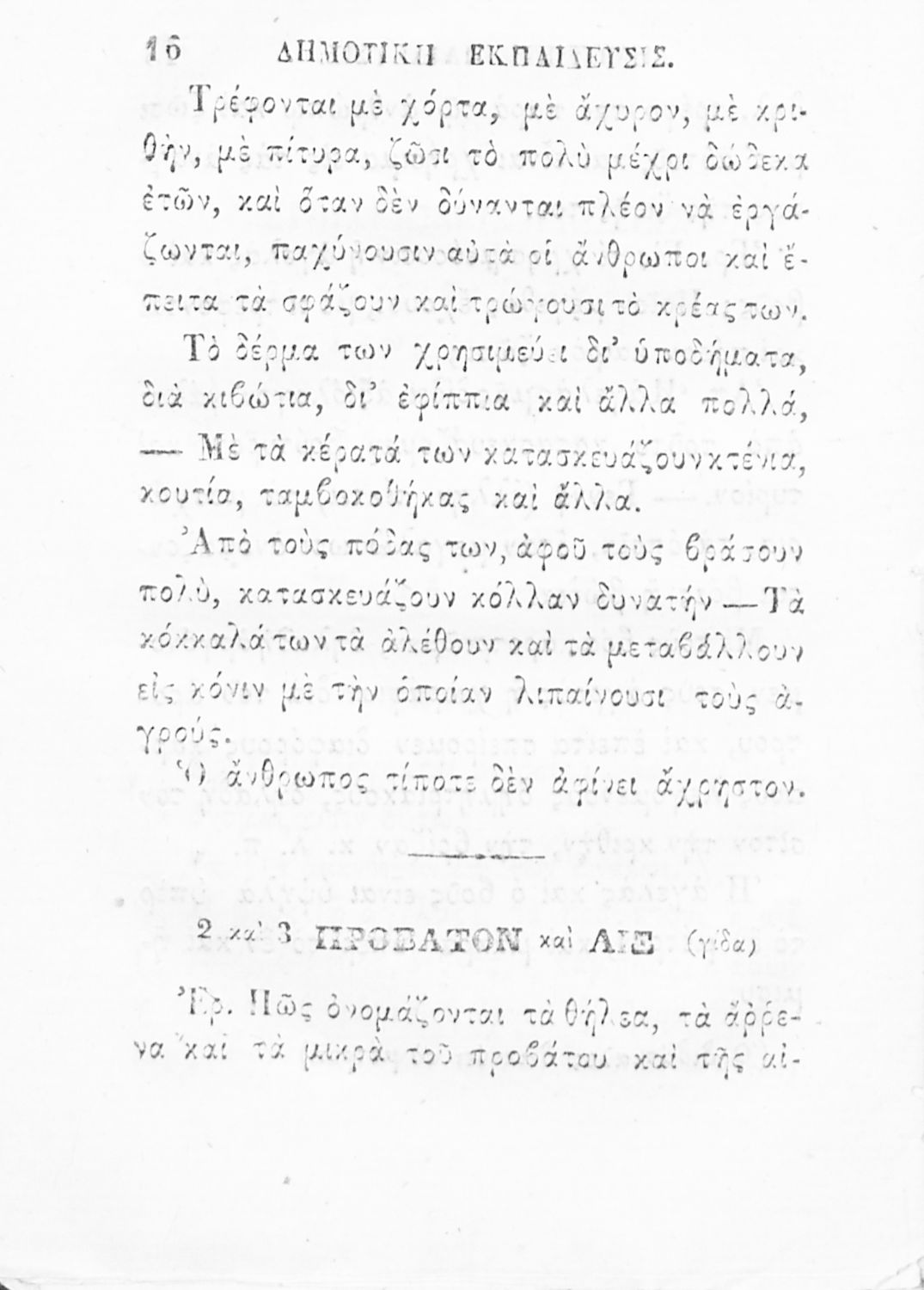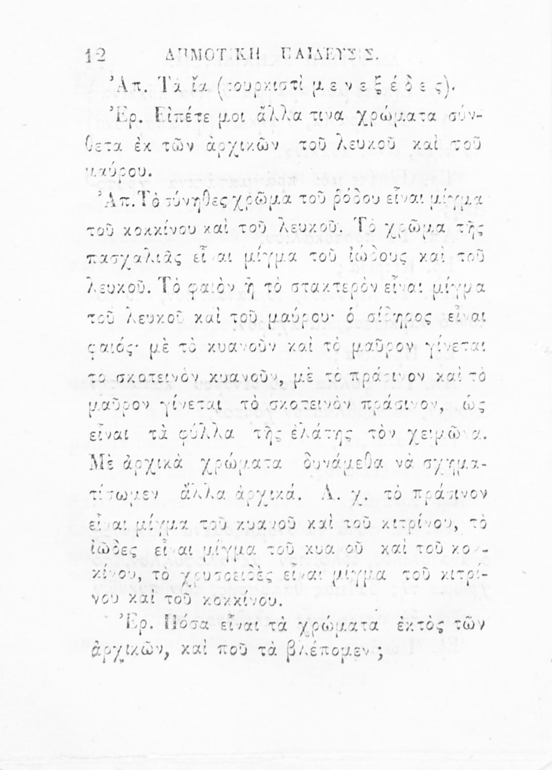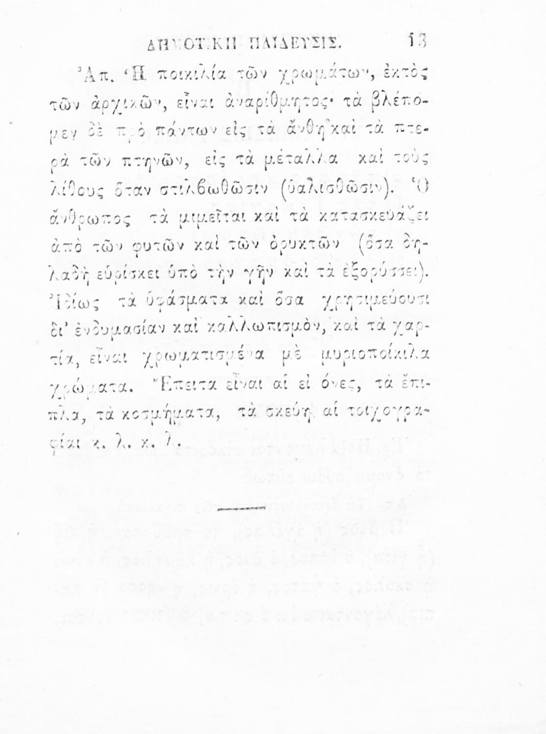 Αναγνωστικό Δημοτικού που έχει τη μορφή ερωταποκρίσεων και παρουσιάζει βασικές πληροφορίες για ένα μεγάλο εύρος ζητημάτων από τα ζώα, τα φυτά και τα χαρακτηριστικά τους ως τη σιδηρουργία και τη στενογραφία.