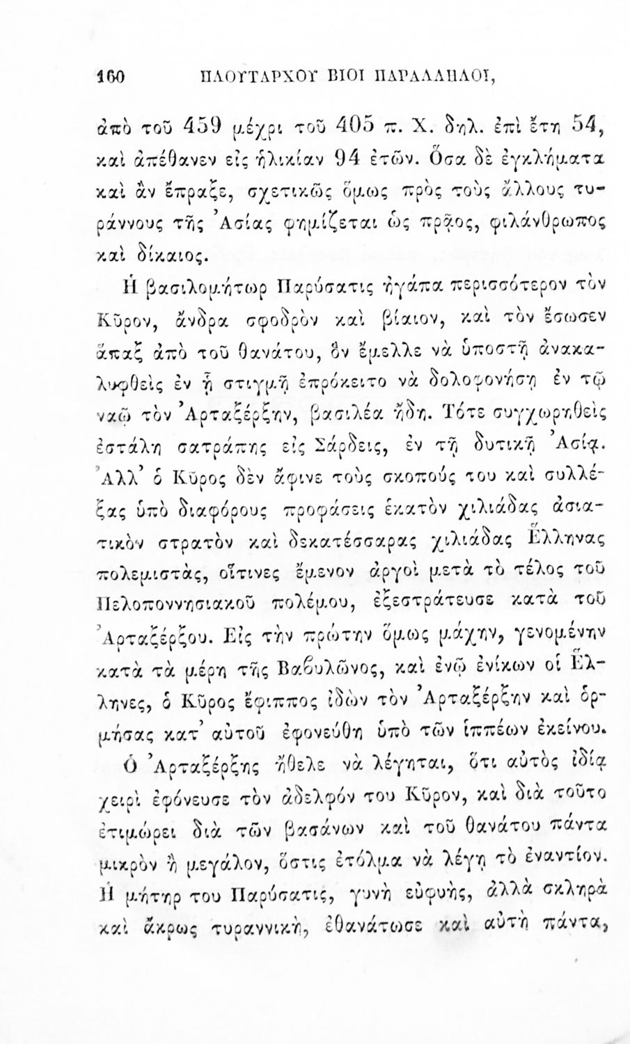 Σχολικό εγχειρίδιο Αρχαίων Ελληνικών για τις Β΄ Γυμνασίου και Γ΄ Αστικού Σχολείου που περιλαμβάνει αποσπάσματα από το έργο του Πλούταρχου Βίοι Παράλληλοι και ερμηνευτικά και πραγματολογικά σχόλια.