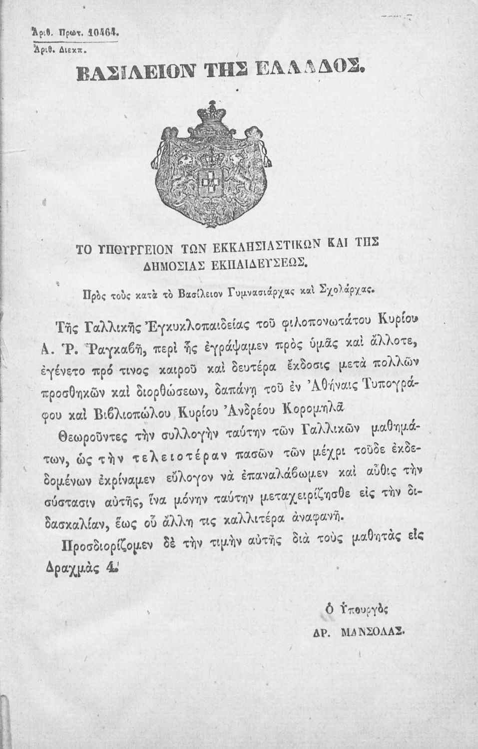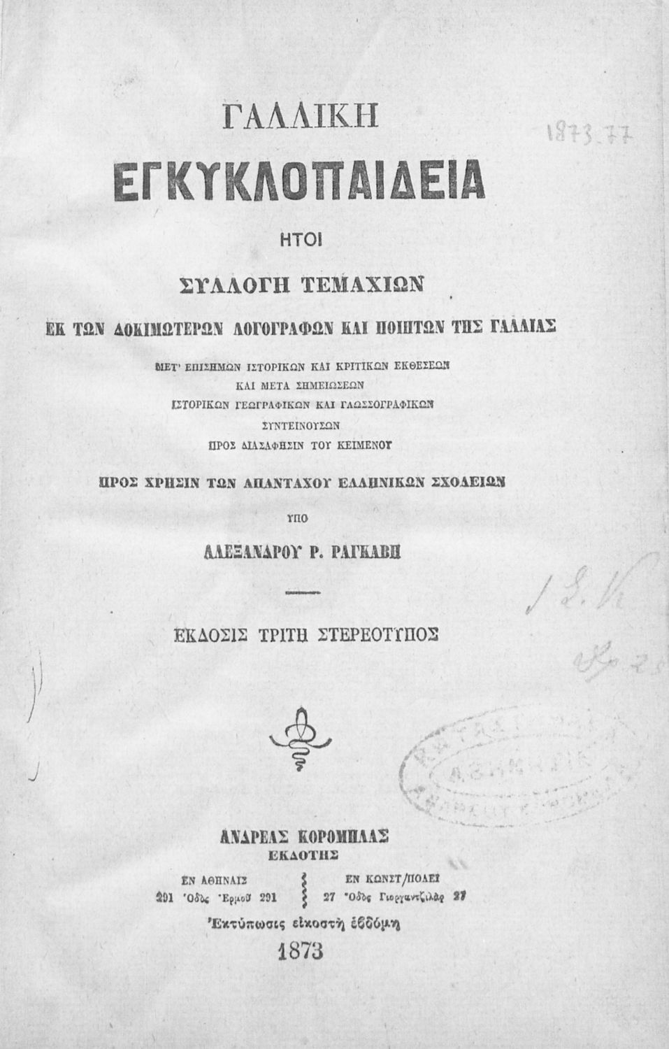 Εκδότης: Ανδρέας Κορομηλάς Έτος έκδοσης: 1873 Τόπος έκδοσης: Αθήνα Έκδοση: 3η Υπουργική απόφαση / Σύμβαση: 10464/ |