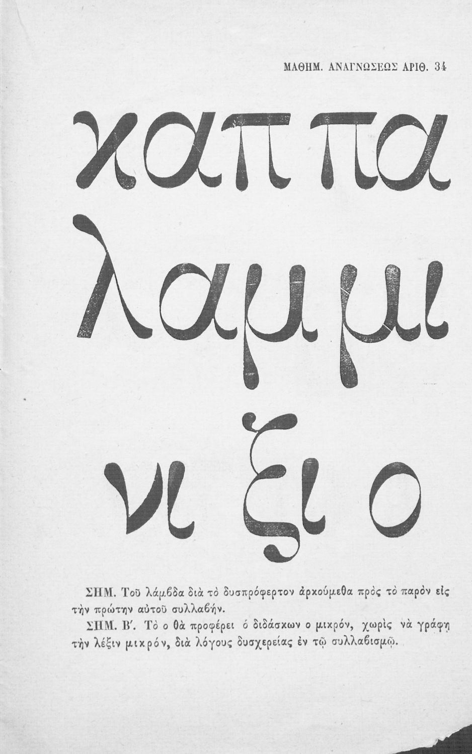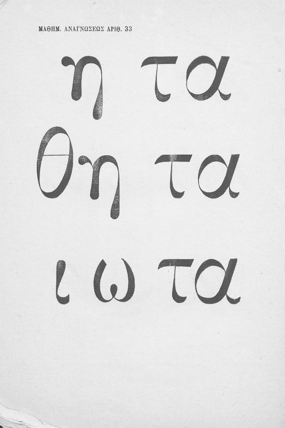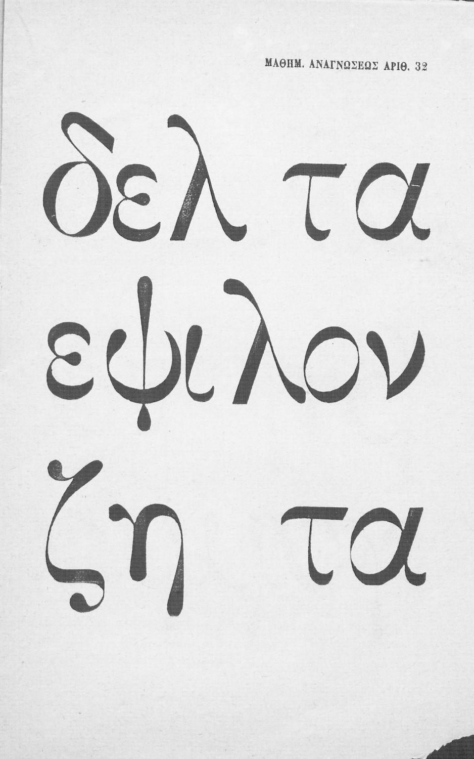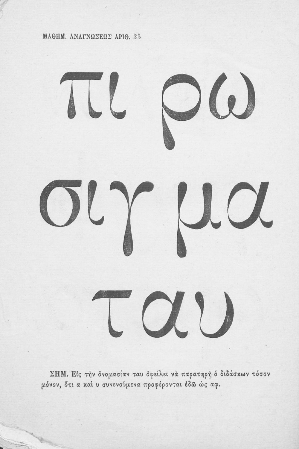 Αναγνωστικό Α΄ Δημοτικού που περιέχει γράμματα, συλλαβές, λέξεις, προτάσεις και κείμενα εμπνευσμένα από την οικογενειακή και κοινωνική ζωή του τόπου. Φέρει το σύμβολο της δικτατορίας.