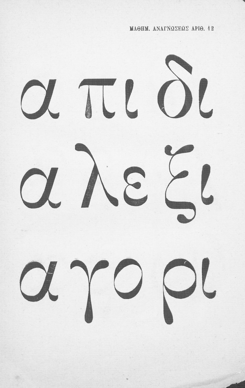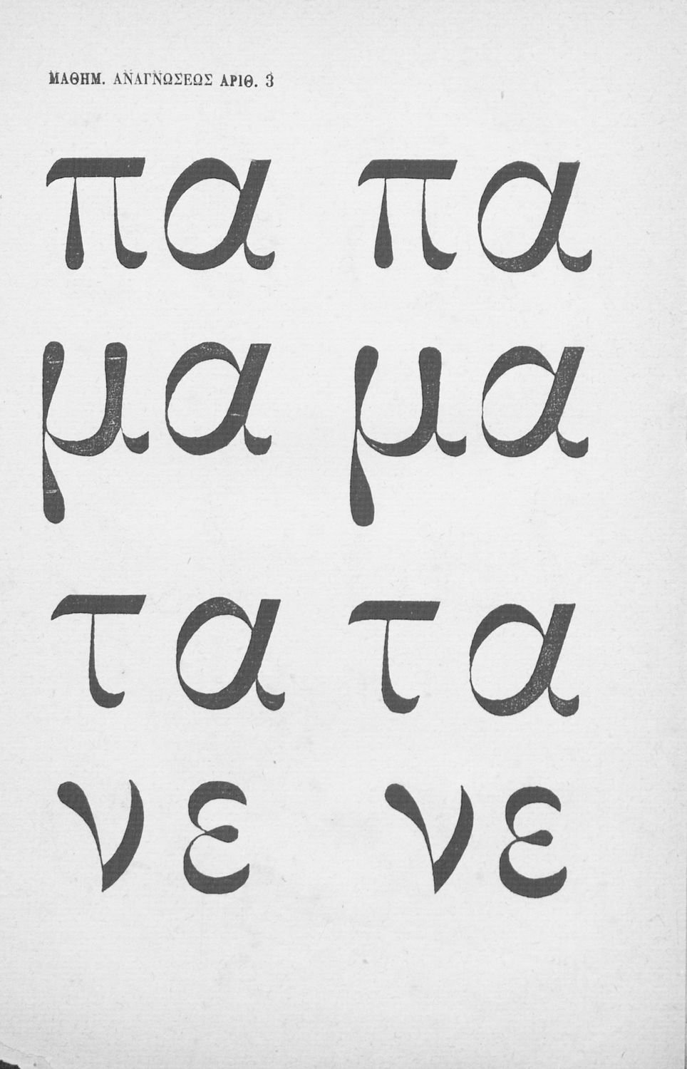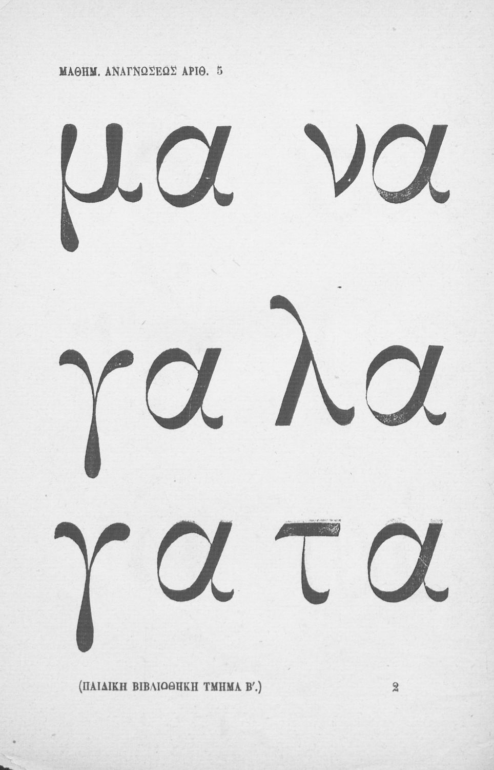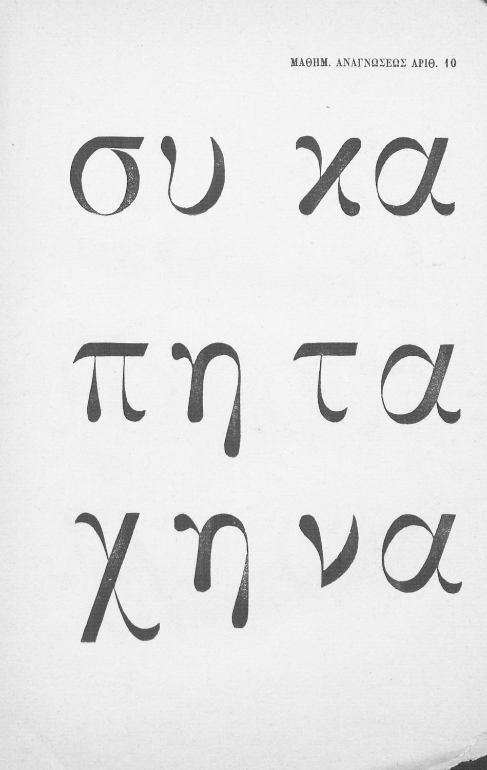 Αναγνωστικό Α΄ Δημοτικού που περιέχει γράμματα, συλλαβές, λέξεις, προτάσεις και κείμενα εμπνευσμένα από την οικογενειακή και κοινωνική ζωή του τόπου. Φέρει το σύμβολο της δικτατορίας.